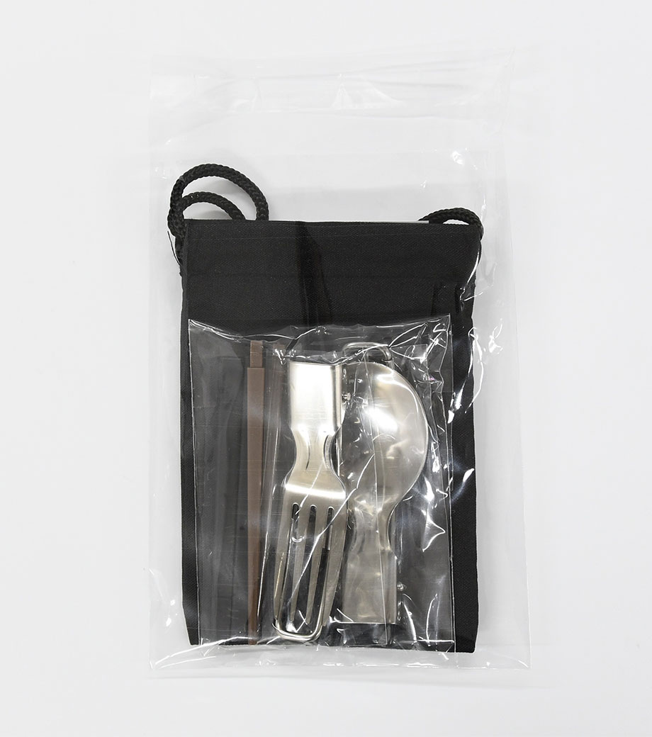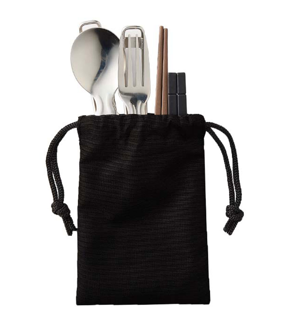 巾着にシンプルな1色印刷、スプーンまたはフォークの柄に高級感のあるレーザー彫刻で名入れできます。飲食店の周年記念品はもちろん、アウトドアショップの購入特典や防災イベントの参加特典などにもピッタリなノベルティです。