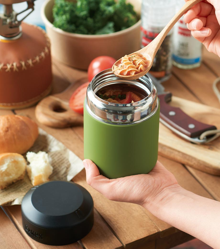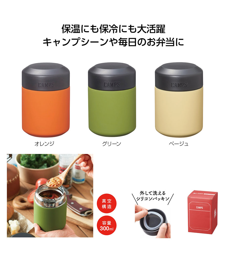 キャンプス 保冷温フードジャーは温かいスープやおかず、冷たいデザートを入れるのに丁度良い約300mlサイズ。真空二重構造のため中身の温度が外に伝わりにくく、美味しい温度を長時間キープしてくれます。毎日のお弁当のお供にはもちろん、キャンプやピクニックにも持っていけますよ。