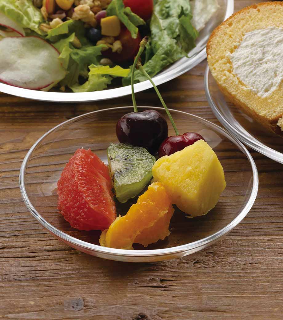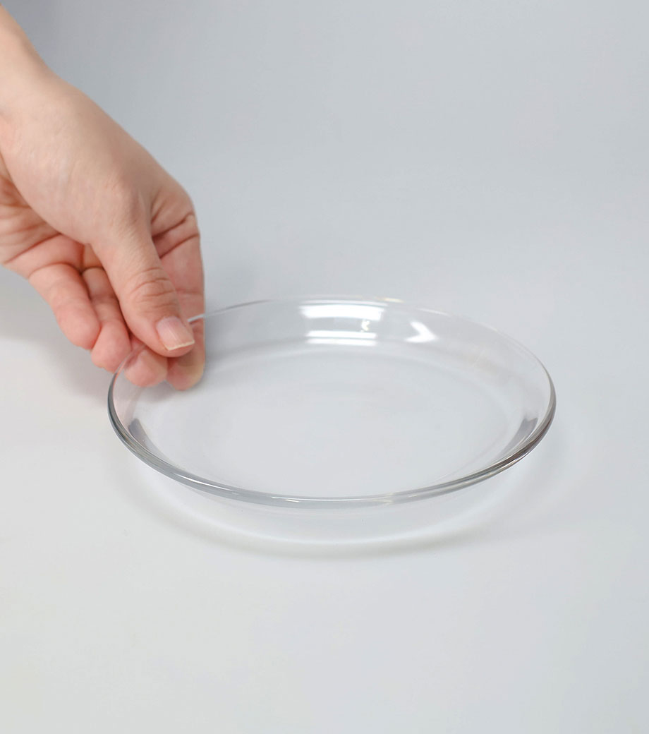 シンプルなガラス製のクリアプレート。デザートやフルーツの盛り付けにちょうどいい直径12cmサイズ。日常使いから来客時まで幅広く活躍します。透明感のあるガラス素材が料理やスイーツの色合いを引き立て、和・洋・中を問わずさまざまなシーンに自然となじみます。重ねて収納できるため省スペースで保管できるのも嬉しいポイント。アクセサリーや小物のディスプレイ用としてもおすすめです。
