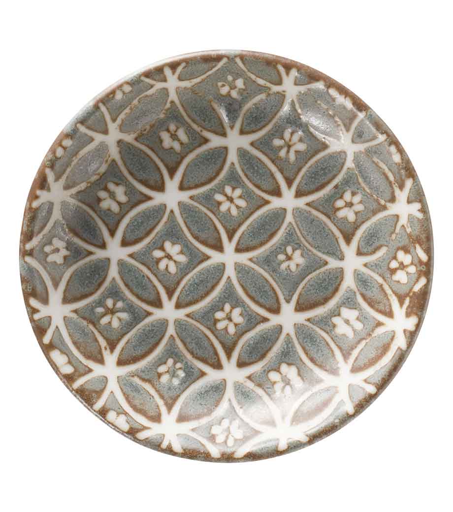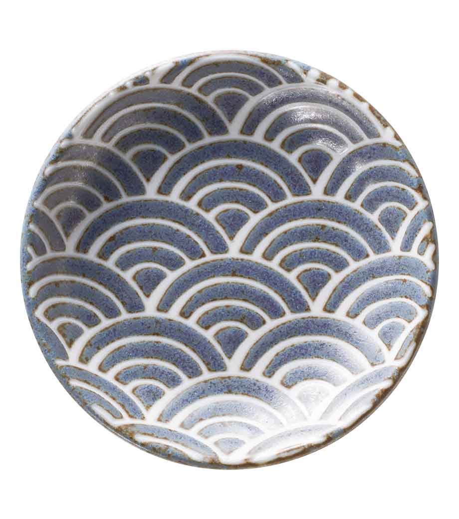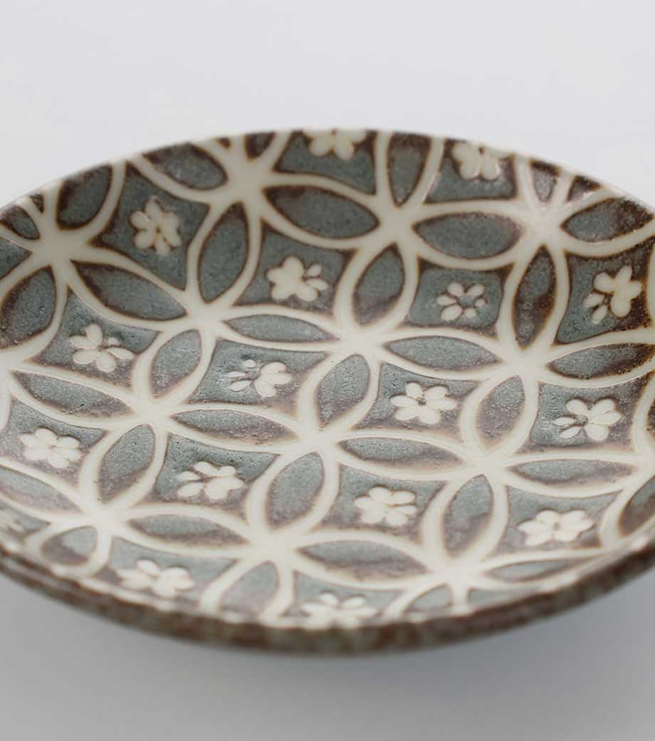 日本の伝統工芸、美濃焼の豆皿2枚セット。青海波と花七宝文様が、立体的に浮かび上がる技法でデザインされています。醤油皿や薬味皿としてはもちろん、ジャムやバターの器として和洋食問わずお使いいただけます。