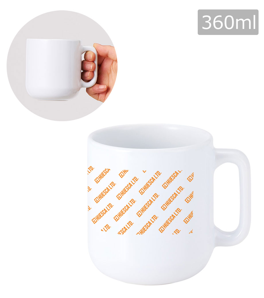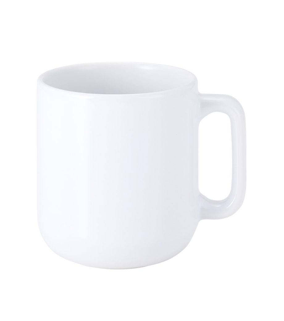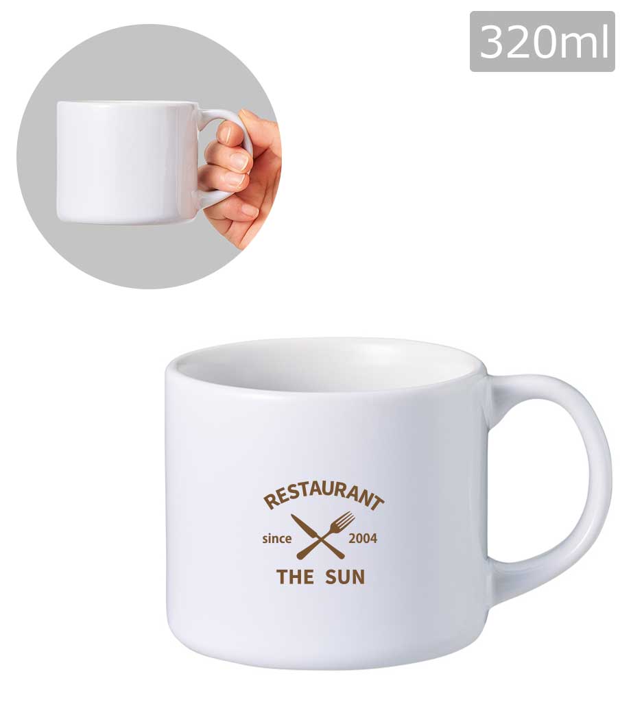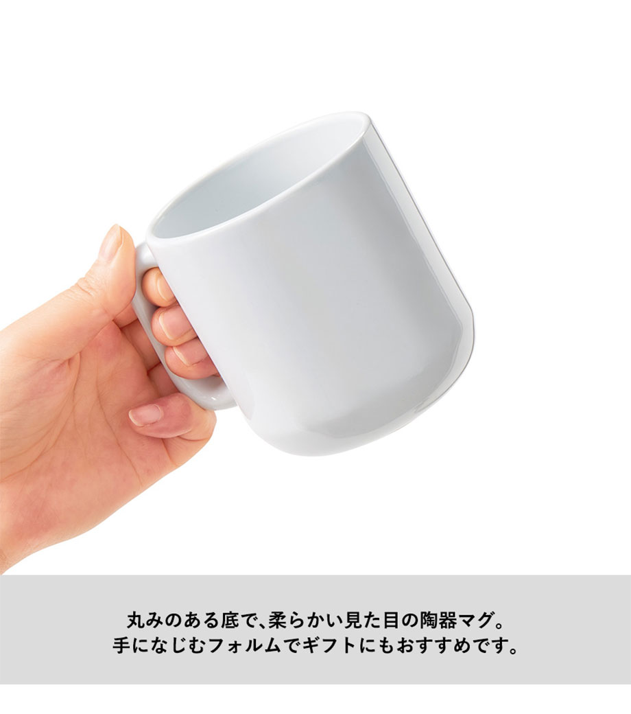 丸みを帯びたフォルムがやさしい印象を与える陶器製マグカップ。約360mlの程よい容量で普段使いに最適です。シンプルなホワイトカラーはオリジナル印刷を引き立てます。