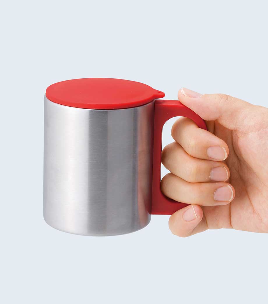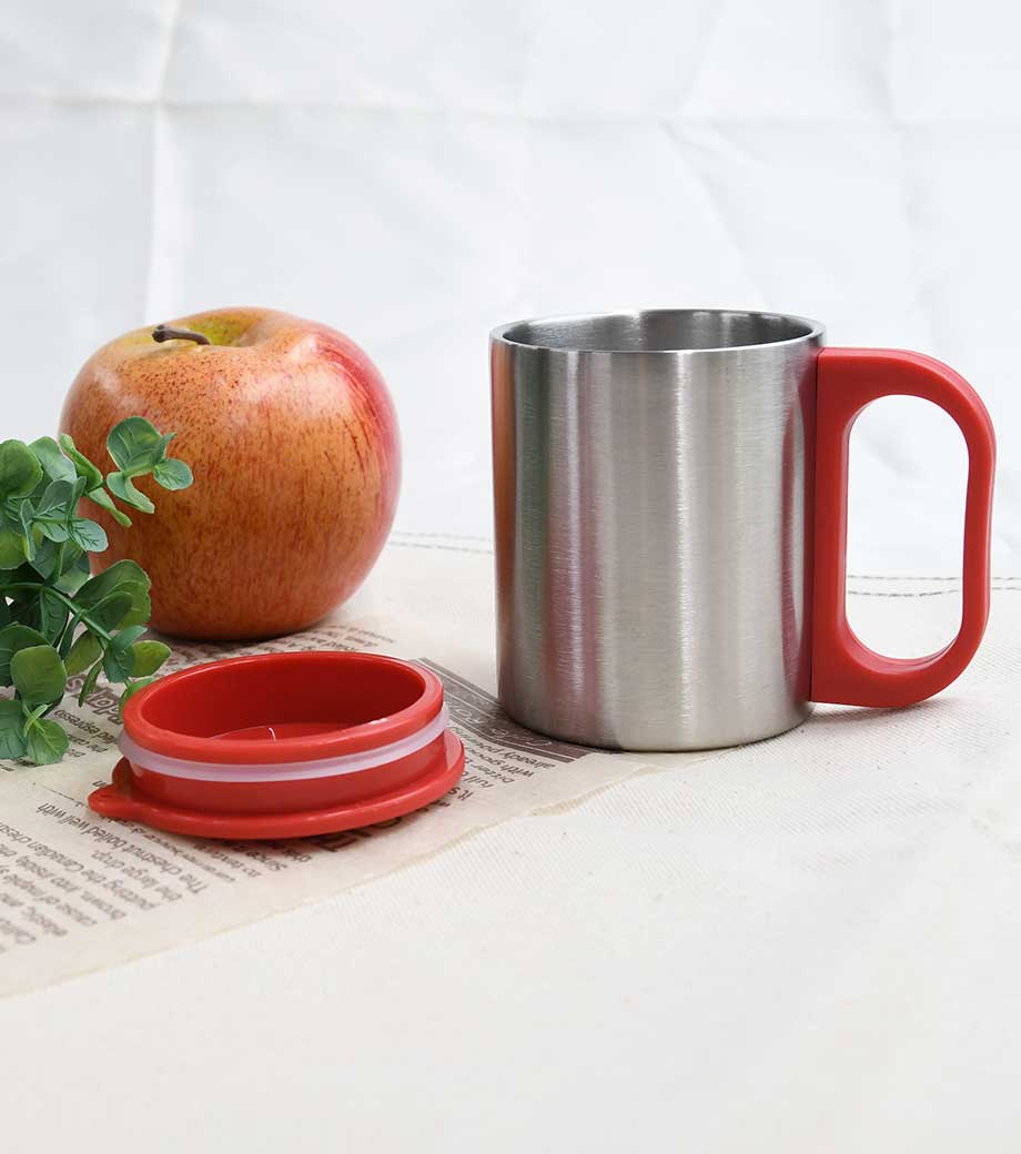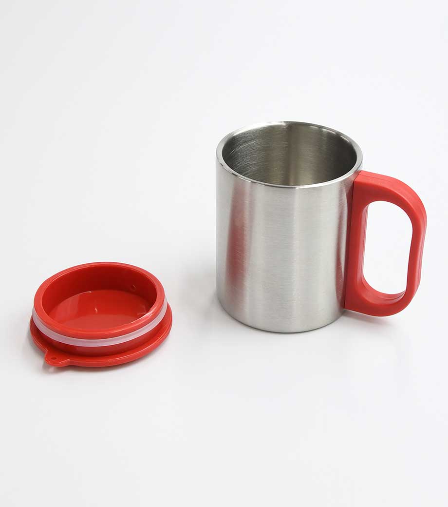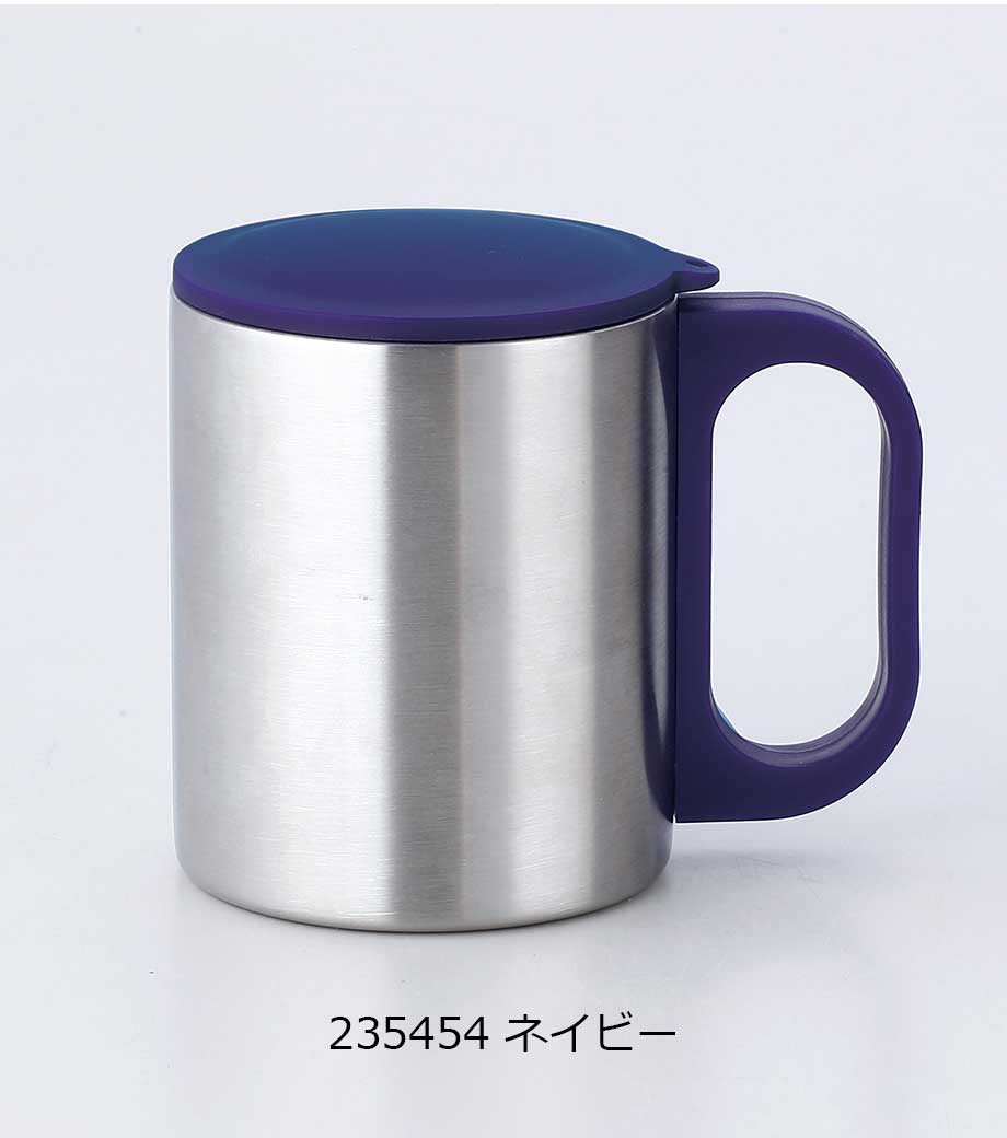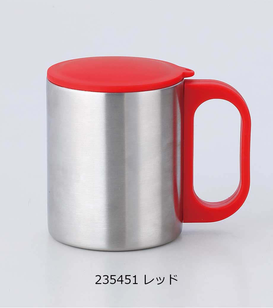 セルトナ・二重構造ステンレスマグカップ(蓋付き)は、名入れが目立つシンプルなステンレス素材のマグカップ。スポッとはまるフタ付きの二重構造です(真空ではありません)。温かい飲み物が冷めにくく、ほこりが入るのも防いでくれます。フタと持ち手の鮮やかなカラーが目を引くデザインです。容量約210mlと小ぶりのなのでアウトドア用にもおすすめ。