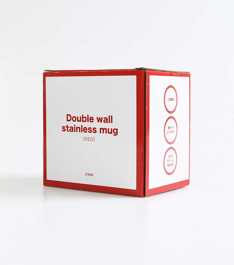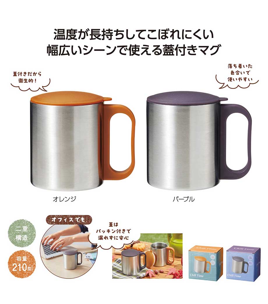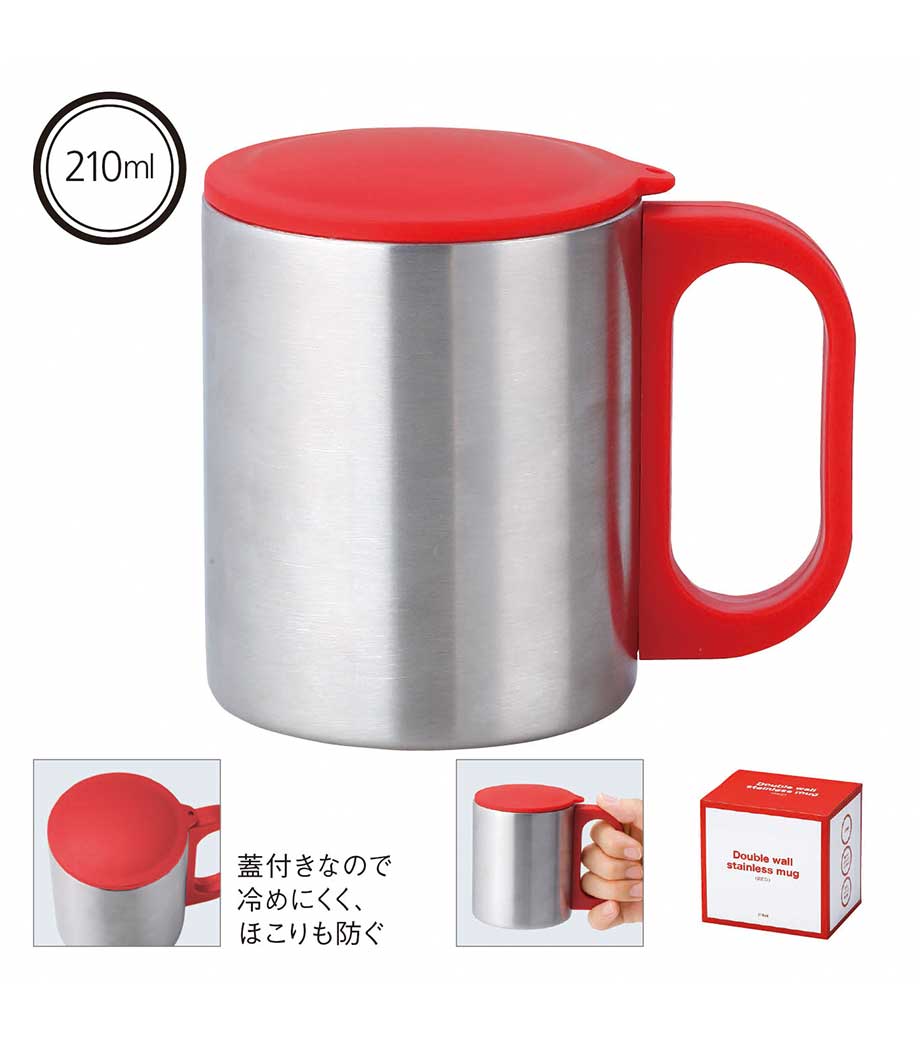 ステンレス二重構造のマグカップです。保温・保冷効果があり、ホットもアイスもおいしい温度をキープ。210mlの程よいサイズ感が普段使いにぴったりです。フタにはシリコンパッキン付きで、こぼれにくく安心。軽量&シンプルなデザインなので、オフィスや自宅はもちろん、アウトドアでも大活躍です。