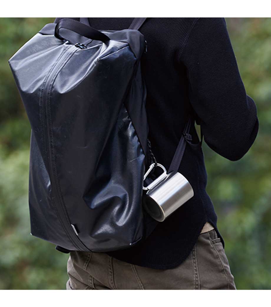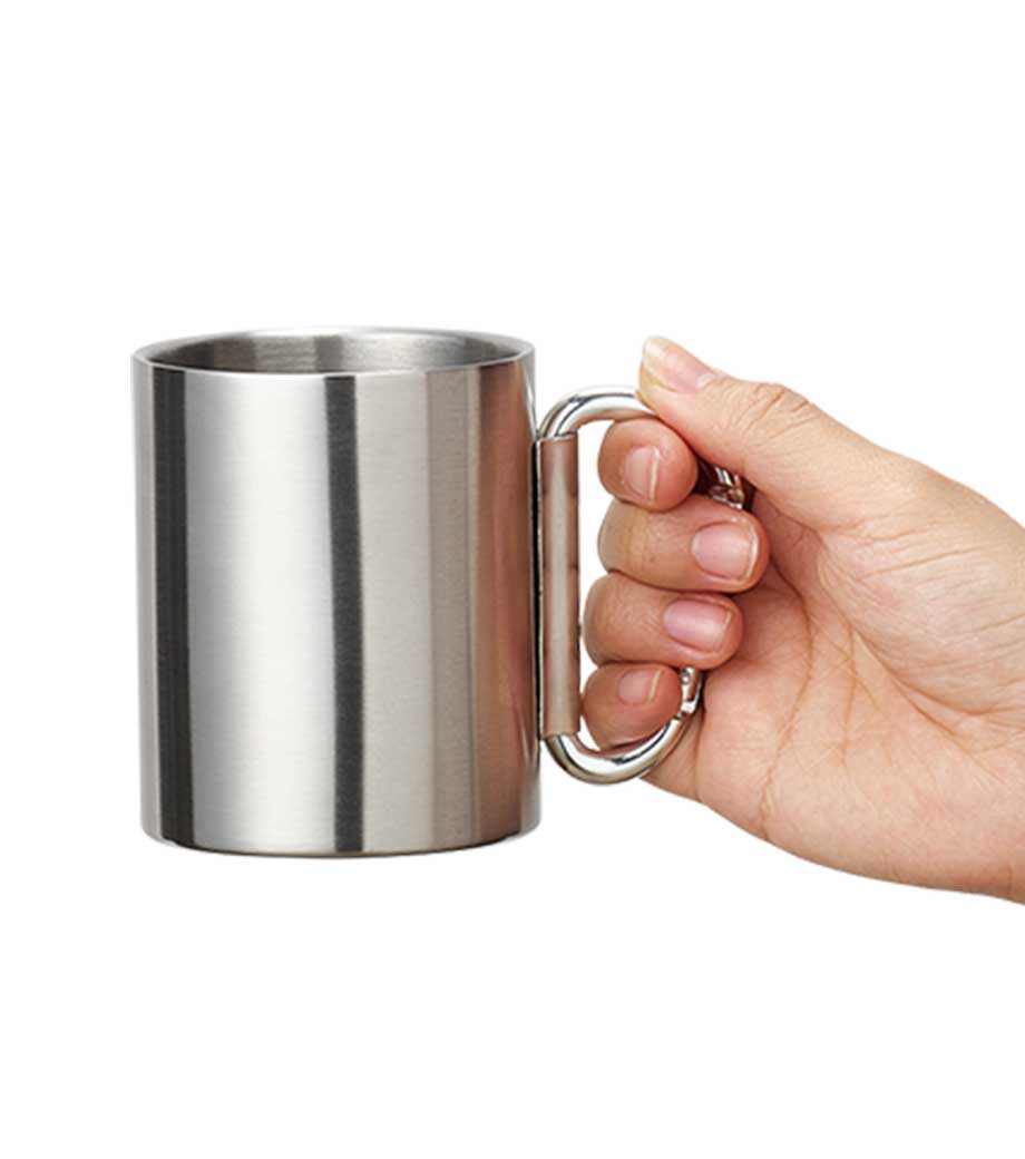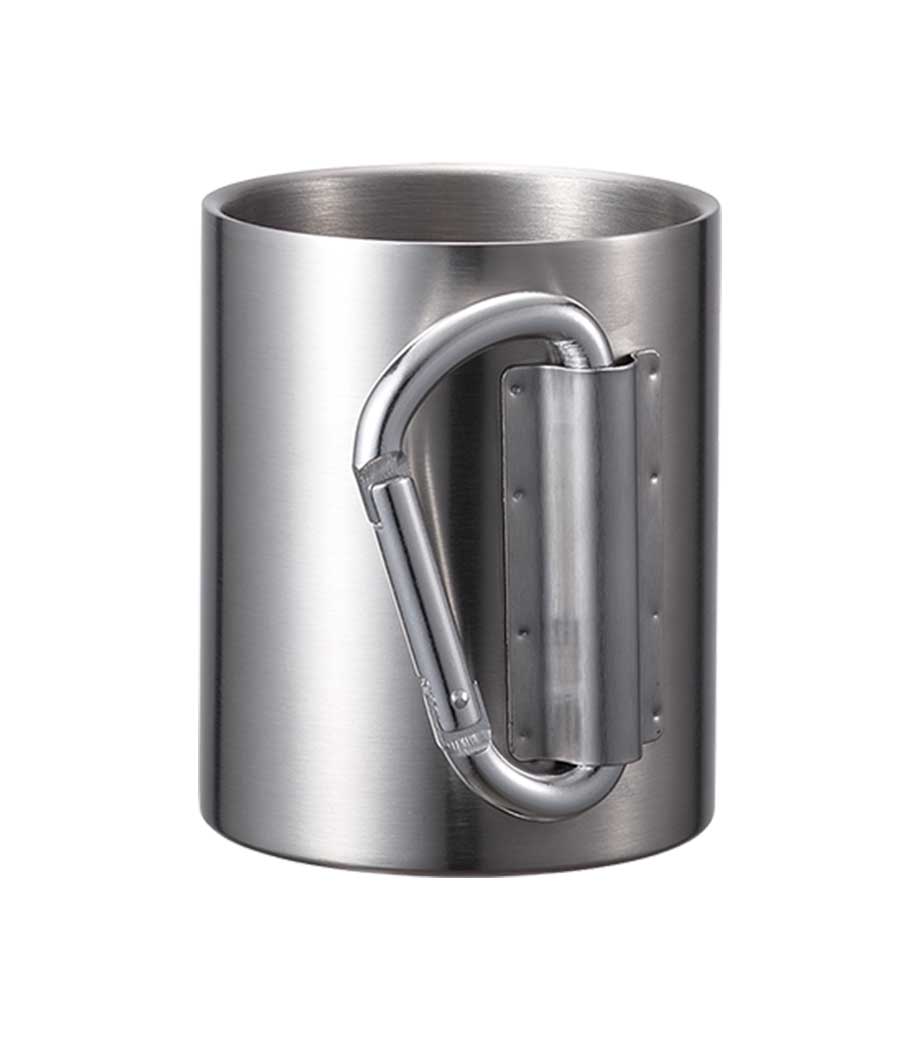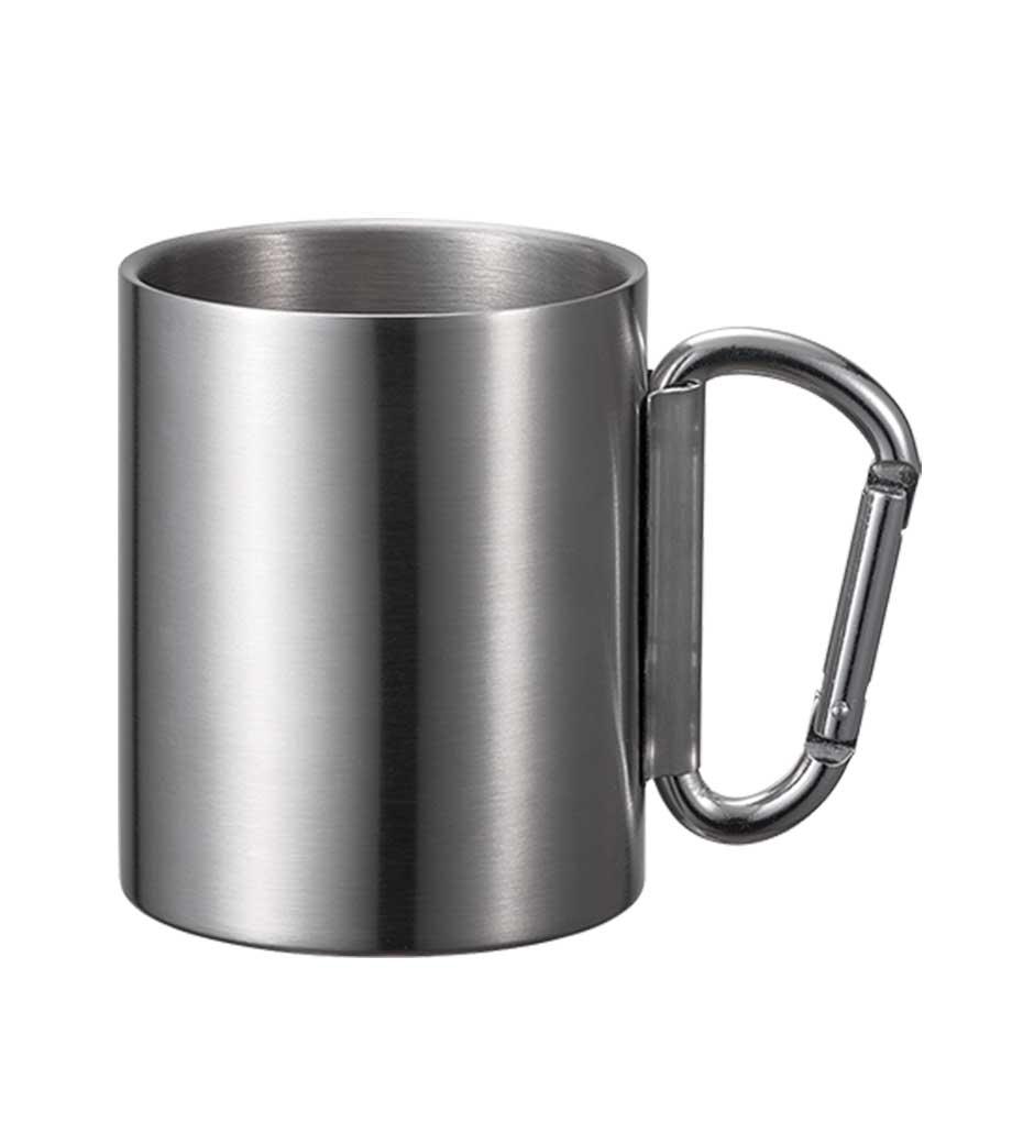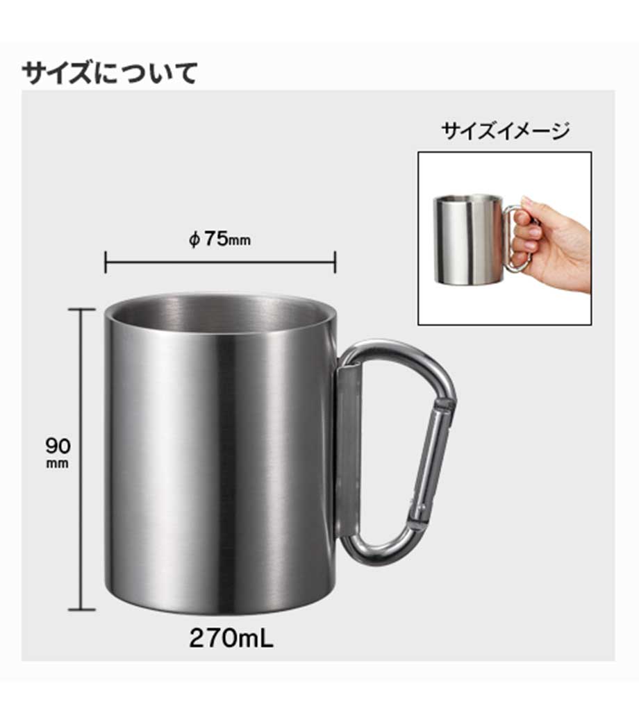 折りたたみカラビナハンドルステンレスマグは、持ち手が折りたためるカラビナになっているステンレス製マグカップ。リュックに引っ掛ければ登山やキャンプの持ち運びに便利です。結露しにくい2重構造(真空タイプではありません)で内側は錆にも強い18-8ステンレス製。使いやすい270mlの手頃なサイズ感も魅力です。収納時もハンドルが邪魔にならず、屋外での使用に最適なステンレスマグカップです。
