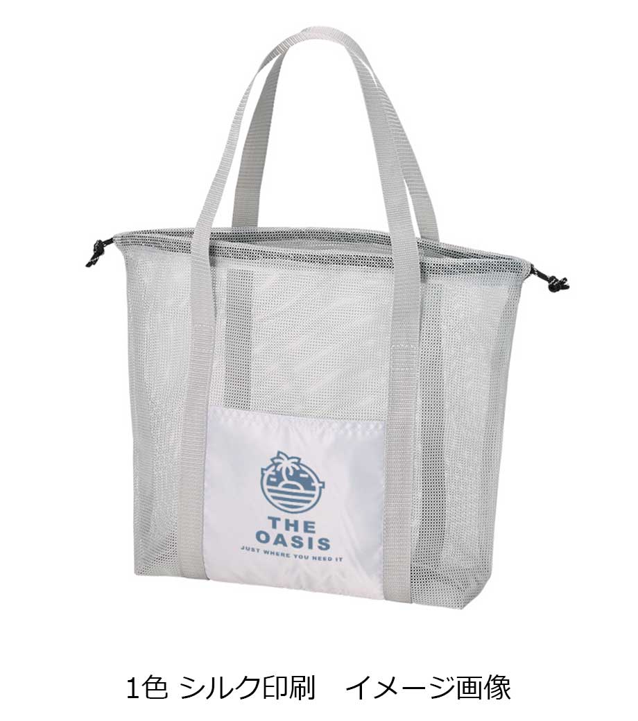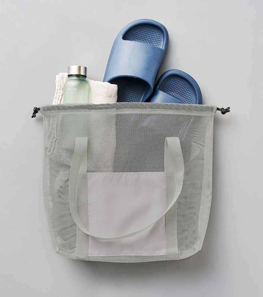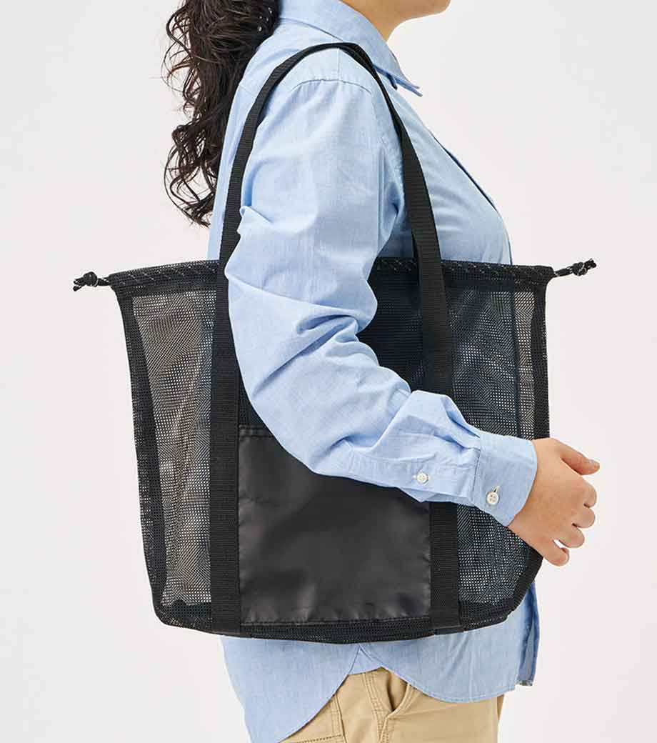 肩掛けできるメッシュ素材のトートバッグ。軽量で中身が見えやすく、通気性が良いので濡れたタオルや水着も安心して収納できます。口元は巾着仕様で中身の飛び出しも防止。A4サイズでデイリーにも使え、外ポケットはスマホなどをいれておくのに便利。マチ付きなのでかさ張るものもまとめて入り、ファミリーでのプールやレジャーにお勧めです。