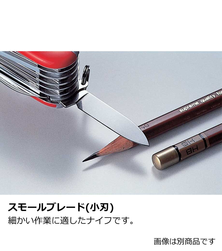 1.ラージブレード(大刃)、2.スモールブレード(小刃)、3.コルクせん抜き、4.カン切り、5.マイナスドライバー(小)3mm、6.せん抜き、7.マイナスドライバー(大)6mm、8.ワイヤーストリッパー、9.リーマー(穴あけ)/パンチ、10.キーリング、11.ピンセット(毛抜き)、12.ツースピック(つまようじ)、13.はさみ、14.マルチフック