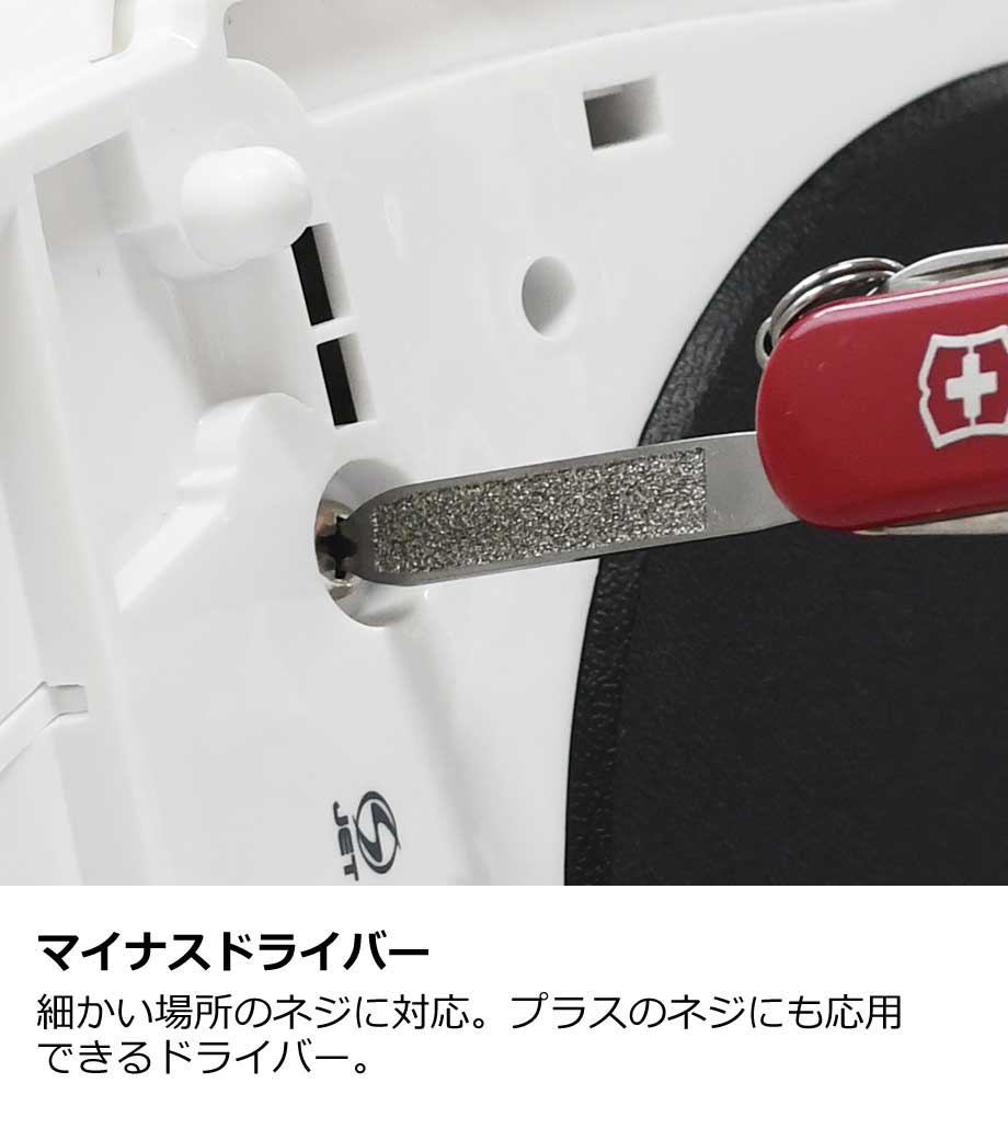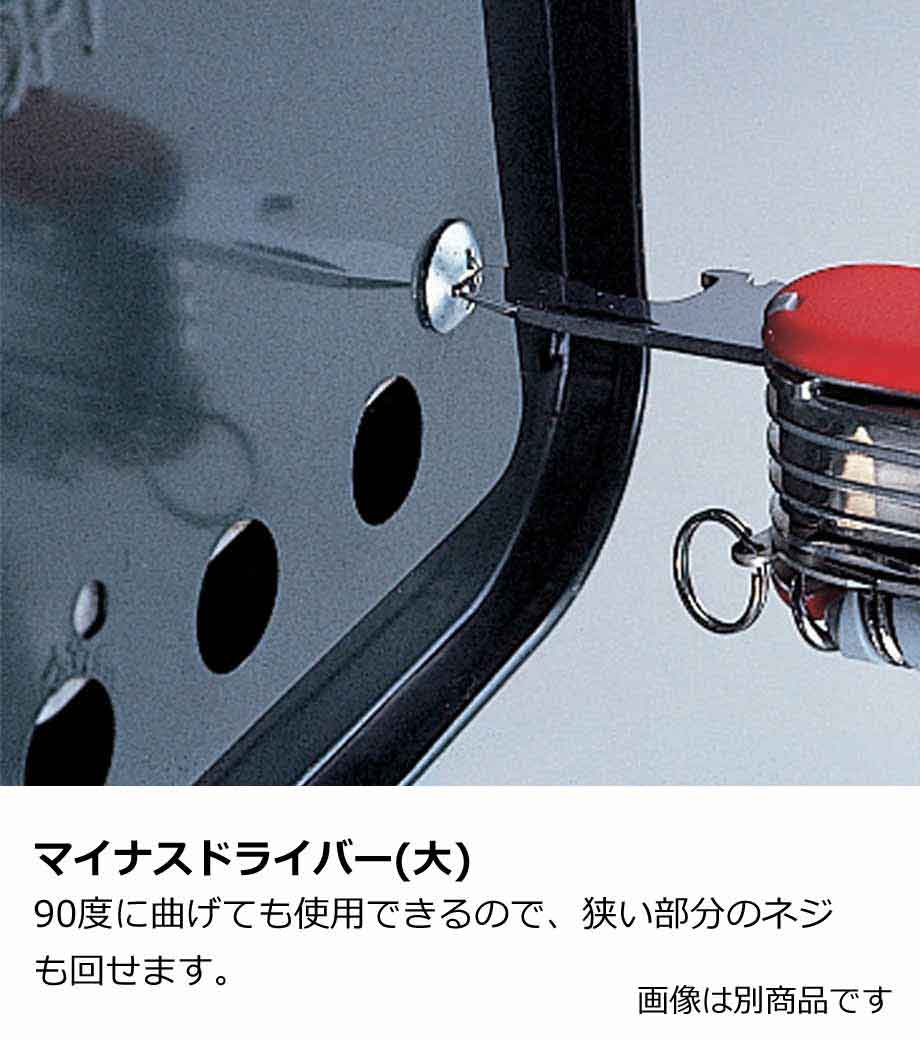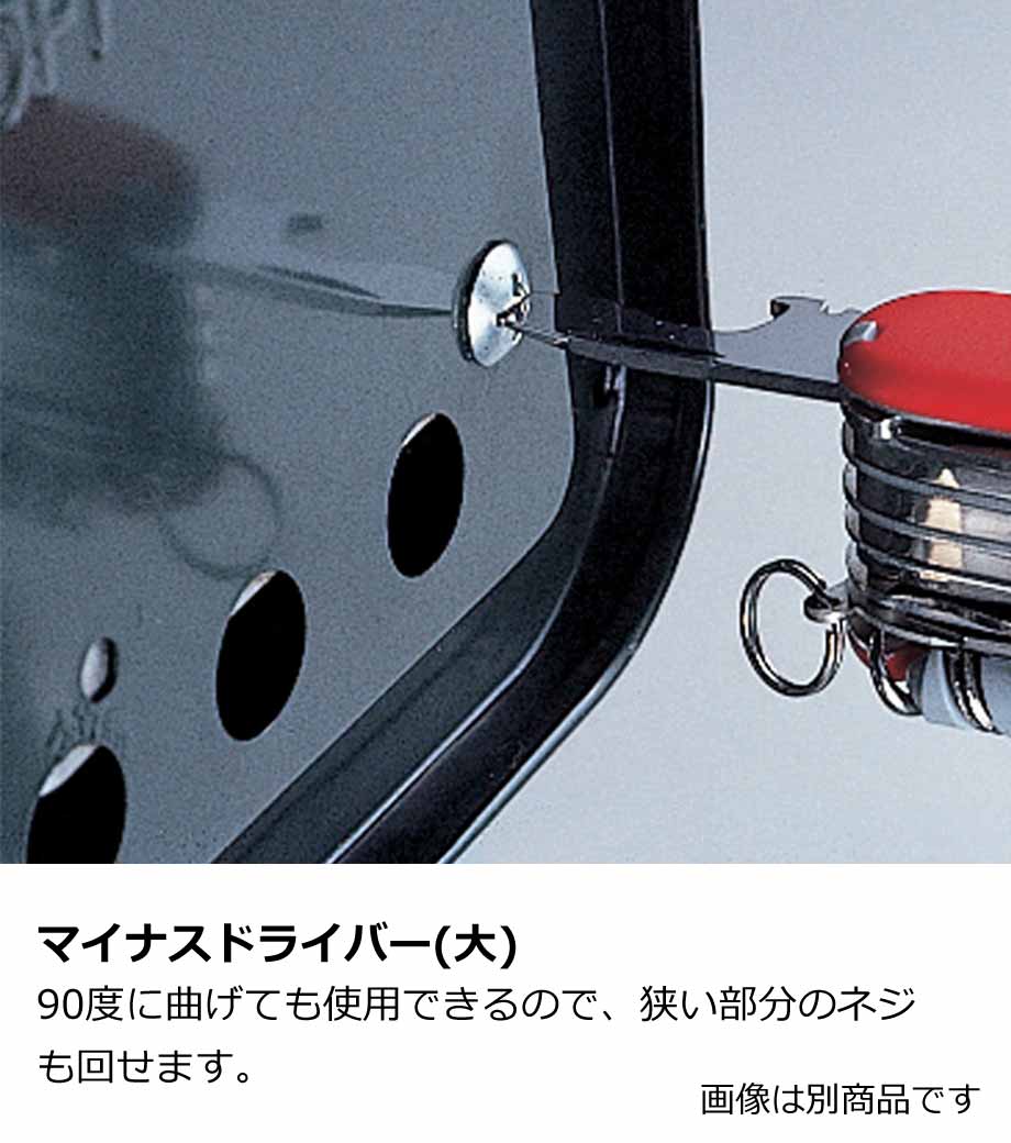 1.ラージブレード(大刃)、2.スモールブレード(小刃)、3.プラスドライバー、4.カン切り、5.マイナスドライバー(小)3mm、6.せん抜き、7.マイナスドライバー(大)6mm、8.ワイヤーストリッパー、9.リーマー(穴あけ)、10.キーリング、11.ピンセット(毛抜き)、12.ツースピック(つまようじ)
