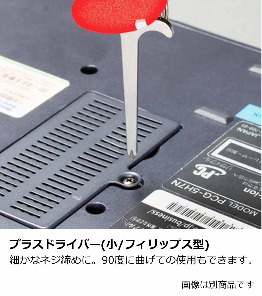 1.スモールブレード(小刃)、2.つめやすり、3.マイナスドライバー(小)3mm、4.はさみ、5.キーリング、6.ピンセット(毛抜き)、7.ボールペン(ブルー)、8.せん抜き、9.ワイヤーストリッパー、10.プラスドライバー(小・フィリップ型)、11.つめそうじ、12.スケール(cm)、13.スケール(inch)、14.甘皮押し、15.クラフトブレード(レターオープナー)、16.オレンジピーラー、17.スクレーバー