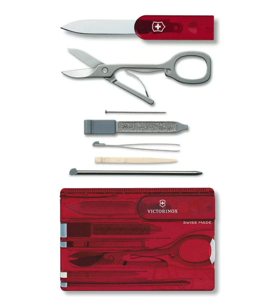 1.スモールブレード(小刃)、2.つめやすり、3.マイナスドライバー(小)、4.はさみ、5.キーリング、6.ピンセット(毛抜き)、7.ツースピック(つまようじ)