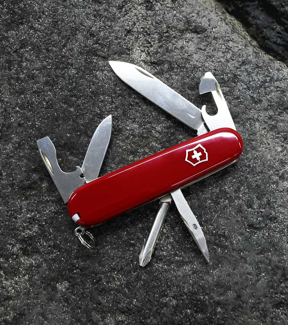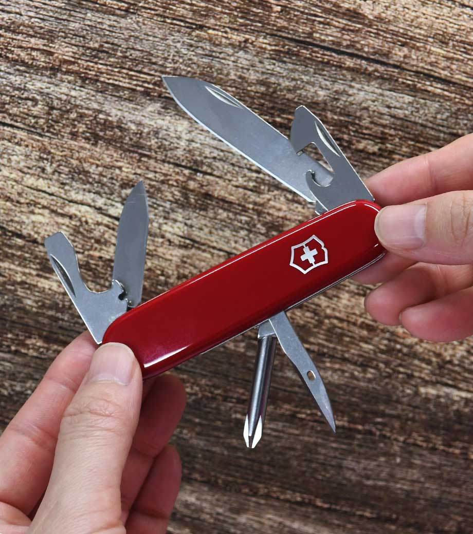 ビクトリノックス【ティンカー】マルチツールは、大・小ナイフなど12機能を装備した全長約91mmの標準モデル。世界で愛されるブランドメーカー品です。ビクトリノックスの代表的な「オフィサーシリーズ」のこのナイフは、マルチツールの原点となるモデルです。配合にこだわったステンレススチールは強度があり錆びにくく、切れ味抜群。日常で出番が多いプラスドライバー付きなので、ゆるんだネジを閉めるのにも役立ちます。