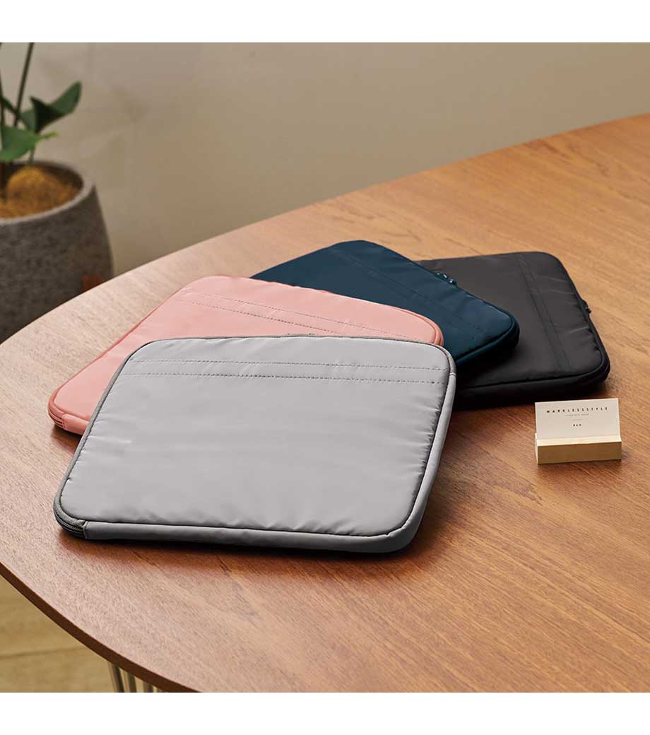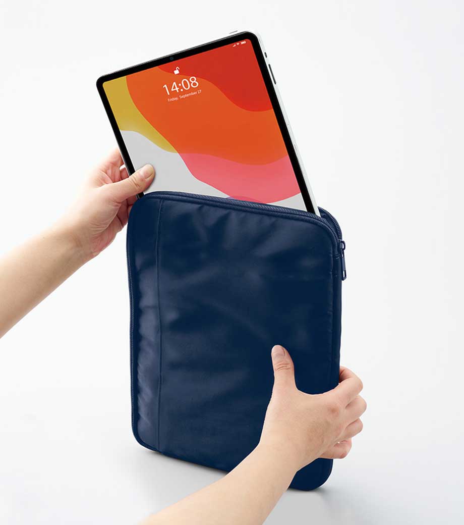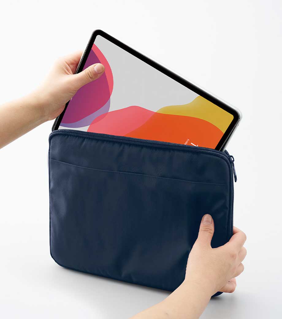 バッグ イン バッグは、タブレットPCケースとして使える収納バッグ。ポケット数が多く、通勤・通学時の鞄の中をスッキリ整理できます。バッグ内にはA4クリアファイルも収納可能です。薄型13インチ程度のタブレット端末・PCが入ります。表面にはペンやモバイルバッテリー、文庫本など小分けに収納できるポケット付き。フラットタイプなので鞄の中に入れてもかさばらず持ち運びに便利です。しっかりとハリのある素材で2mm厚のクッションが端末を保護してくれます。このバッグひとつ持ち出せばどこでも作業がはかどりますね。