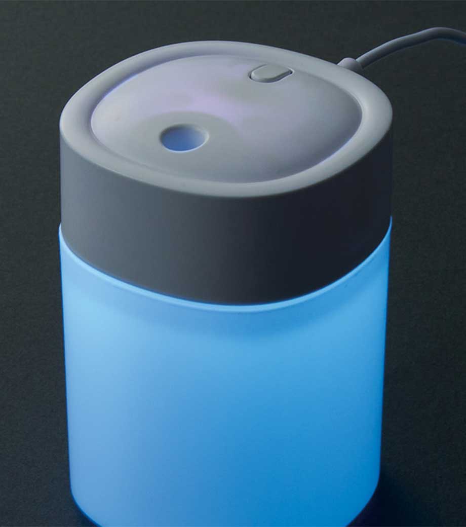 パーソナル加湿器 木目調クリアボトルタイプは木目調のキャップがアクセントのおしゃれな加湿器。パソコンやUSBポート付属機器に接続して、オフィスや寝室などお好きな場所で使用できます。使用中はLEDランプがブルーに点灯。3時間切タイマー機能付きで空焚きを防止してくれます。
