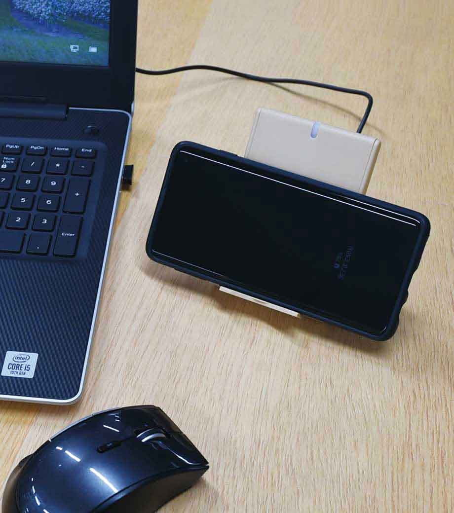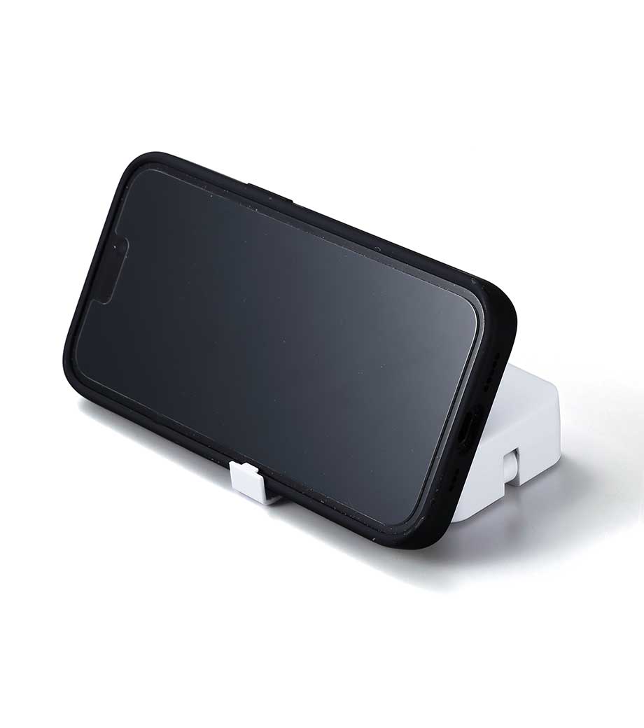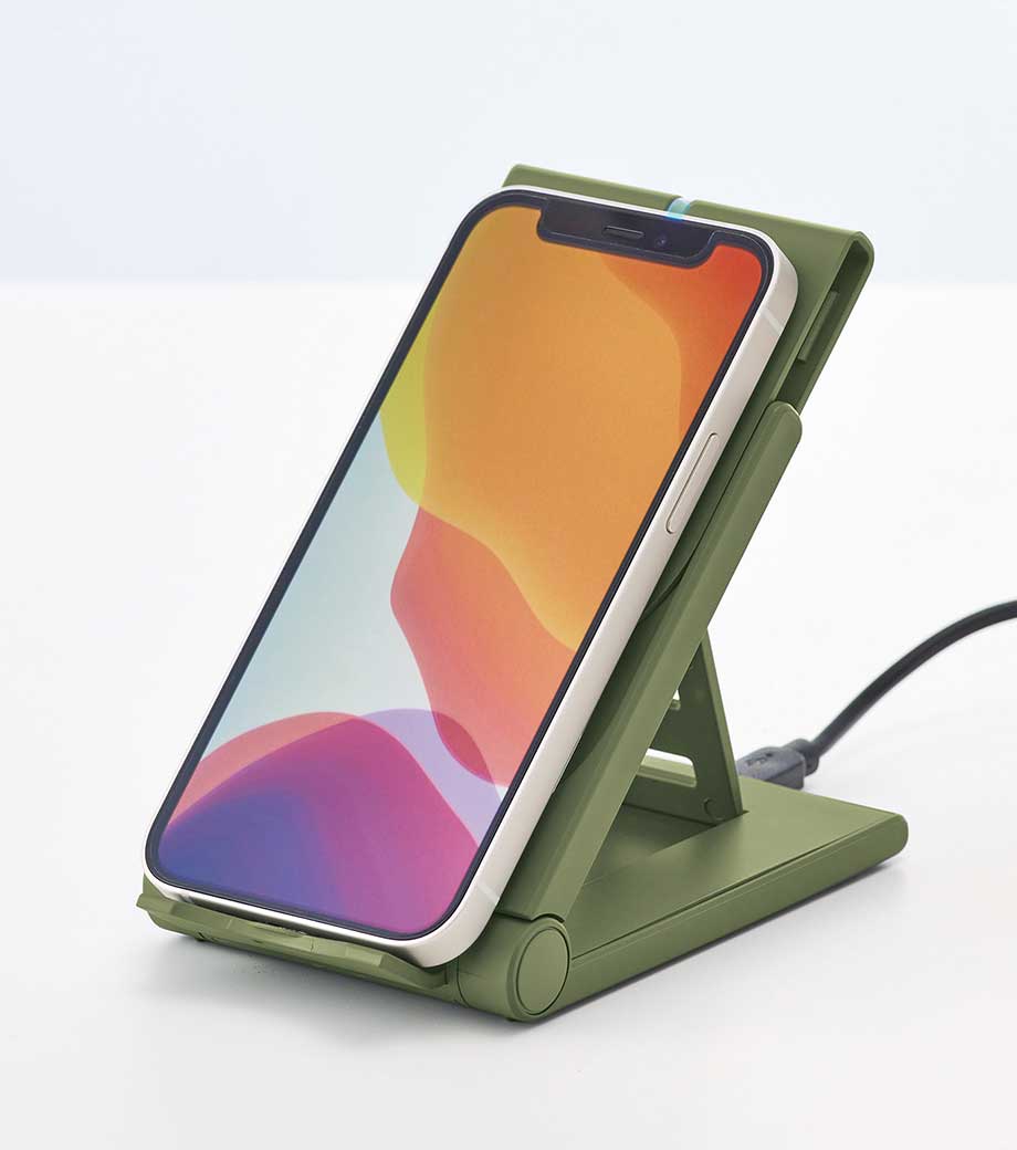 ポケットワイヤレスチャージャーはスマホスタンドにもなるQi(チー)対応ワイヤレス充電器。USBコードでPCに接続すれば、スマホを操作しながら充電もできます。接触面の高さは10段階に調節可能。使いやすい角度に設定ができて、スマホを縦置・横置どちらでも使えます。持ち運びしやすい折りたたみタイプなので、リモートワークのお供にもピッタリです。