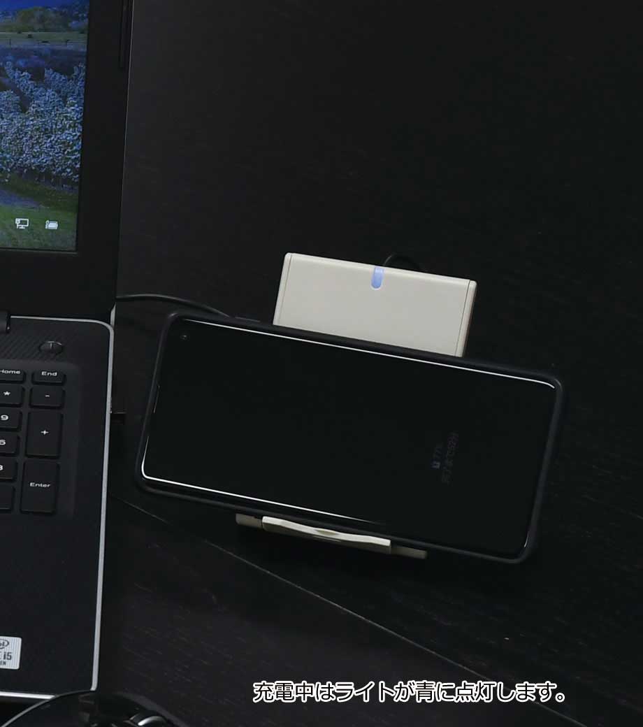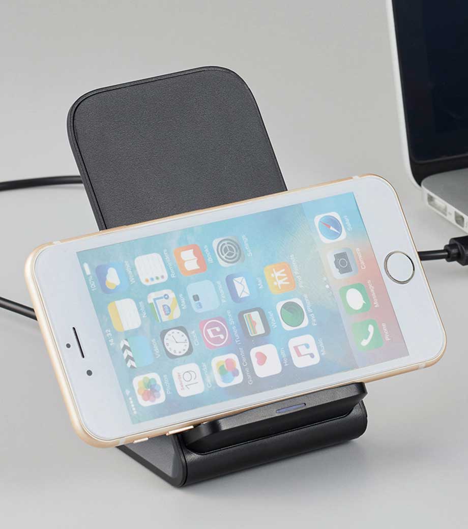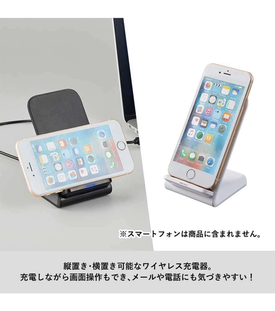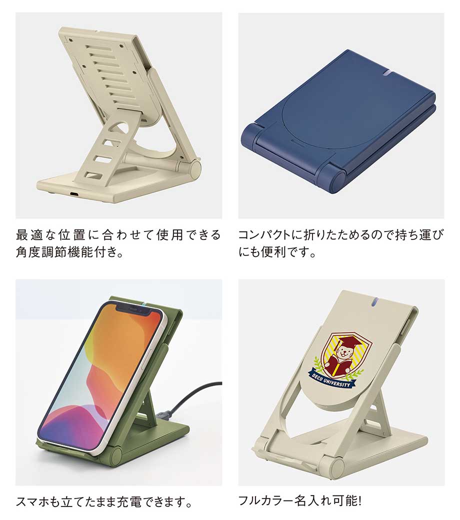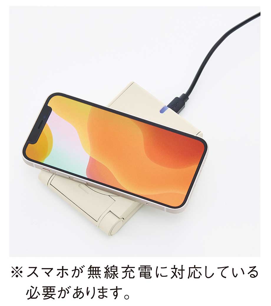 スタンドワイヤレス充電器折りたたみタイプ 5Wは、そのまま使えばスマホスタンド、PCに接続すればスマホを操作しながら充電できる便利グッズ。接触面の高さは調節できるので、縦置きでも横置きでも使えます。スタンドの角度も背面のストッパーで調節でき、見やすい位置でスマホ操作が可能です。外出先でも使いやすい折りたたみタイプなので、リモートワークのお供にピッタリ!