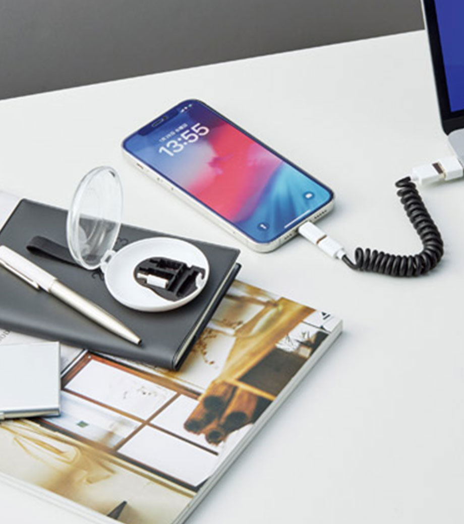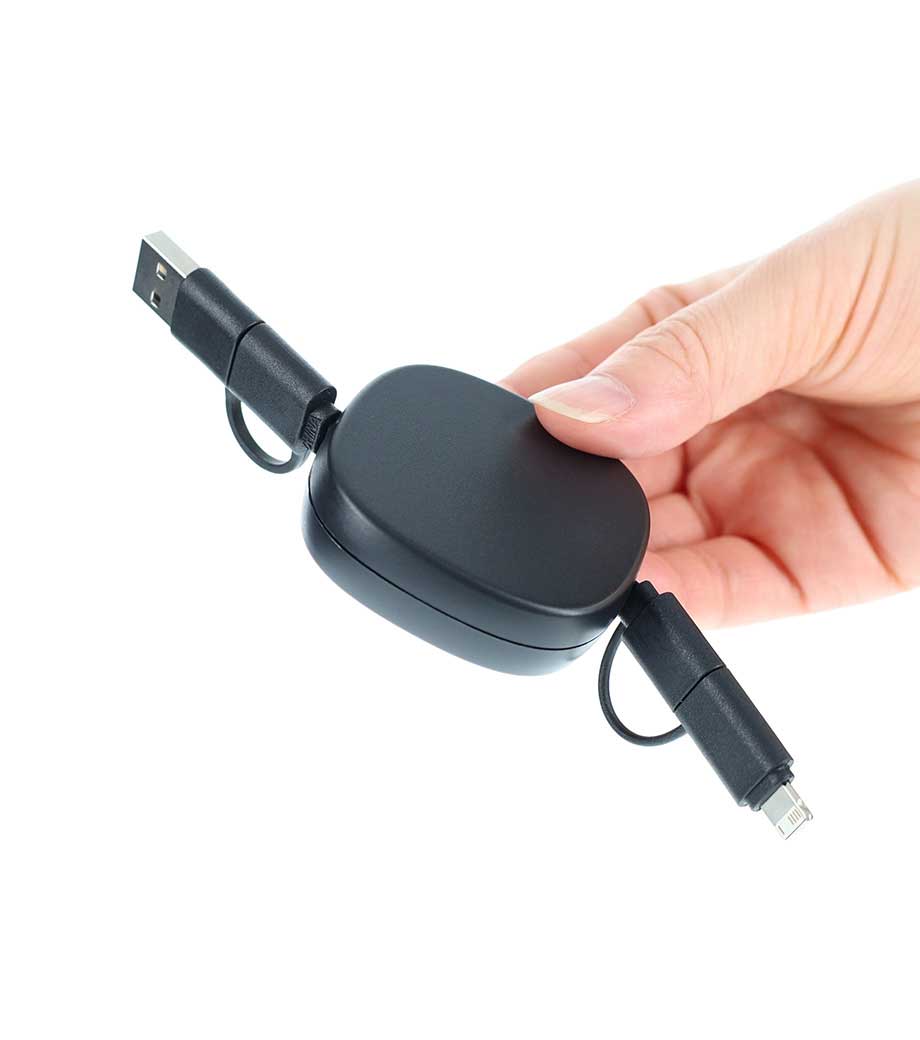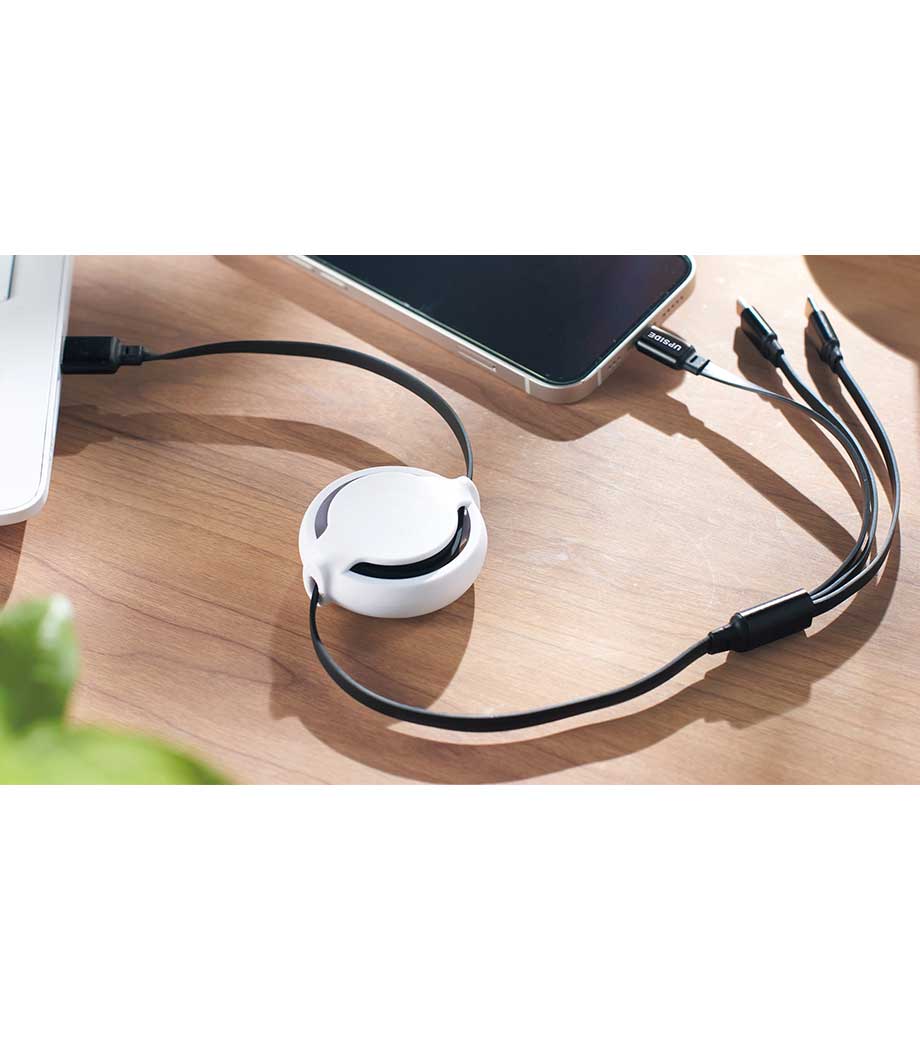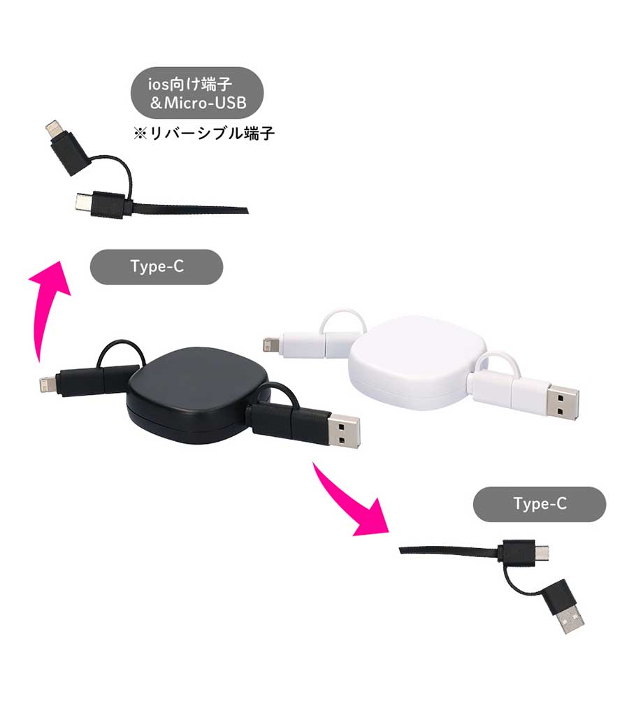 1本でさまざまな端子に対応できる便利なツール! iOS向け端子・Micro-USB・Type-C(リバーシブル端子)の3種類に対応し、スマホやタブレットの充電・データ転送がスムーズに行えます。巻取り式で、使わないときはすっきり収納。バッグやポーチの中でコードが絡まる心配がなく、コンパクトで持ち運びに最適です。