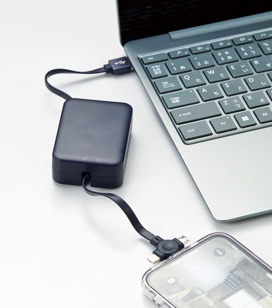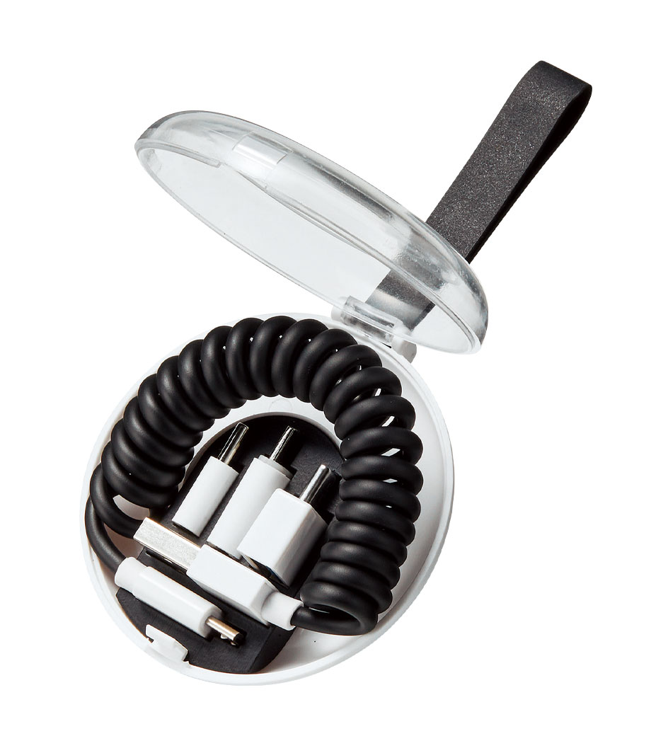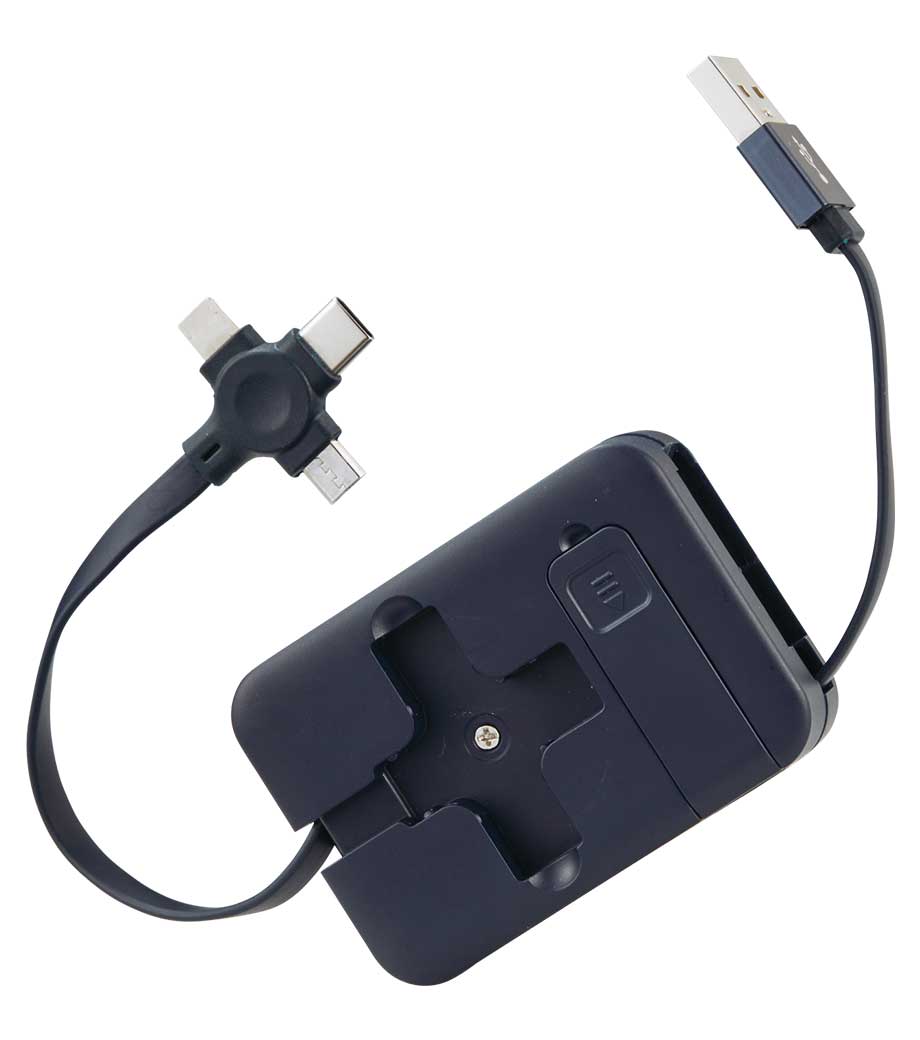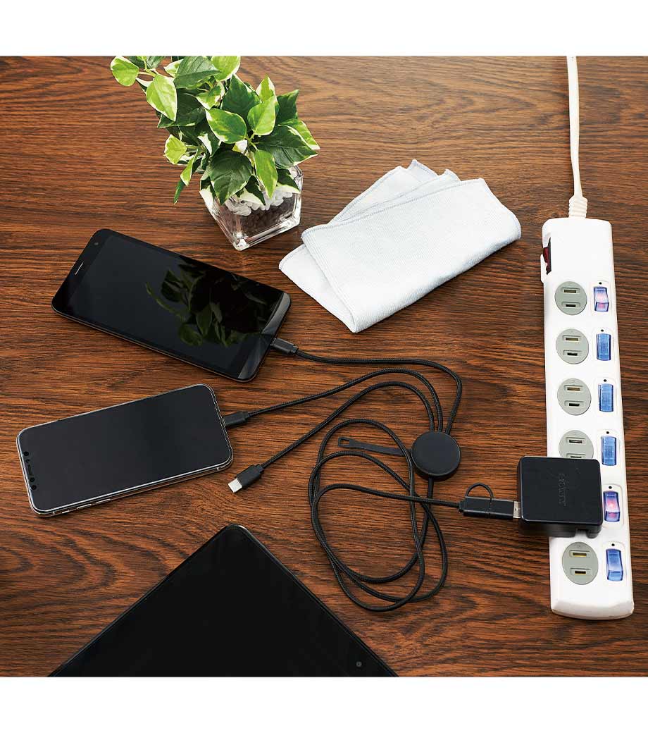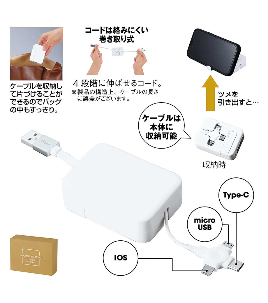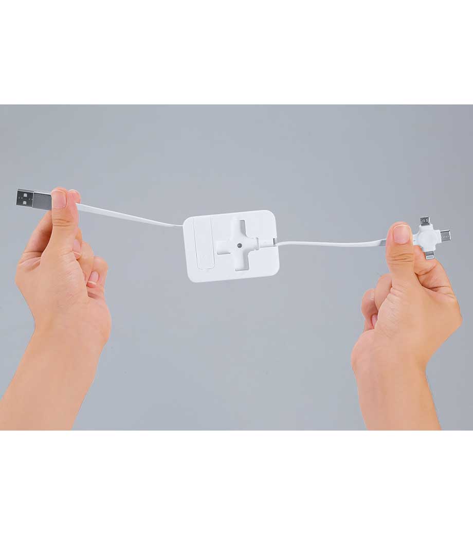 コンパクトに携帯できるマルチケーブル。コネクタはiOS・Type-C・micro USBの3種がセットになっていて、様々な機種を充電できます。コードの長さは4段階で最大約90cmまで引き延ばし可能。ラクチンな半自動巻取り式です。スマホスタンド機能付きで、外出時にスマホを固定したい時に役立ちます。
