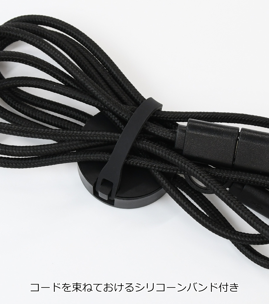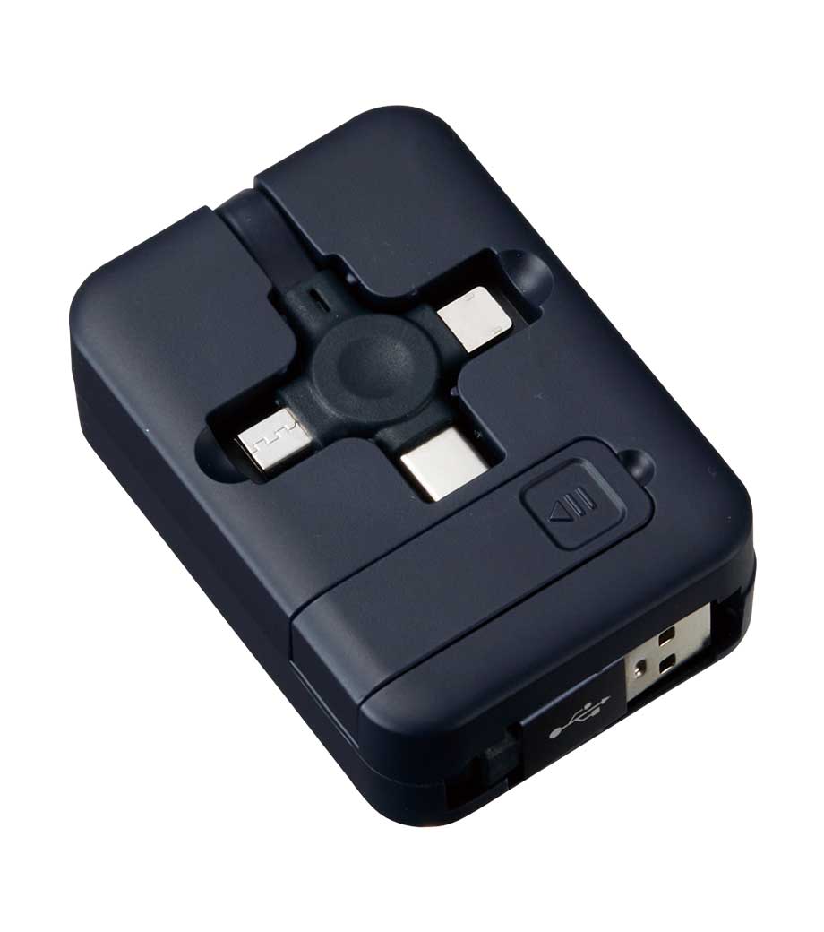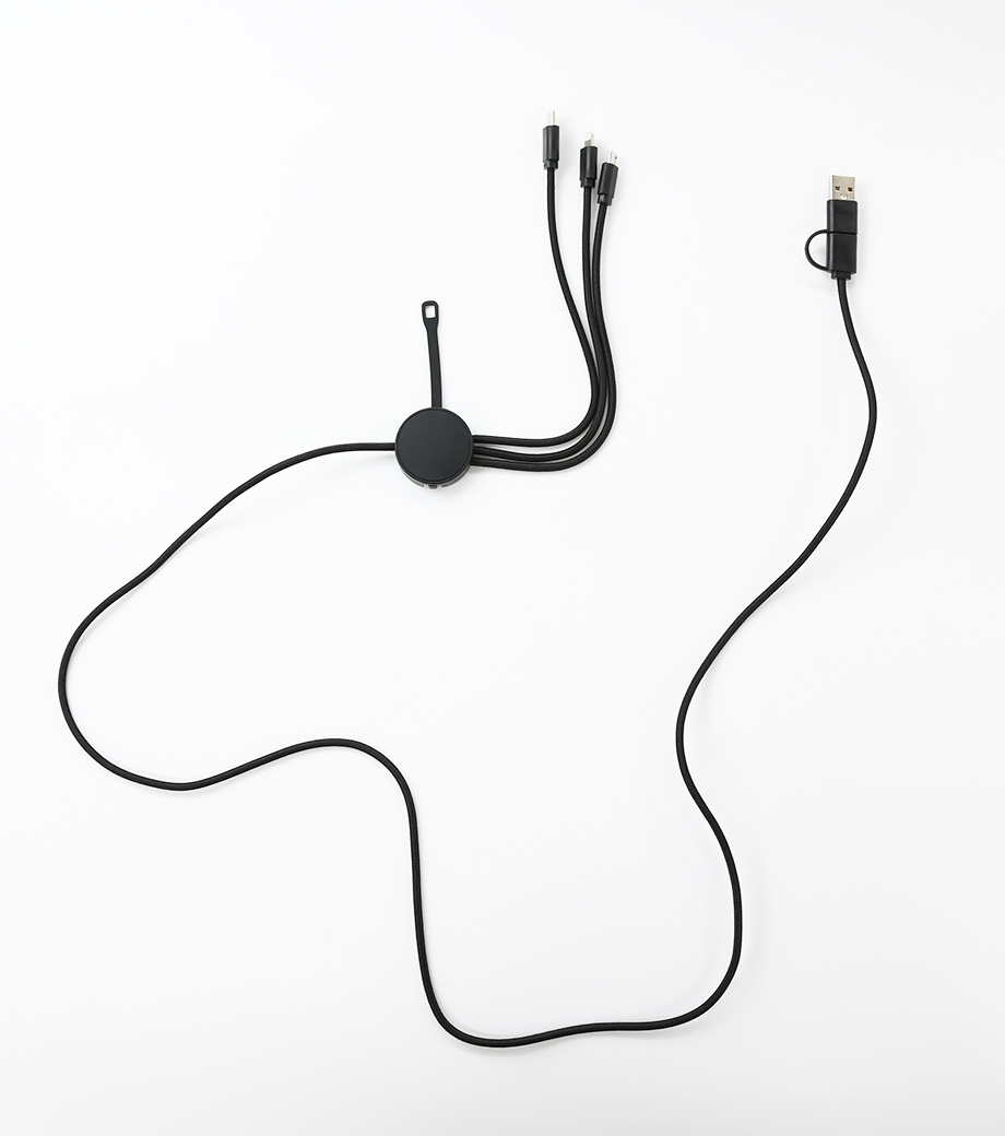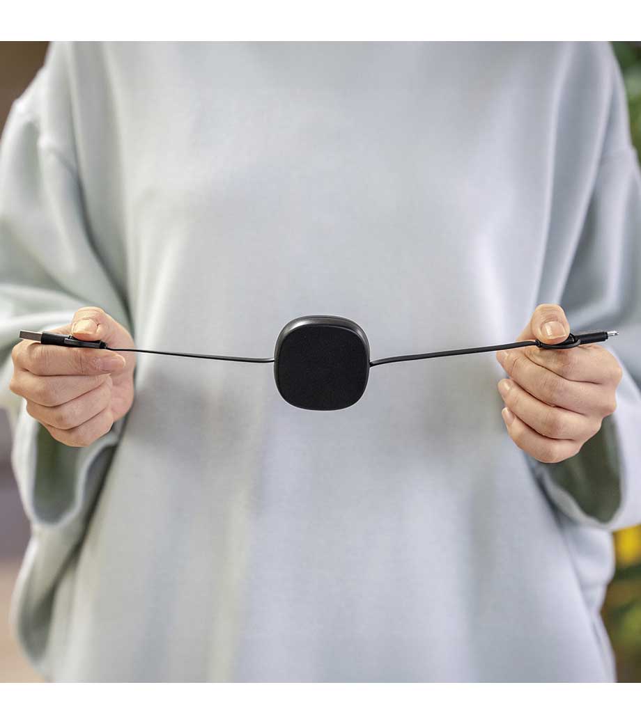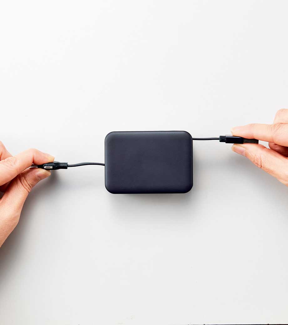 コンパクトに携帯できるマルチケーブル。コネクタはiOS・Type-C・micro USBの3種がセットになっていて、様々な機種を充電できます。コードの長さは4段階で最大約90cmまで引き延ばし可能。ラクチンな半自動巻取り式です。スマホスタンド機能付きで、外出時にスマホを固定したい時に役立ちます。