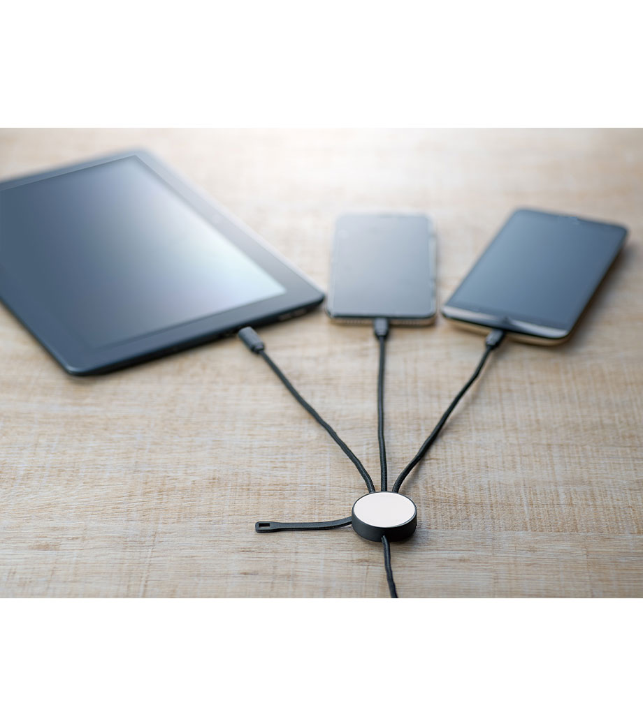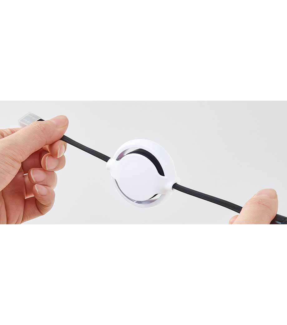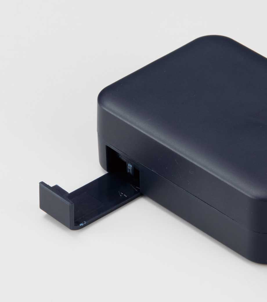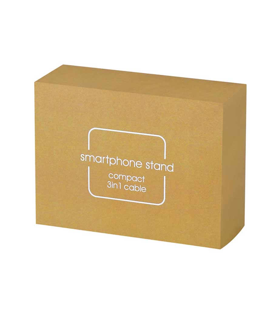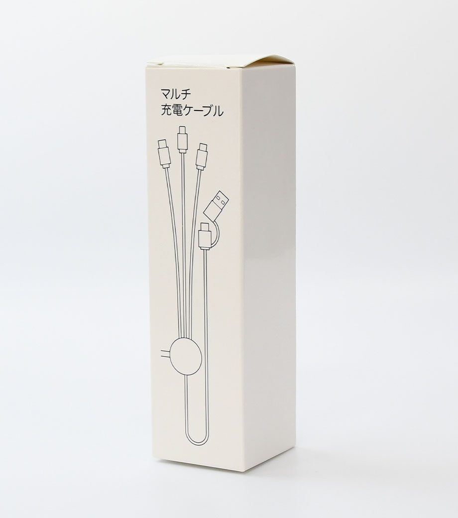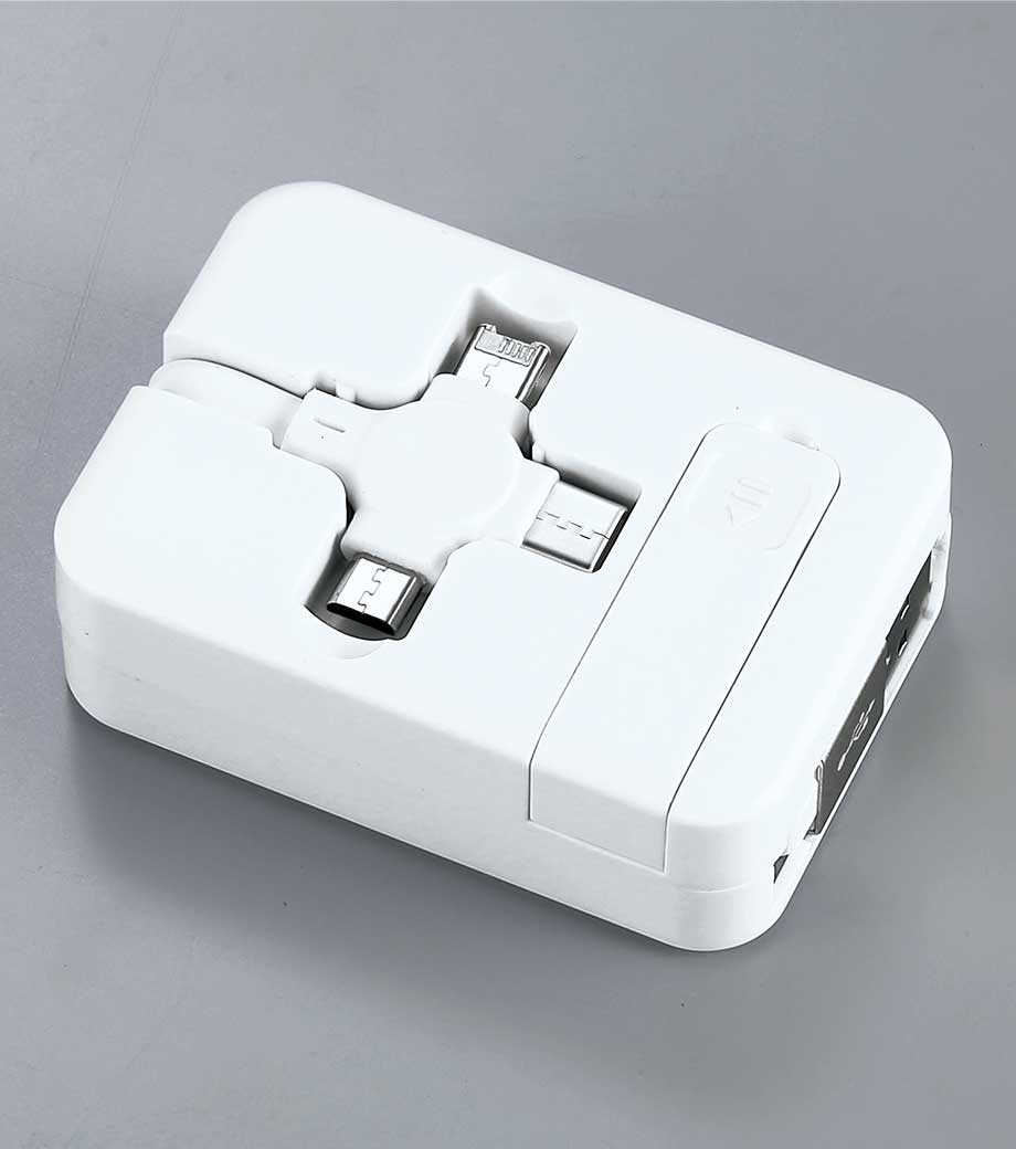 コンパクトに携帯できるマルチケーブル。コネクタはiOS・Type-C・micro USBの3種がセットになっていて、様々な機種を充電できます。コードの長さは4段階で最大約90cmまで引き延ばし可能。ラクチンな半自動巻取り式です。スマホスタンド機能付きで、外出時にスマホを固定したい時に役立ちます。