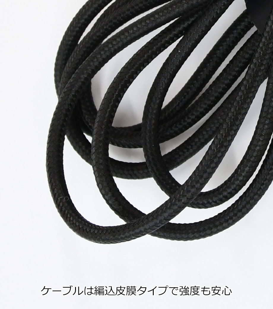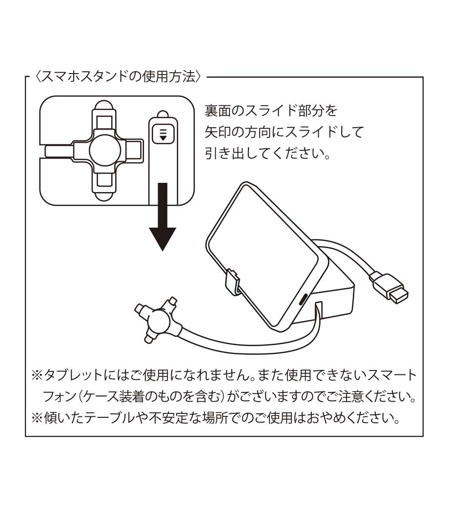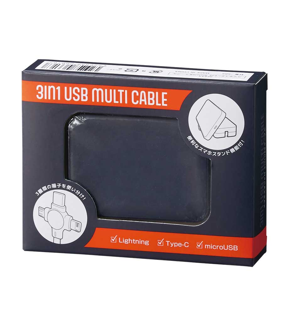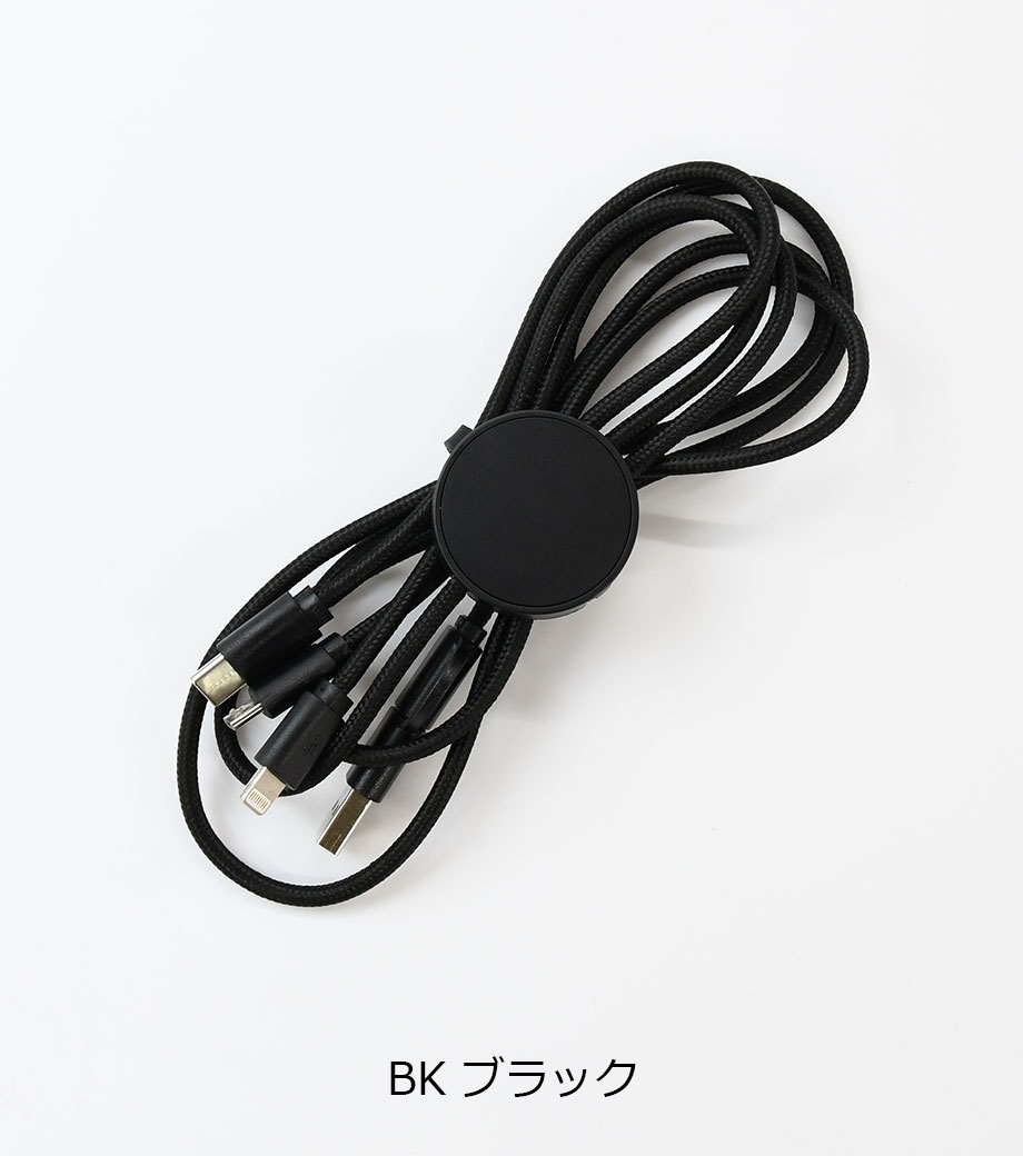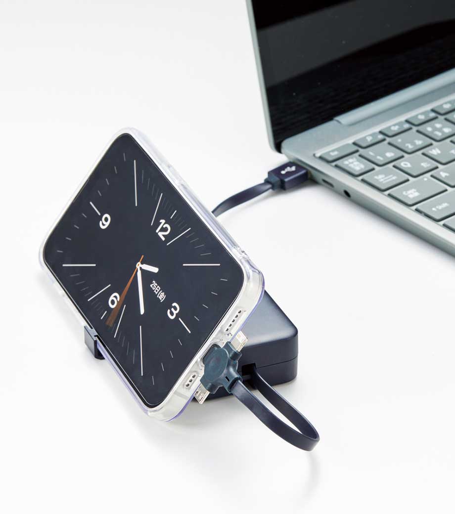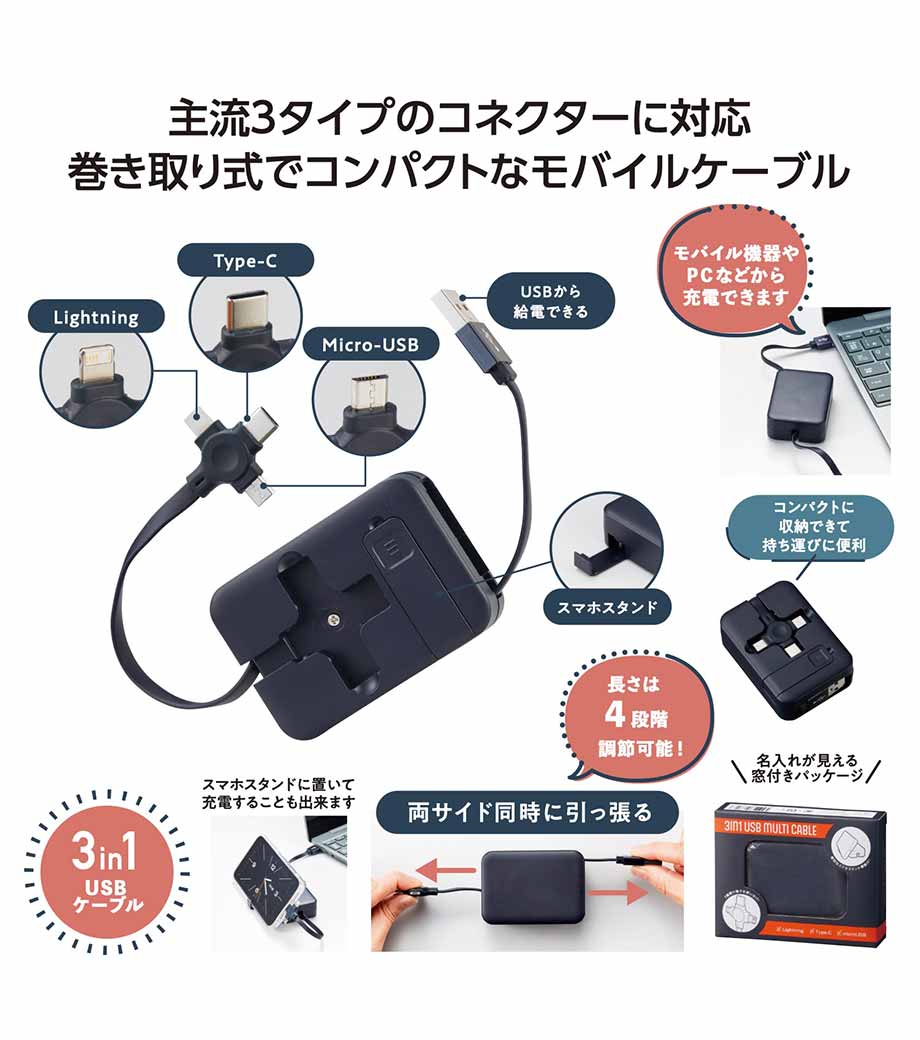 モバイル機器などから充電できるUSBケーブルです。コネクターはLightning・Type-C・microUSBの3種類でケーブルは最長900mm。4段階で長さ調節ができます。スマホスタンド付きで動画鑑賞にも便利です。使わない時はケーブル・スタンドとも本体に収納できてコンパクトに持ち運べます。