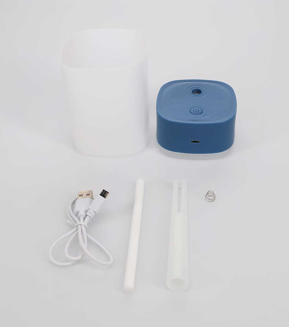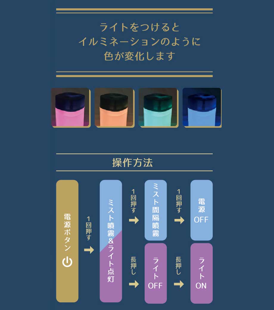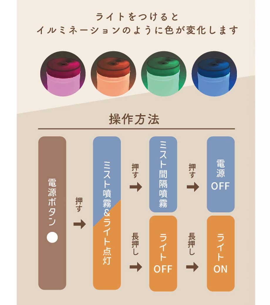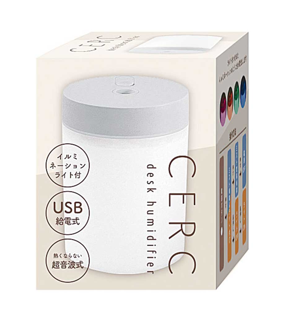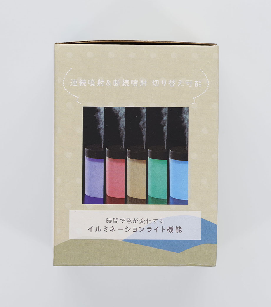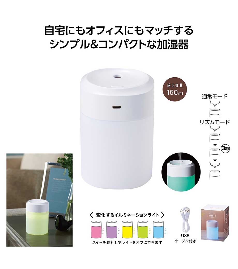 乾燥対策に嬉しい静音の超音波式加湿器です。電源はUSBコード。デスクにも置きやすく、5色に変化するイルミネーションライト付きでベッドサイドにもおすすめ!リラックスタイムにもピッタリです。旅先に携帯しやすいコンパクトサイズ。噴射は連続・3秒のリズムモードに切り替えが可能です。コスメショップや美容系サロンのノベルティなどに人気があります。
