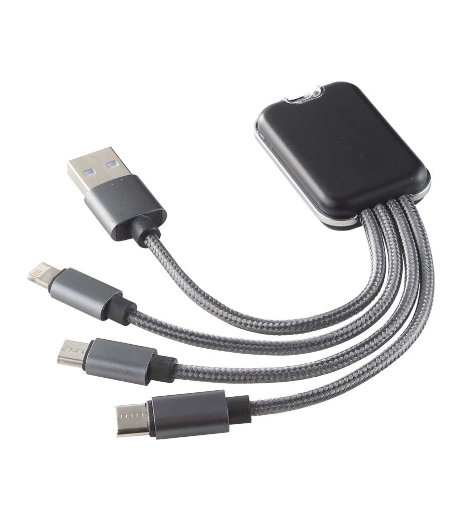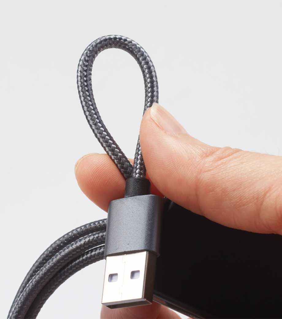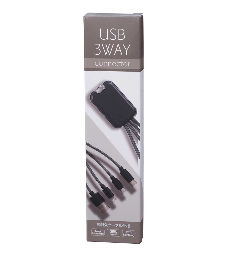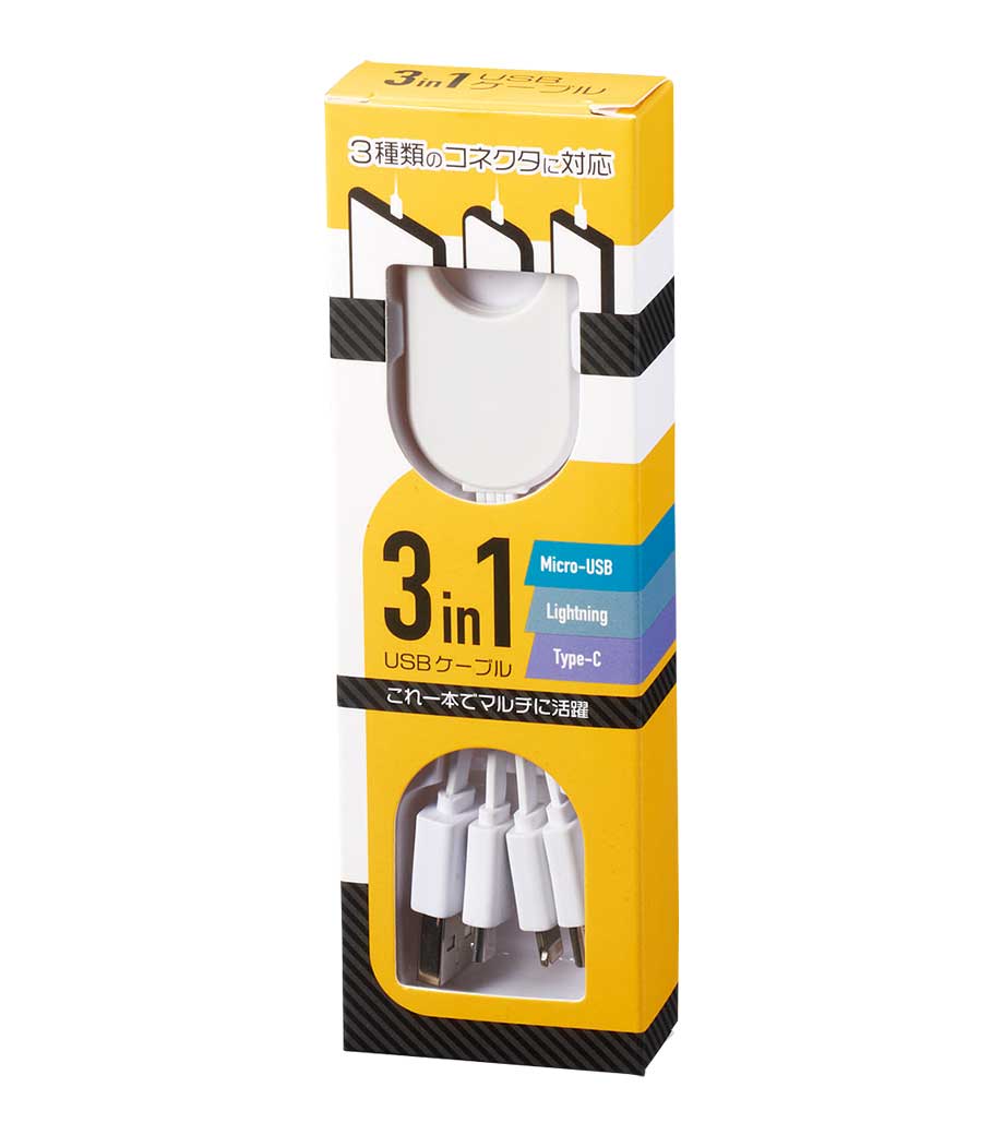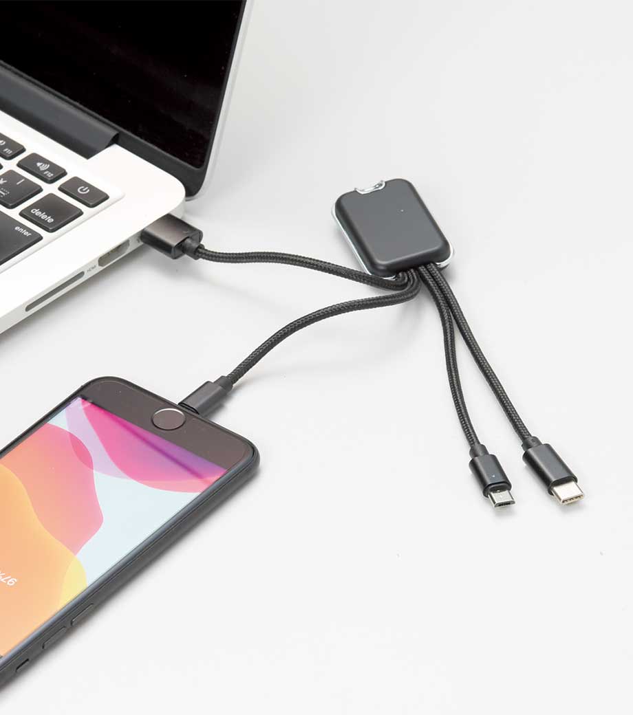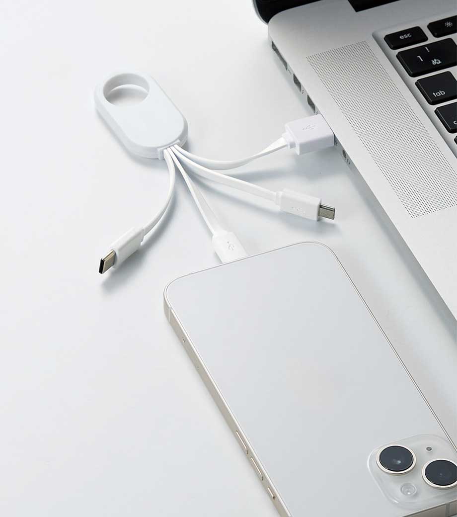 Type-C、micro USB、Lightningの3種類のコネクターが一体となった、便利なマルチタイプ充電ケーブル。USBポートに挿すだけで、スマホやタブレットなど複数の端末をこれ一本で簡単に充電できます。差し込み口の違うケーブルを何本も持ち歩く必要がなく、バッグの中もスッキリ。外出先やオフィスでもスマートに活躍します。さらに、根元が折れにくく被覆が破れにくい高耐久仕様で、毎日の使用にも安心です。