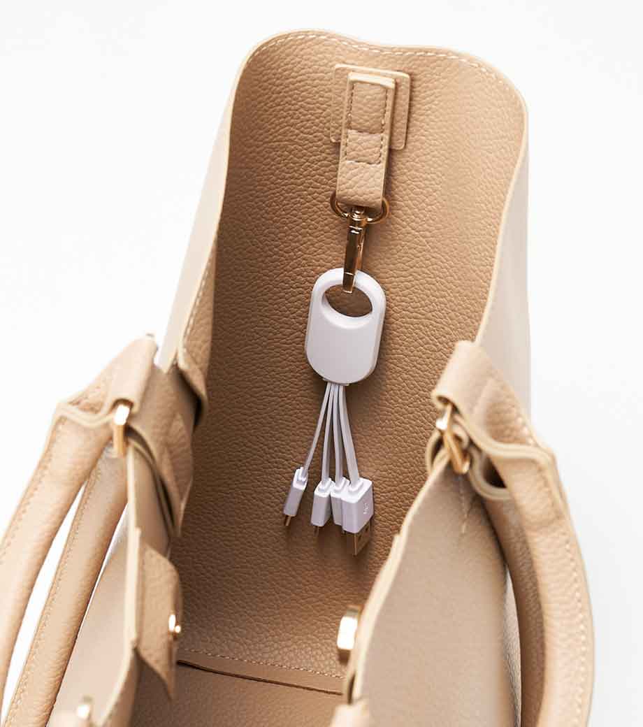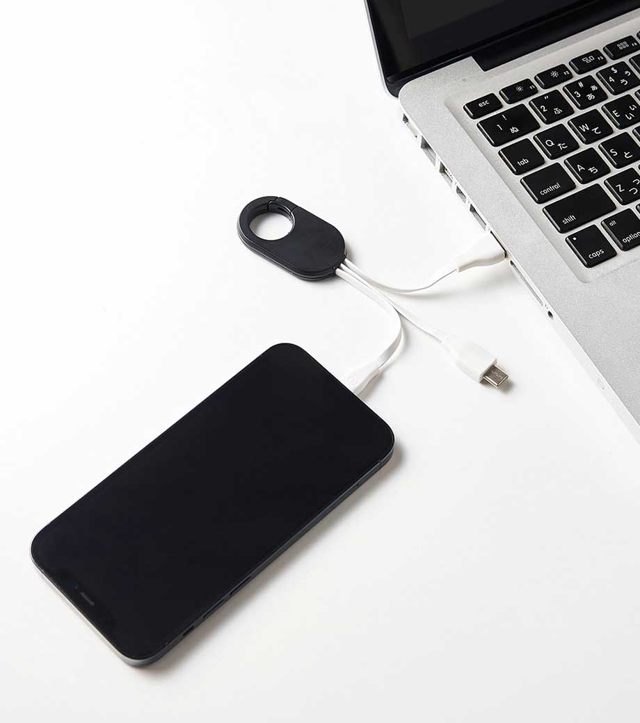 仕事や出張時にこれ1本持っていれば、スマートフォンやタブレットなどをパソコンから充電できます。複数のケーブルを持ち運ぶ必要がなくなって便利!カラビナ部分に1色印刷が可能。イベントや展示会で来場者の興味を引く、一味違ったノベルティが制作できます。