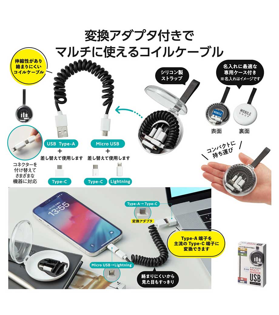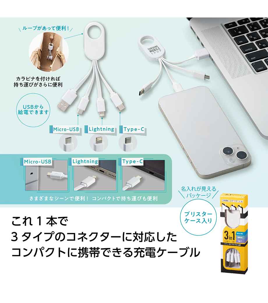 1色名入れ印刷が可能。購入特典や会社説明会、塾の入会特典に。充電ケーブルは日常的に頻繁に使うアイテムなので、販促品としてぴったりです。
