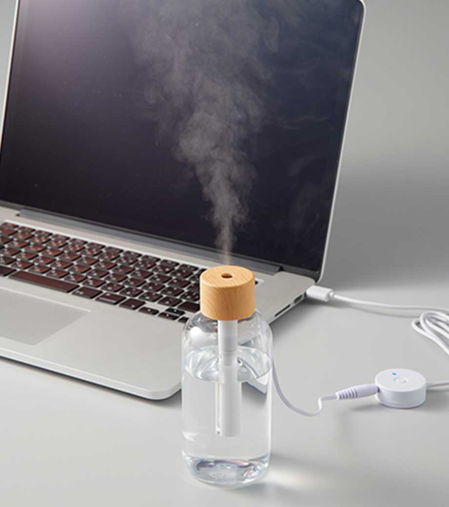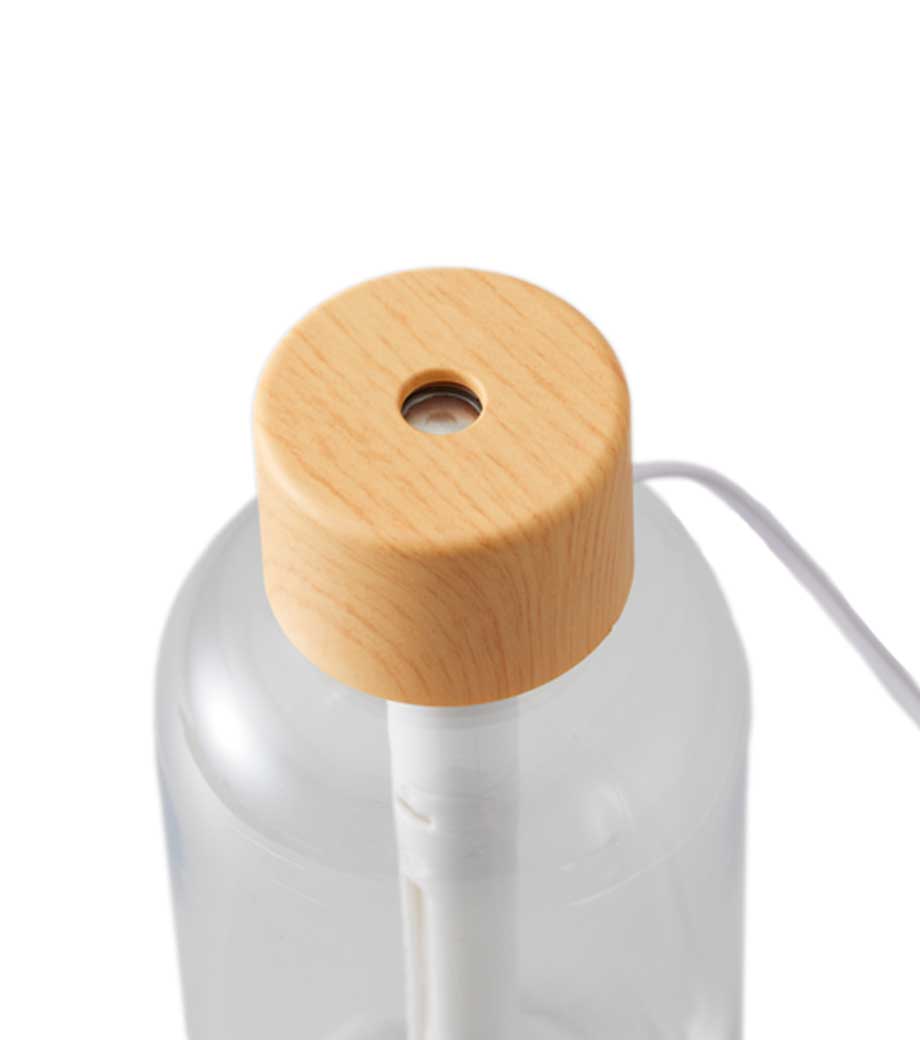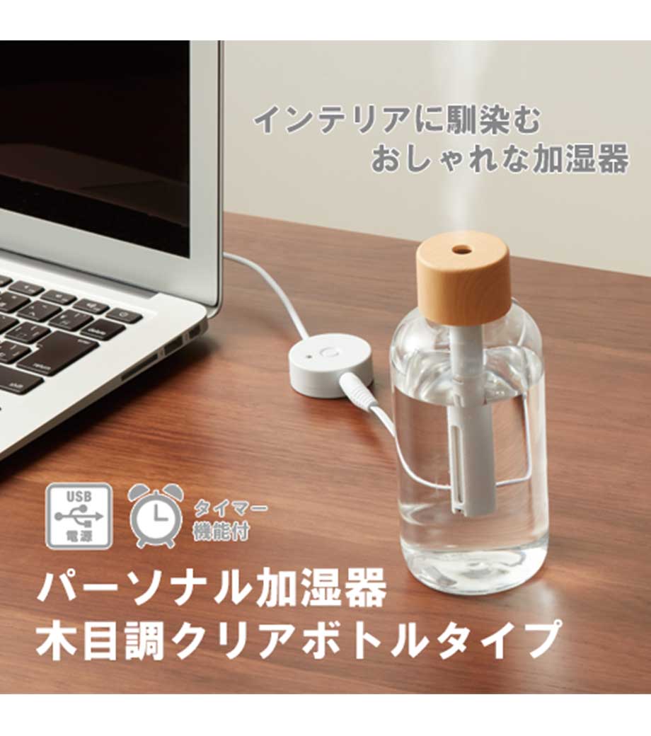 パーソナル加湿器 木目調クリアボトルタイプは木目調のキャップがアクセントのおしゃれな加湿器。パソコンやUSBポート付属機器に接続して、オフィスや寝室などお好きな場所で使用できます。使用中はLEDランプがブルーに点灯。3時間切タイマー機能付きで空焚きを防止してくれます。