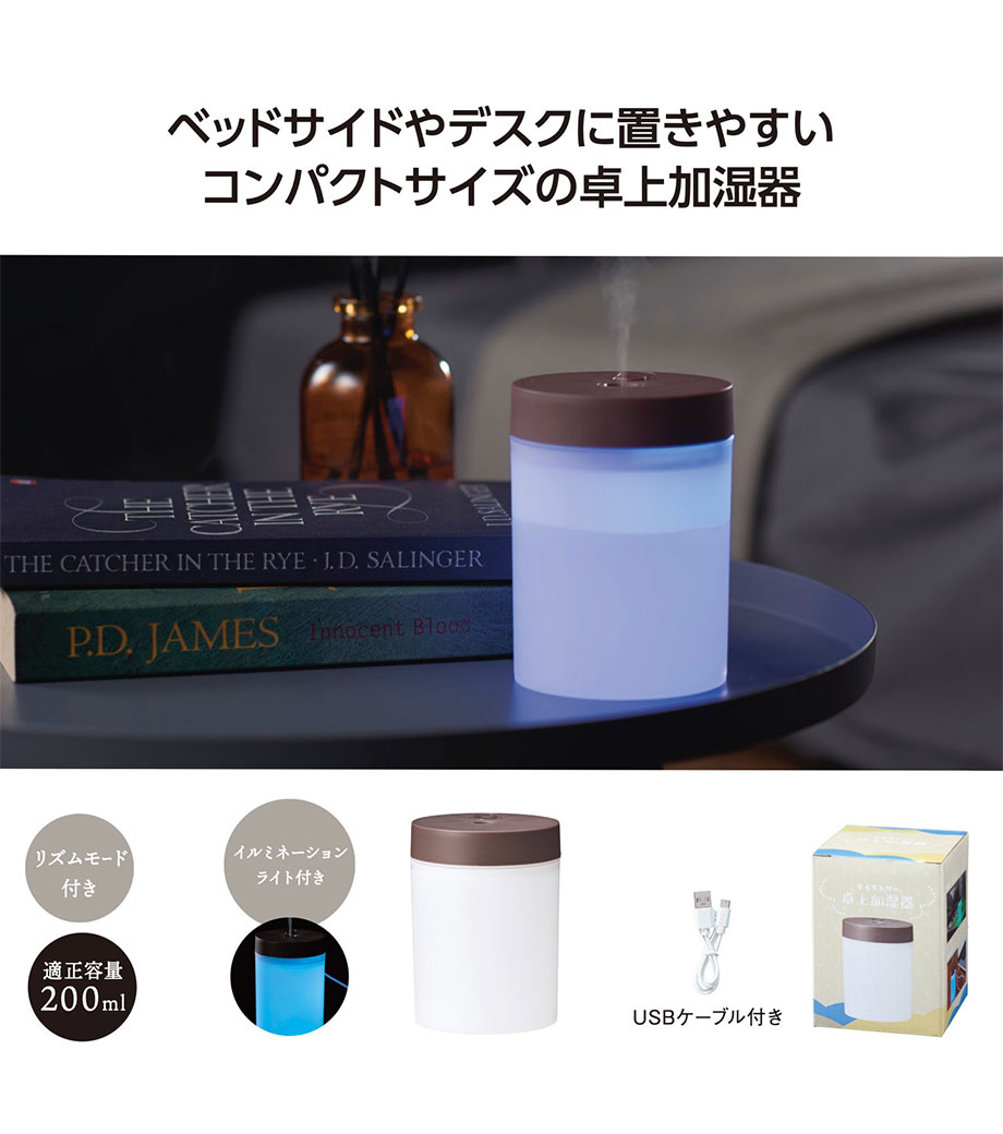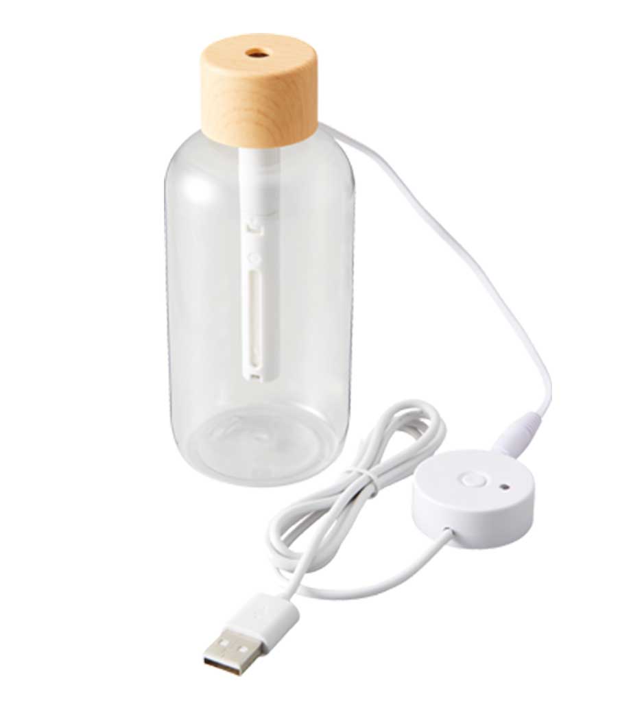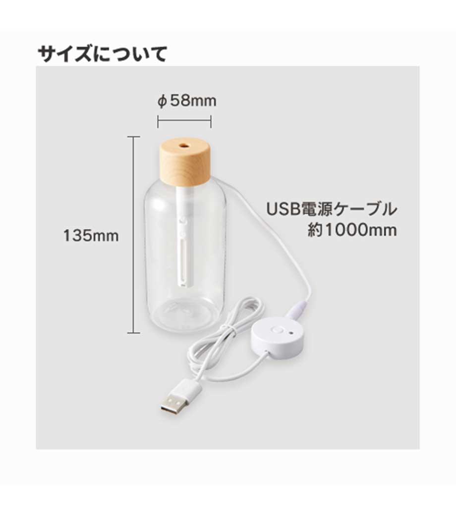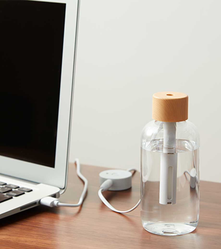 パーソナル加湿器 木目調クリアボトルタイプは木目調のキャップがアクセントのおしゃれな加湿器。パソコンやUSBポート付属機器に接続して、オフィスや寝室などお好きな場所で使用できます。使用中はLEDランプがブルーに点灯。3時間切タイマー機能付きで空焚きを防止してくれます。