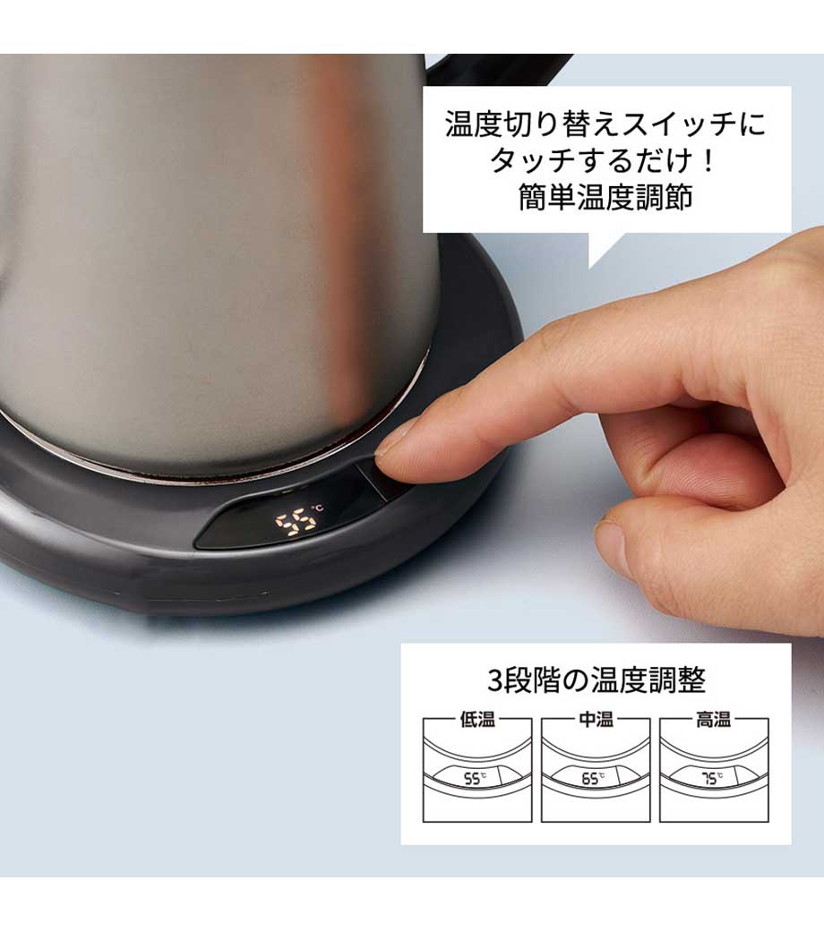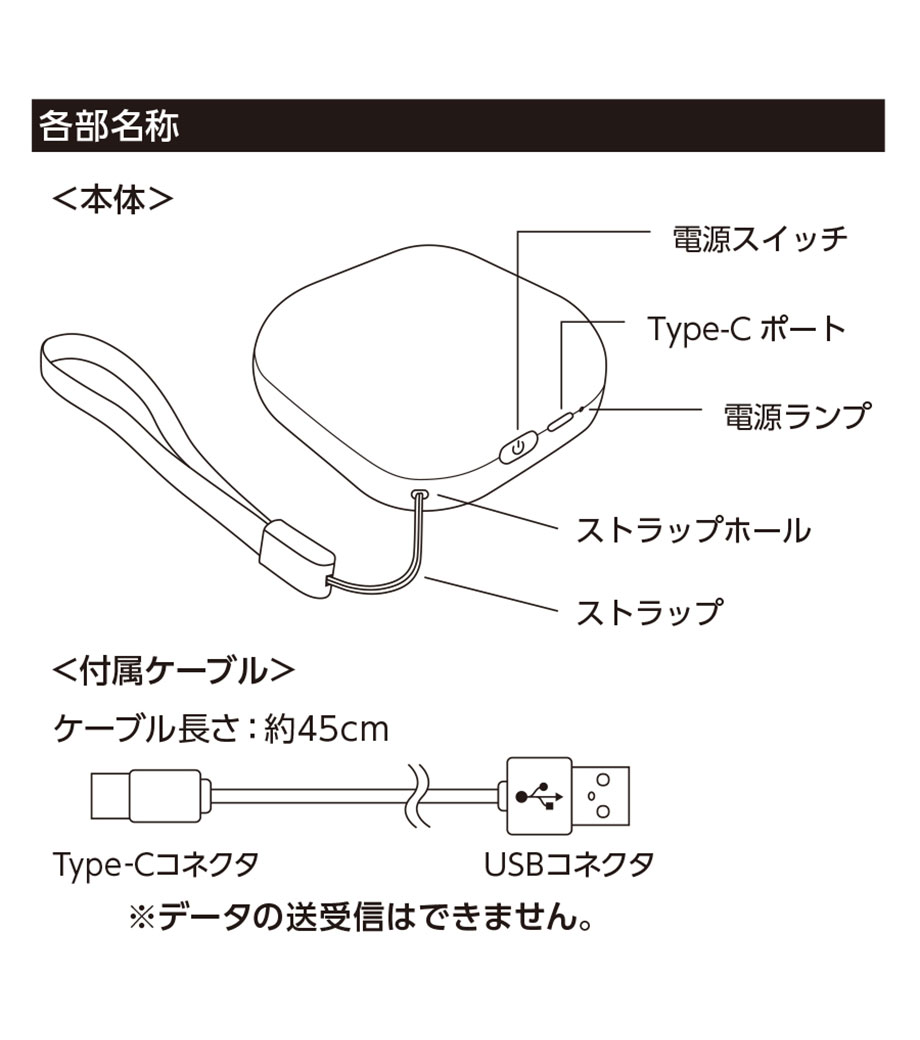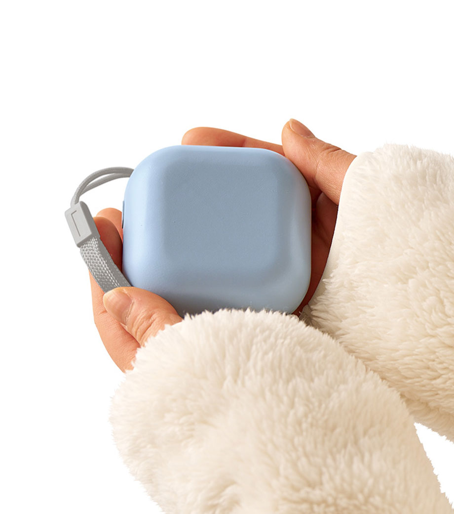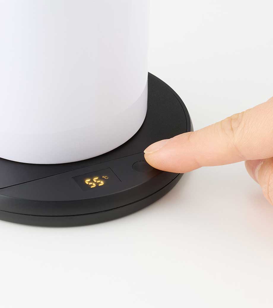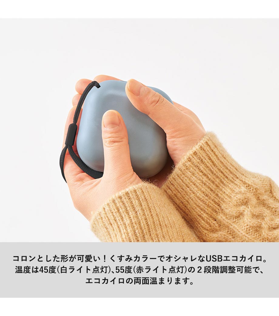 コロンとしたフォルムがかわいらしいカイロです。温度は約45度と約55度の2段階調整が可能。ストラップ付きで、持ち歩きにも便利です。両面が温まるので寒さ対策にぴったり!ベーシックなブラック・ホワイトに加え、くすみカラーがおしゃれなブルーの3色展開です。
