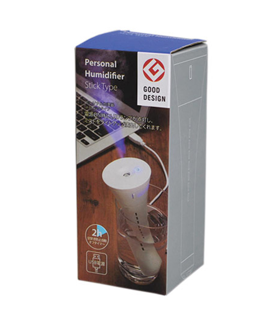 パーソナル加湿器スティックタイプはタンクレスの超音波式加湿器。使用時はライトが点灯します。USB接続でご利用いただけるので、パソコンやUSBポート付属機器に接続して、オフィスや寝室どこでもご利用可能。1色印刷で店舗・企業ロゴでオリジナルの加湿器を制作できます。ホテルや旅館での備品や旅行関係での記念品、ノベルティとしても大人気です。2013年にグッドデザイン賞受賞。自信持ってオススメできる持ち運びにも便利な加湿器です。