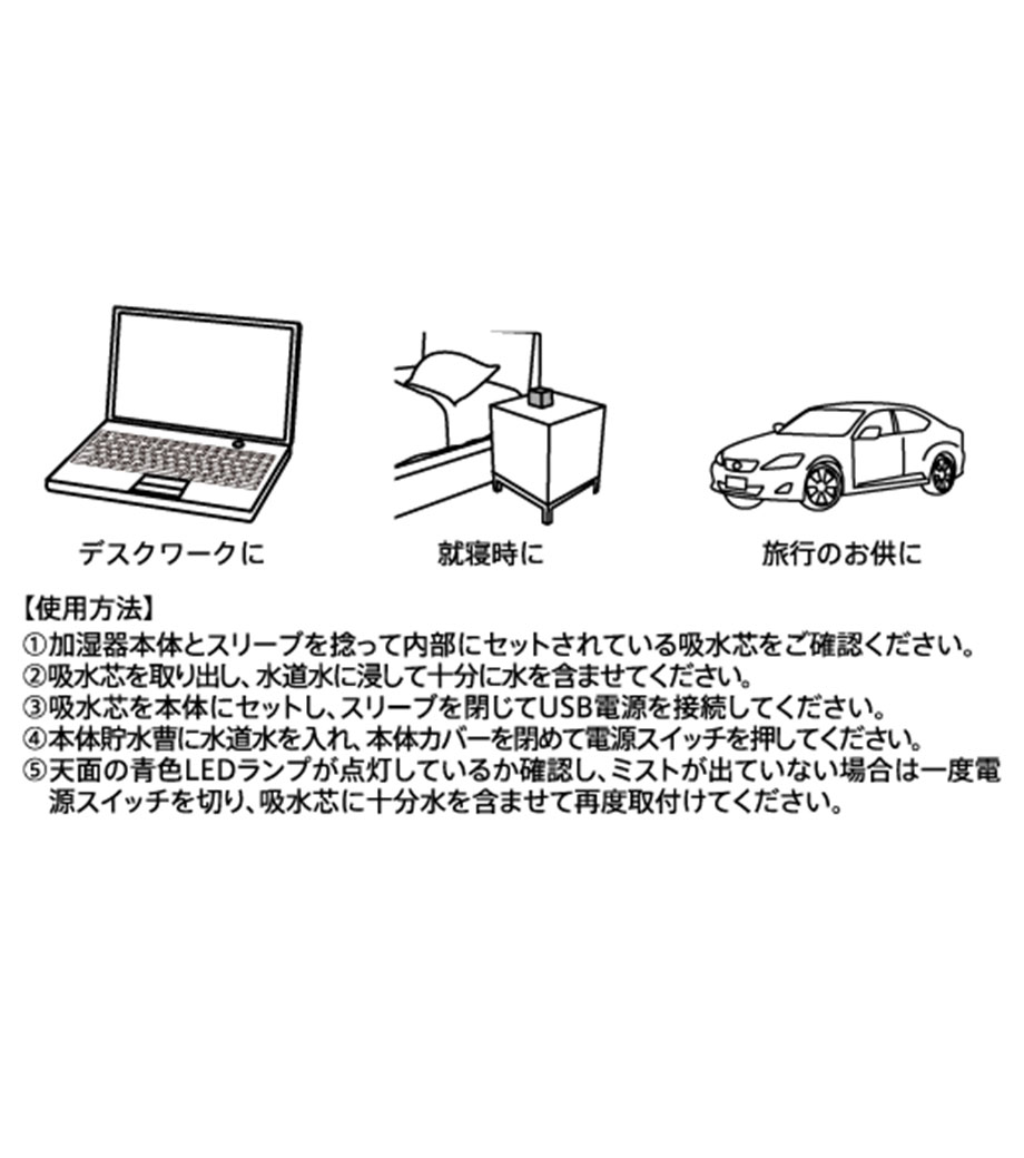 タンク式で約3時間分の貯水が可能です。USB接続でご利用いただけるので、パソコンやUSBポート付属機器に接続して、オフィスや寝室どこでもご利用可能。2時間タイマー性なので空焚き防止もバッチリなのです。ベッドサイドに置いていても安心して就寝できますね。