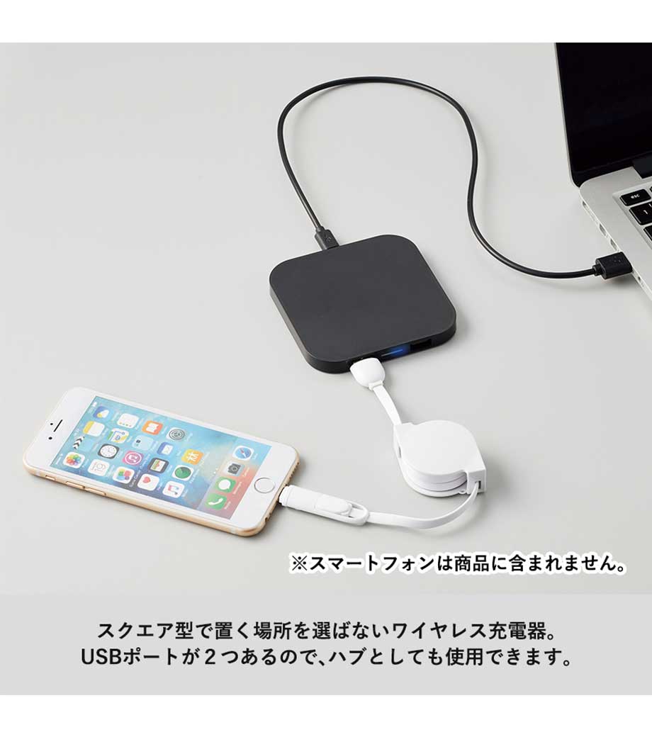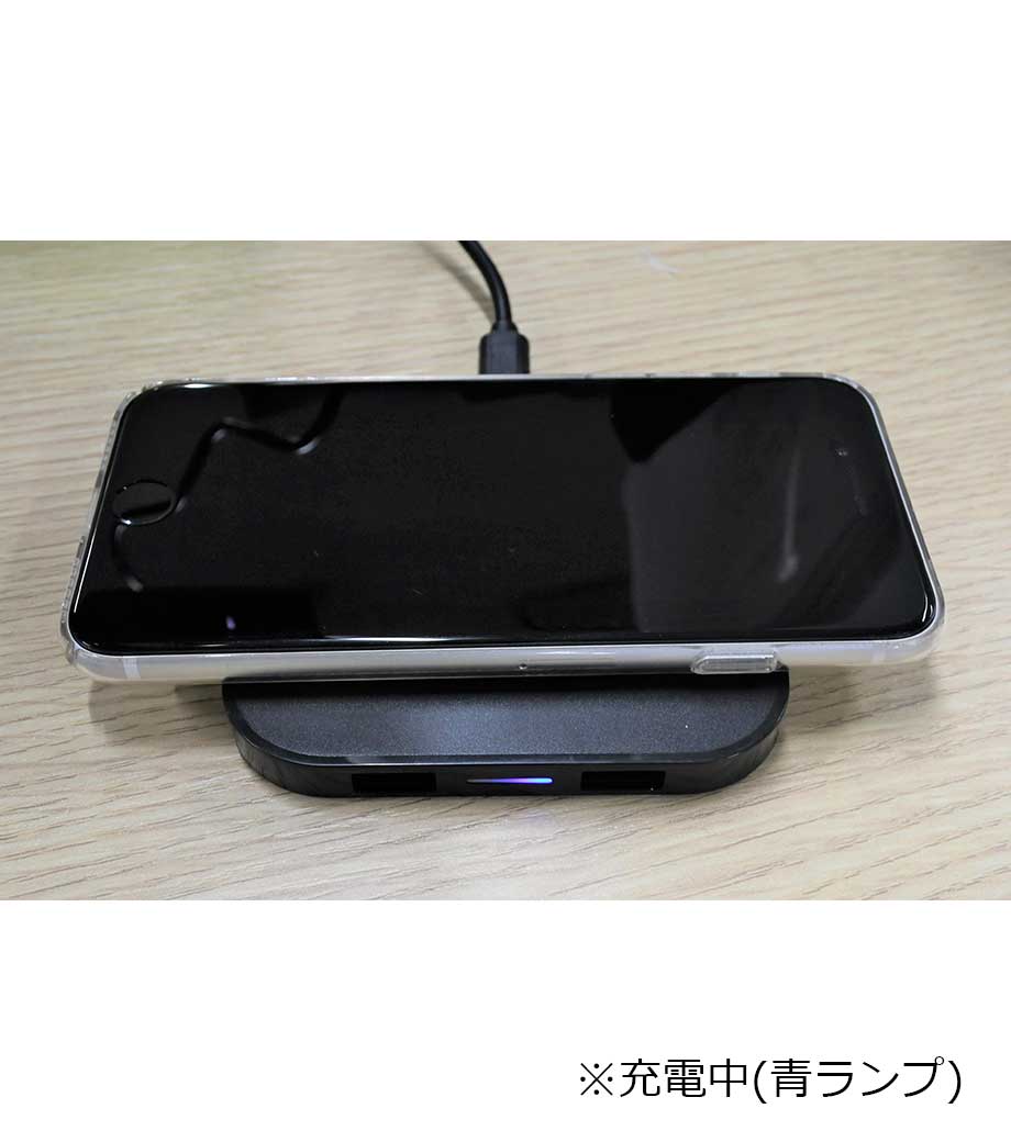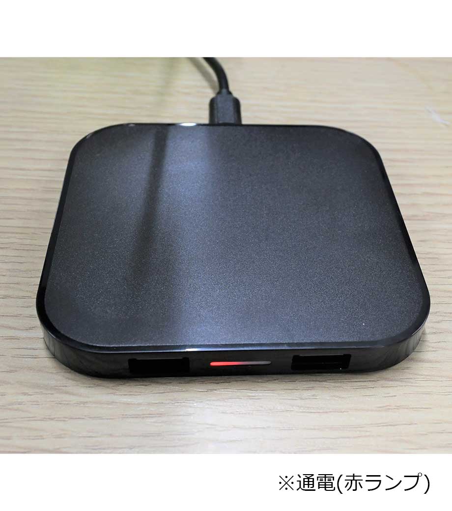 Qi(チー)対応ワイヤレス充電器スクエア5Wは、スマートフォンを置くだけで充電出来るアイテムです。USBポートが2つあるので、ハブとしても使用できパソコンのUSBポートが少ない方にもオススメです。通電と充電はランプの色でさりげなく確認ができるのも嬉しいポイント。赤が通電、青が充電中です。