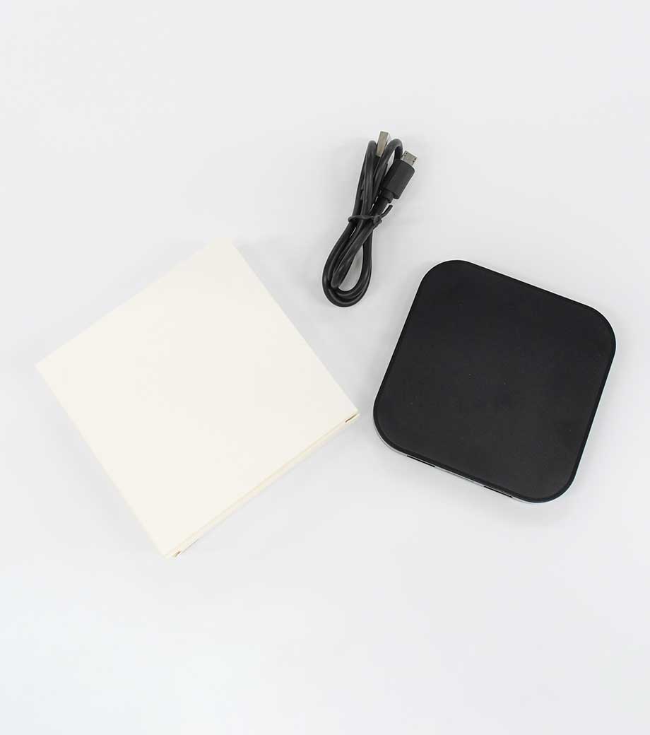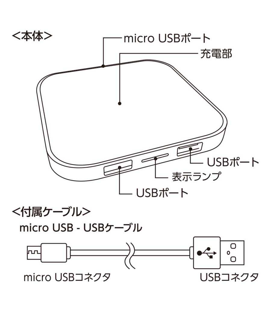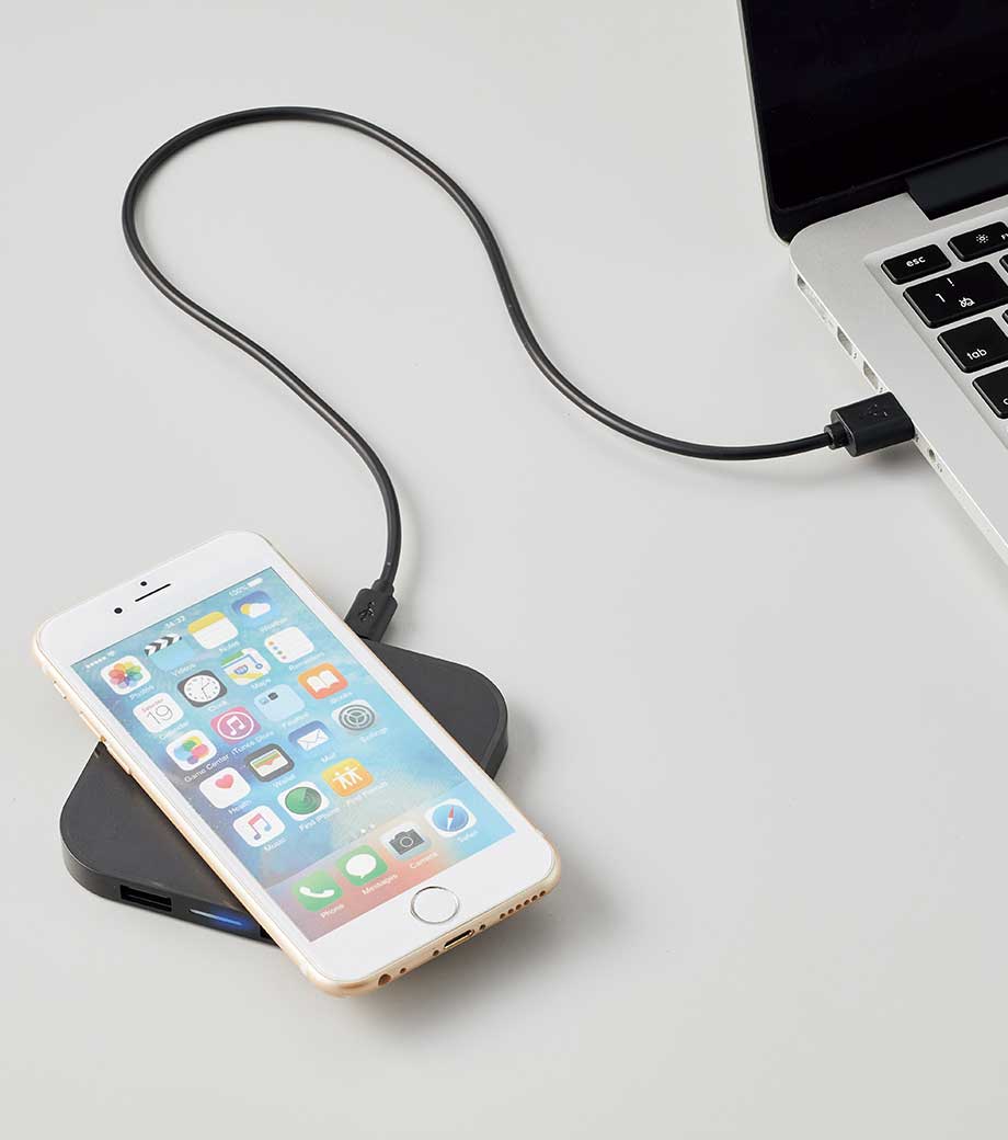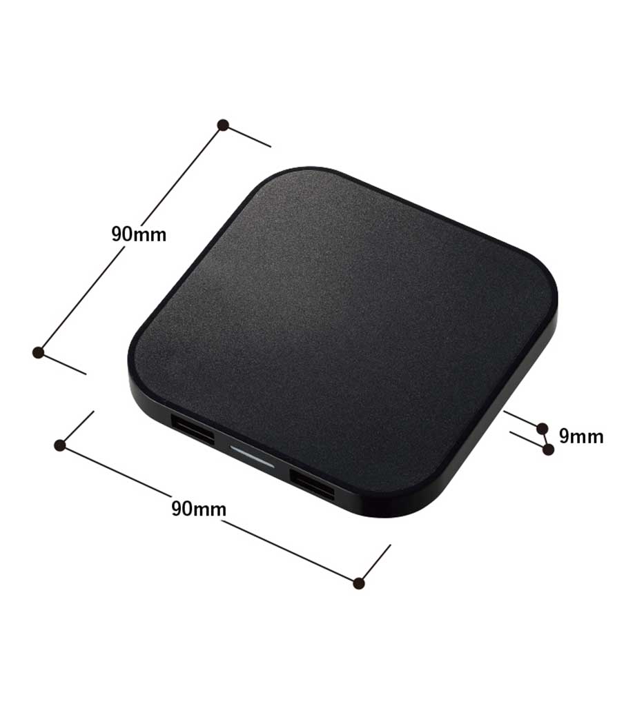 Qi(チー)対応ワイヤレス充電器スクエア5Wは、スマートフォンを置くだけで充電出来るアイテムです。USBポートが2つあるので、ハブとしても使用できパソコンのUSBポートが少ない方にもオススメです。通電と充電はランプの色でさりげなく確認ができるのも嬉しいポイント。赤が通電、青が充電中です。