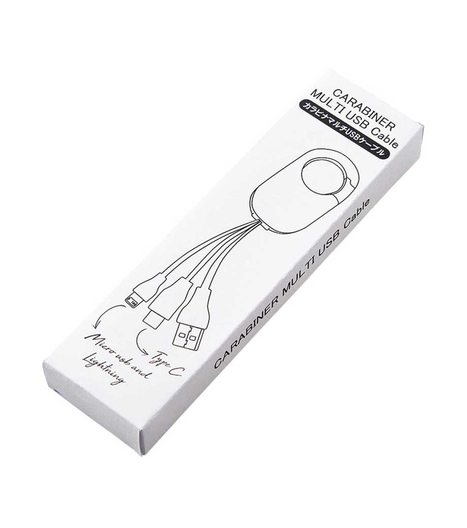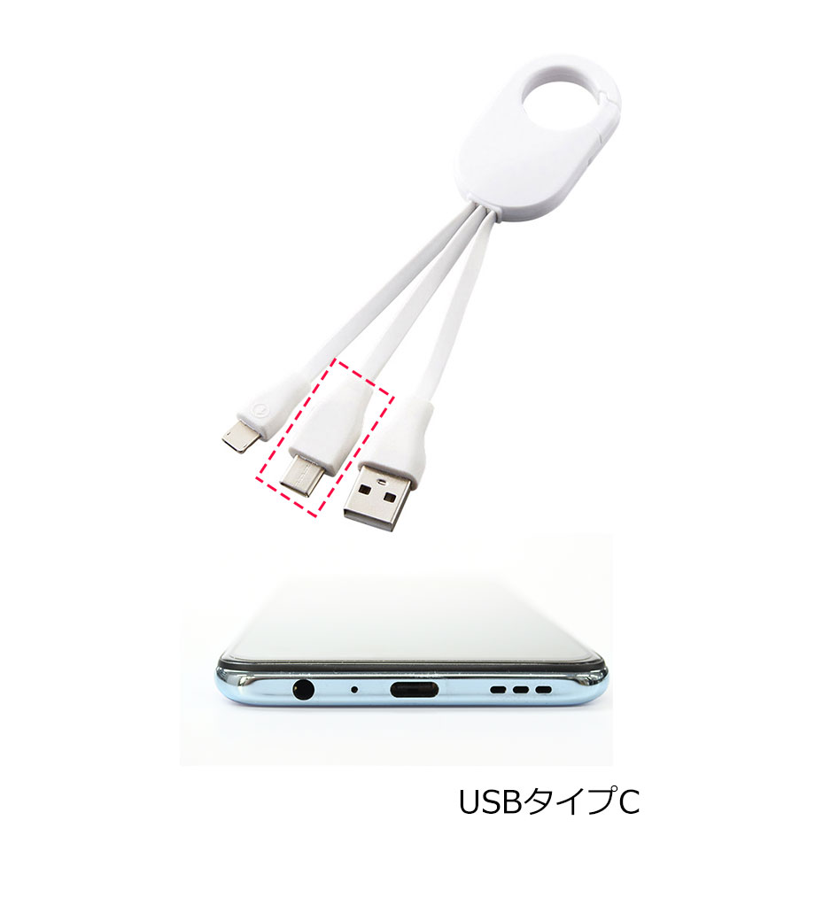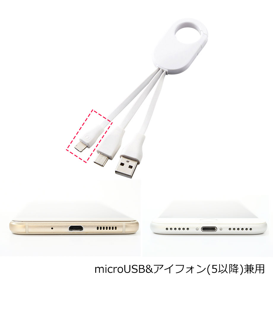 カラビナマルチUSBケーブルは、3種類の端末に対応可能なUSBケーブル。端子はUSBタイプA、USBタイプC、microUSB&iPhone(5以降)兼用の3種類です。USBタイプAは、PCに接続する標準的なUSBコネクタ。USBタイプCはMacBookやAndroidスマホに接続します。microUSB&iPhone(5以降)兼用は、iphone5以降のスマホに接続できます。