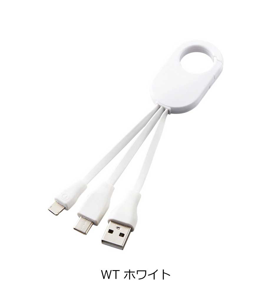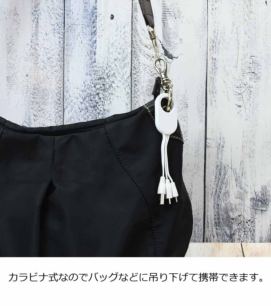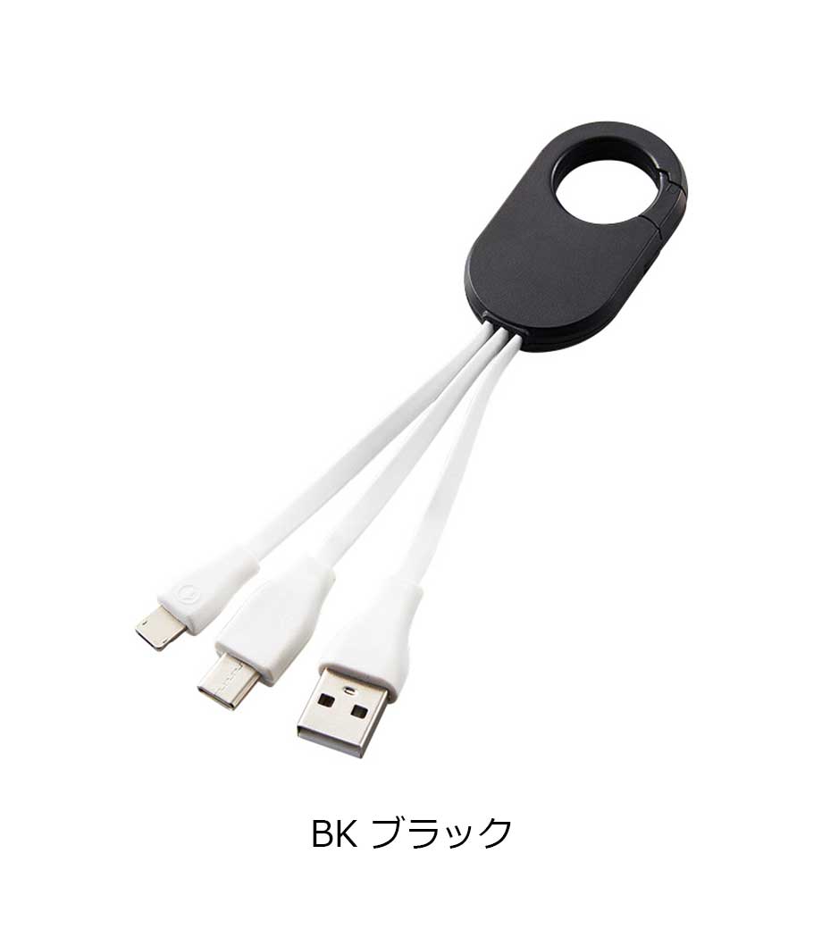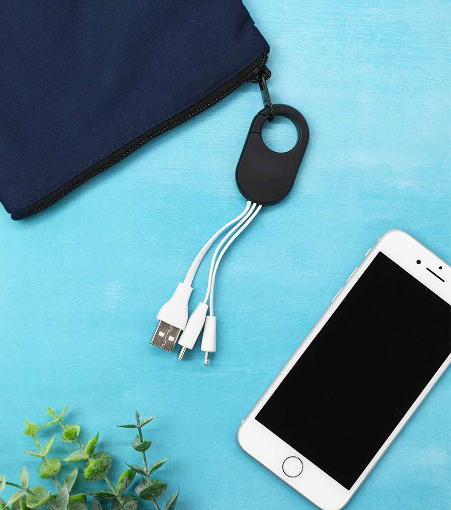 カラビナマルチUSBケーブルは、3種類の端末に対応可能なUSBケーブル。端子はUSBタイプA、USBタイプC、microUSB&iPhone(5以降)兼用の3種類です。USBタイプAは、PCに接続する標準的なUSBコネクタ。USBタイプCはMacBookやAndroidスマホに接続します。microUSB&iPhone(5以降)兼用は、iphone5以降のスマホに接続できます。