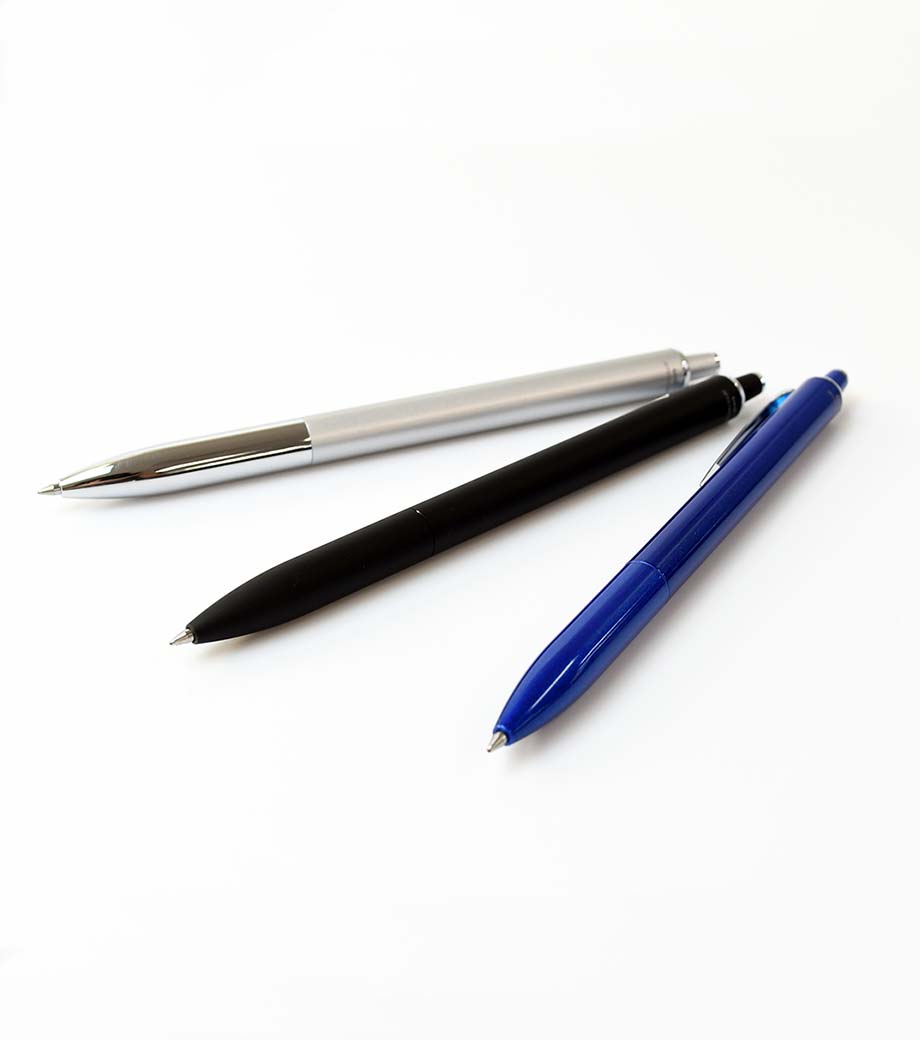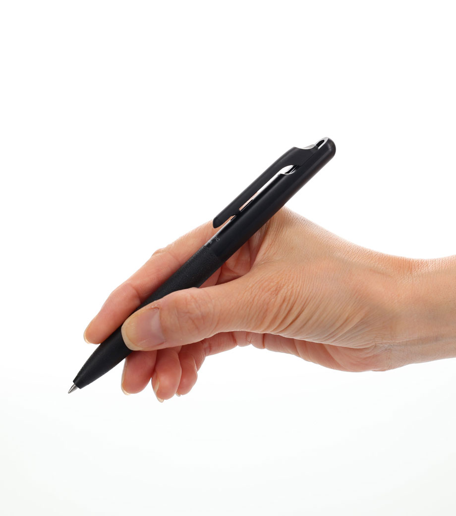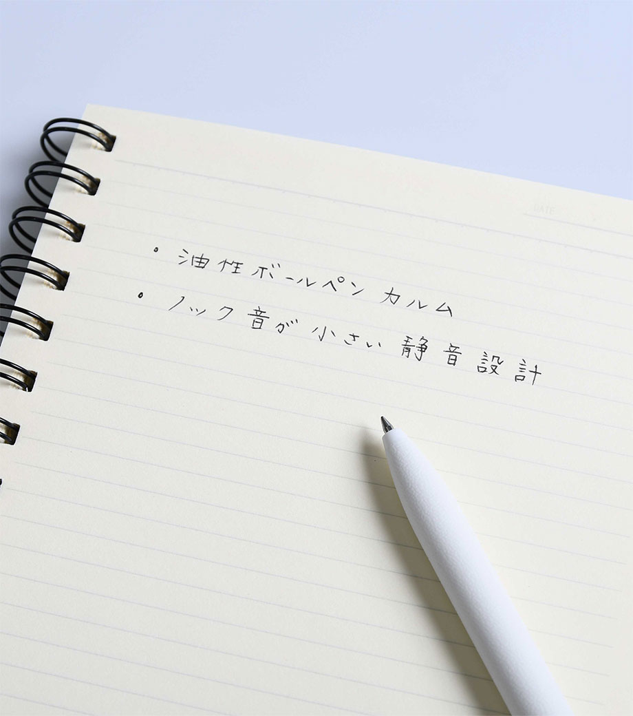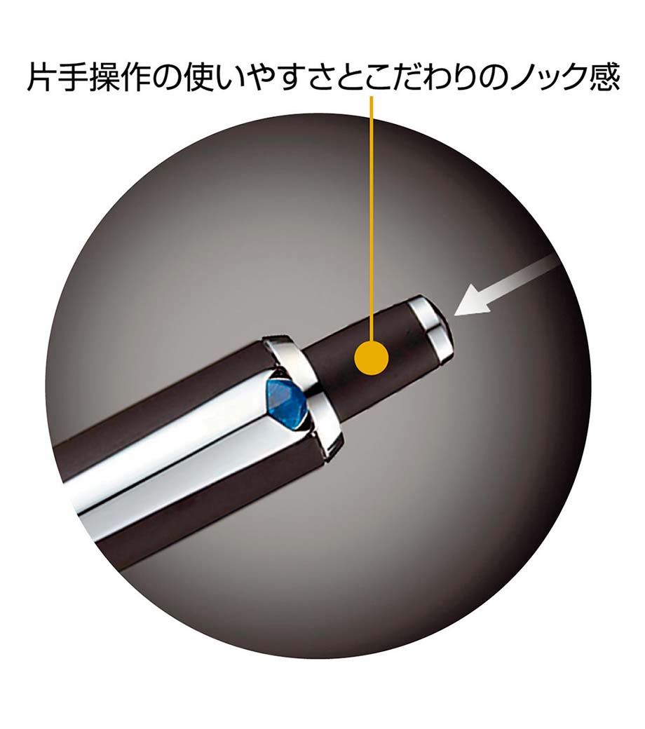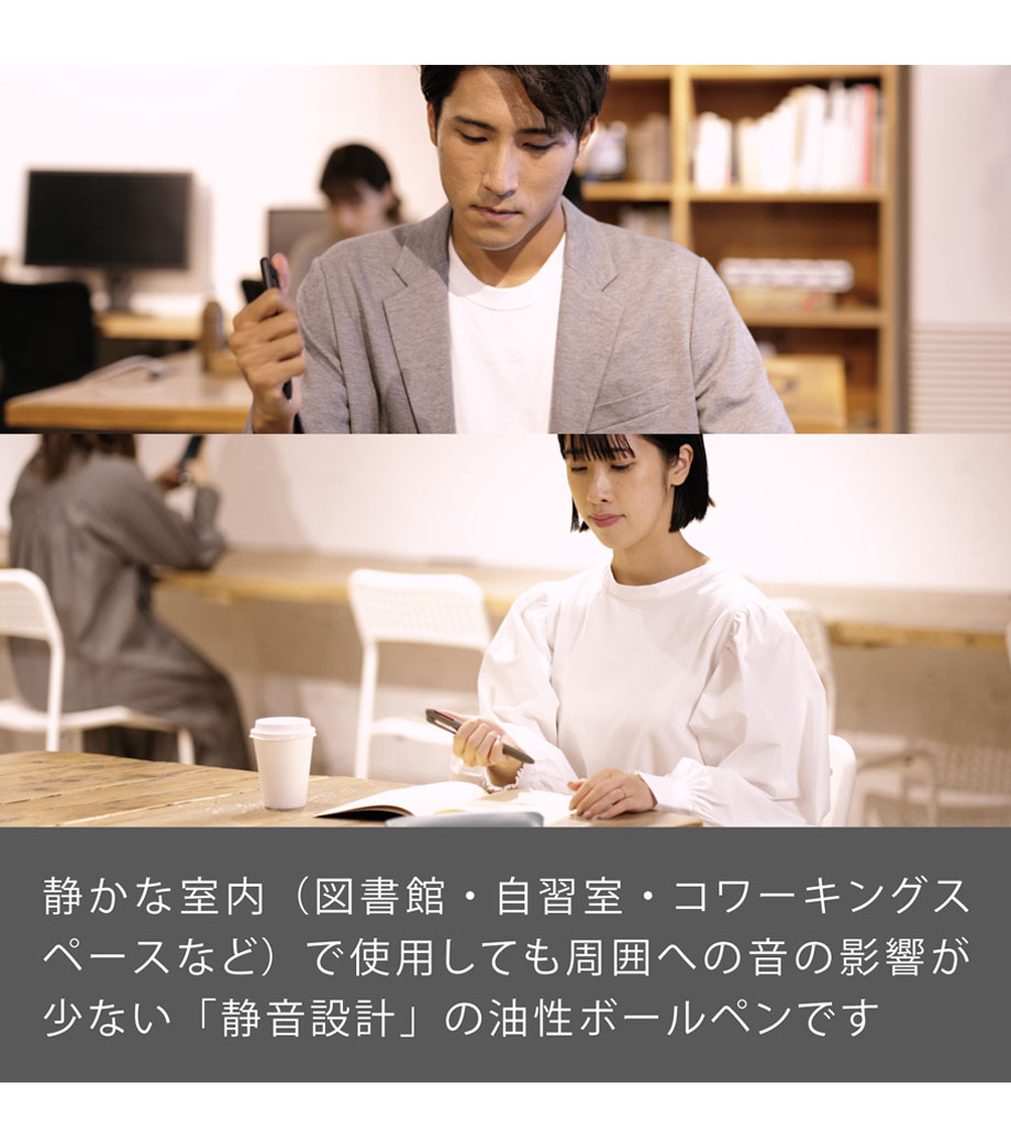 利便性の高いノック式は片手でスマートに操作できるので忙しいビジネスマンに嬉しいアイテム。ノック音やノック感はやわらかく、音が響かないので大事な会議や商談中も使いやすく便利です。本体色はベーシックで使いやすいブラック、ネイビー、シルバーの3種をご用意。