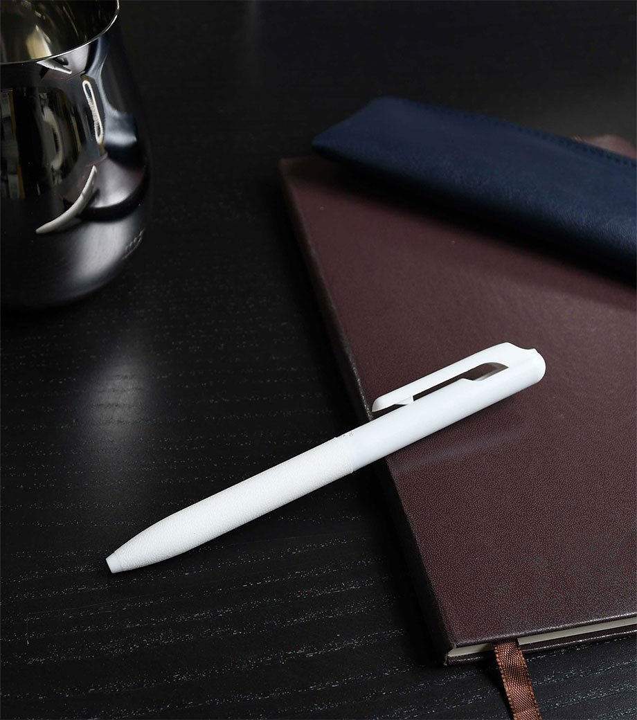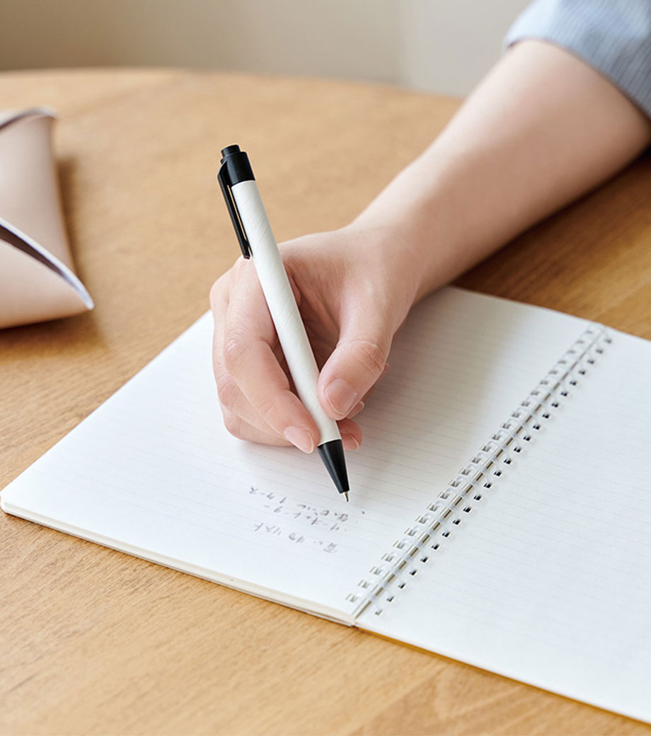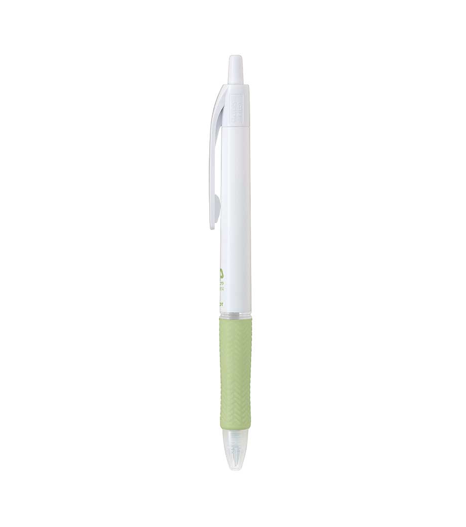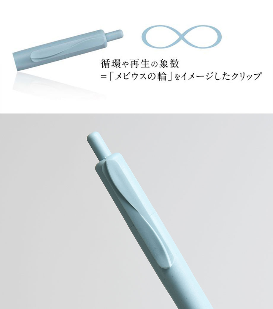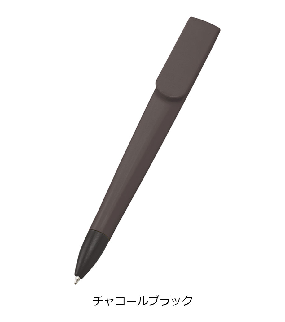 ノートに挟んで持ち運びに便利なボールペン。しおり代わりに開きたいページもすぐに確認できます。素材に不要になったABSを再利用した、環境に優しいサスティナブルな商品です。企業カラーやスクールカラーに合わせボディカラーが選べるのも魅力。ペン先は回転繰り出し式なので、音がほとんどせず静かです。