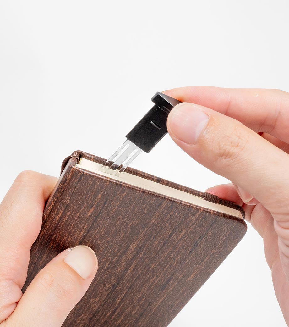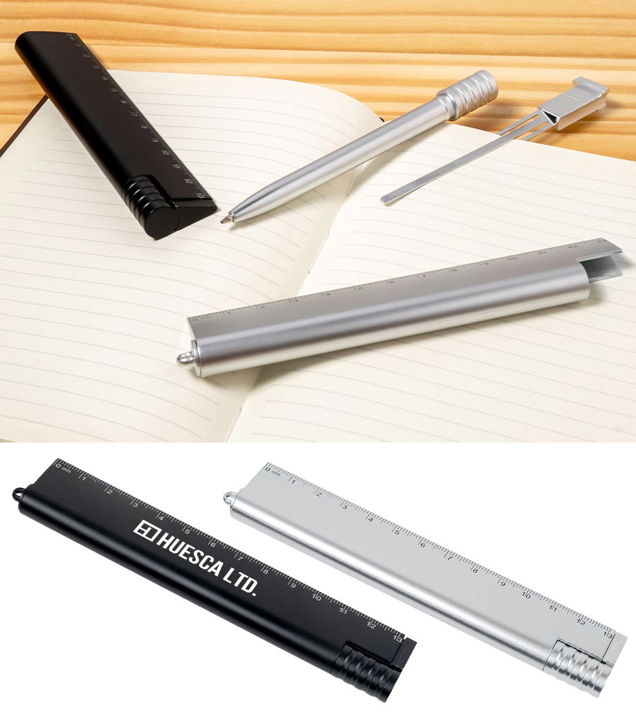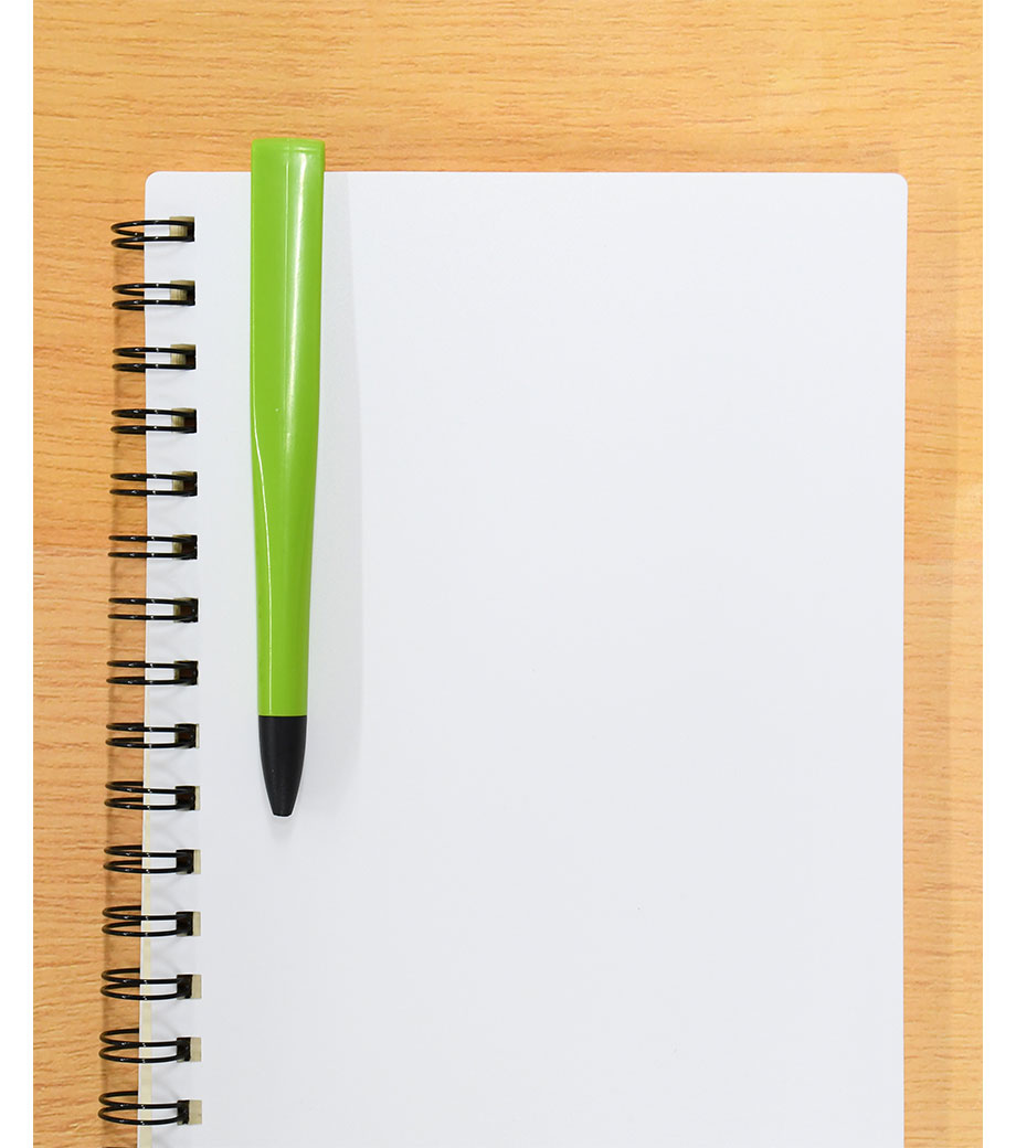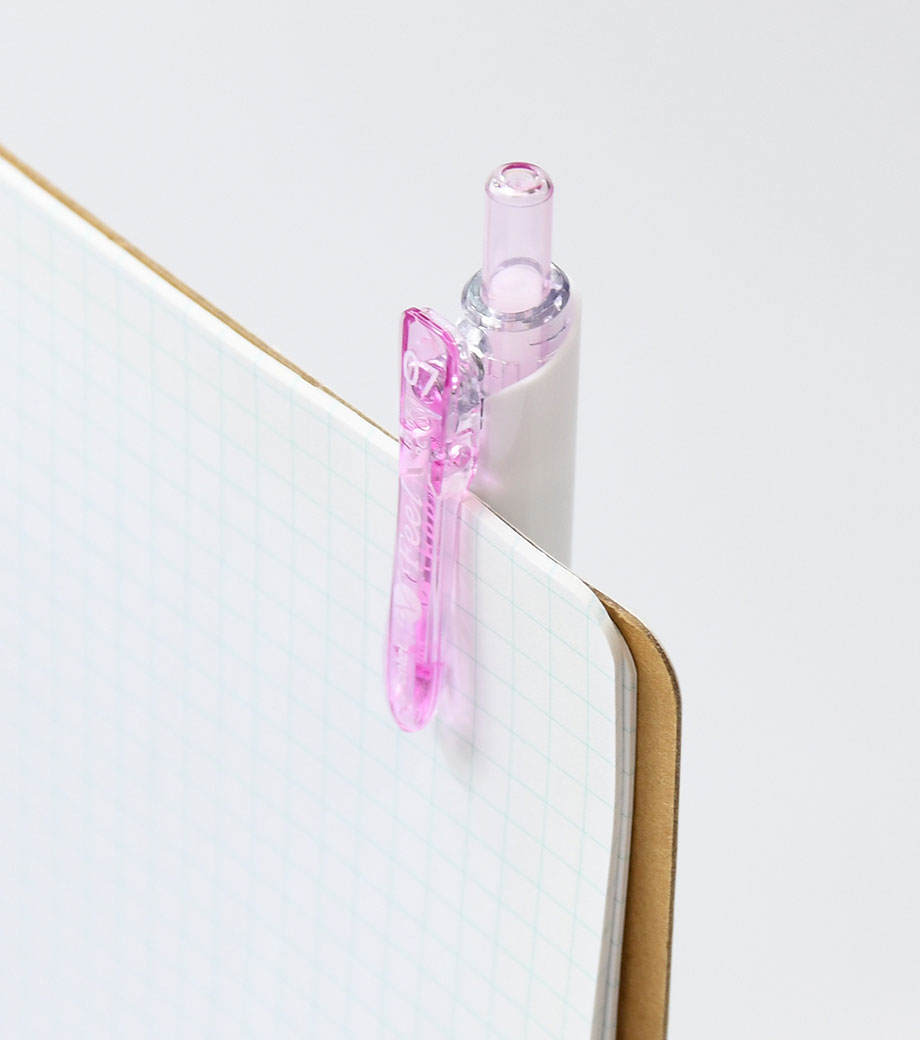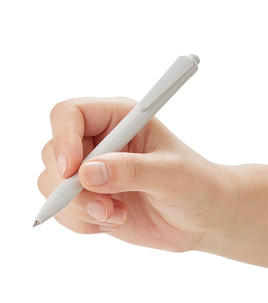 ノートに挟んで持ち運びに便利なボールペン。しおり代わりに開きたいページもすぐに確認できます。素材に不要になったABSを再利用した、環境に優しいサスティナブルな商品です。企業カラーやスクールカラーに合わせボディカラーが選べるのも魅力。ペン先は回転繰り出し式なので、音がほとんどせず静かです。