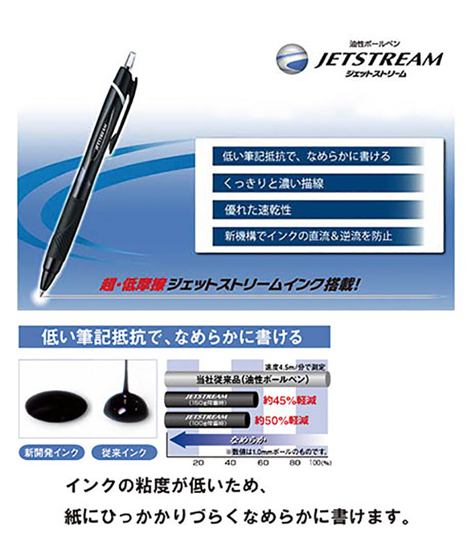 ジェットストリーム プライム ノック式シングル 0.7mmは超・低摩擦ジェットストリームインクを搭載。低い筆記抵抗でなめらかに書けます。くっきりと濃い描線なのに優れた速乾性なので、手が汚れるというストレスがありません。