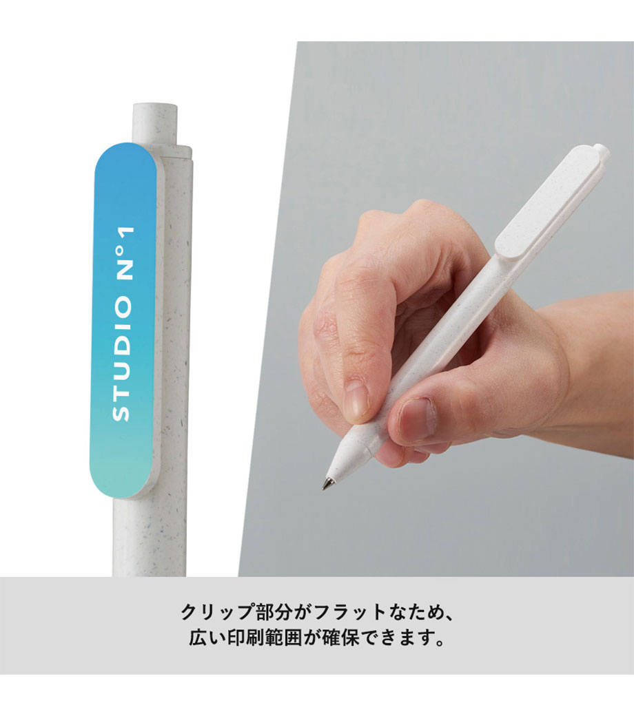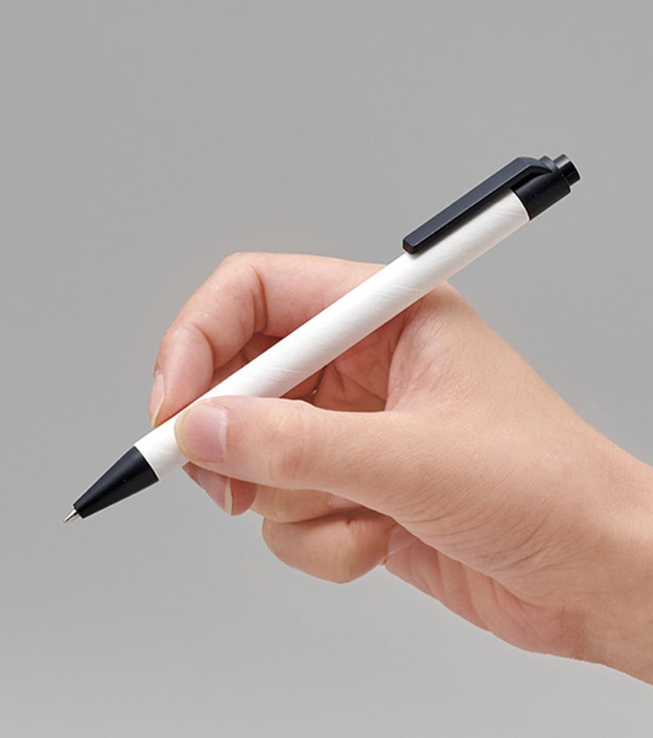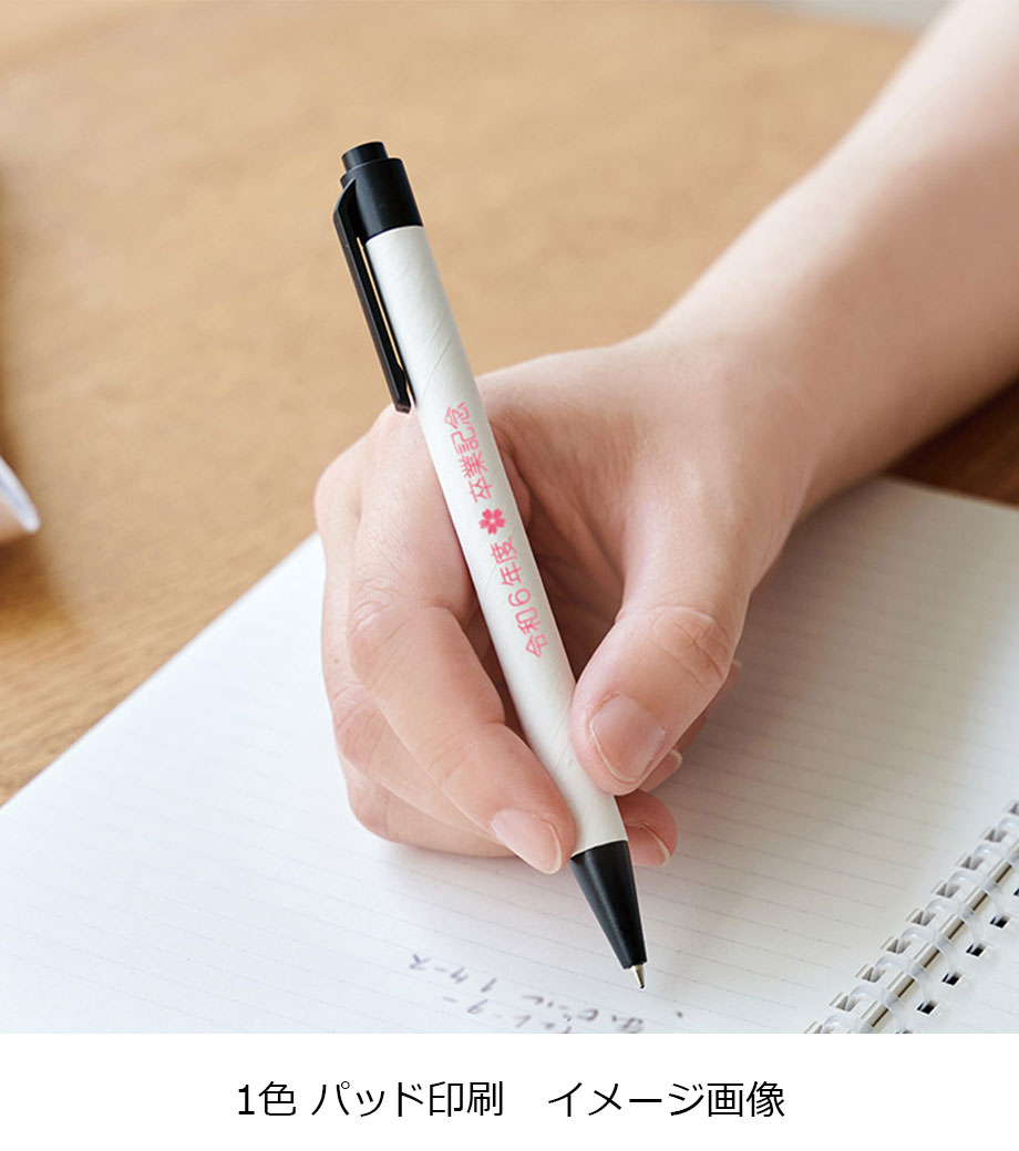 安価で配布しやすいため、説明会や展示会のノベルティに最適。ボディにはシンプルな1色印刷や、目を引くフルカラー印刷も可能です。廃棄物削減や合成樹脂の使用量を抑えるアップサイクル商品として、環境意識の高い企業やイベントにもぴったりの一本です。