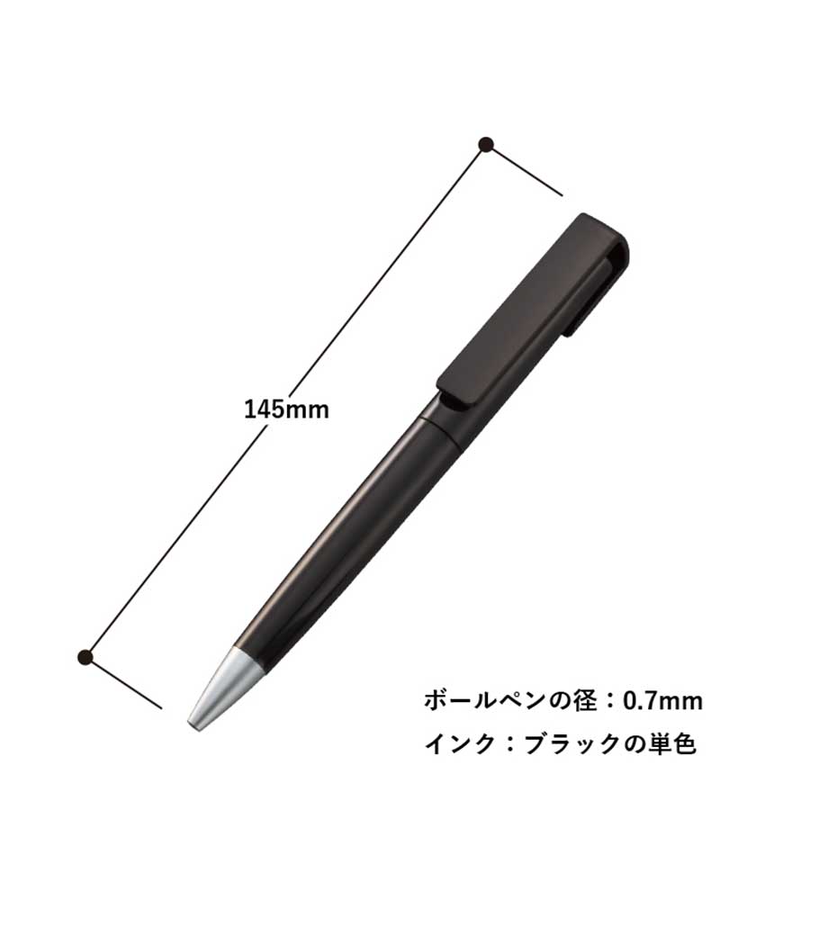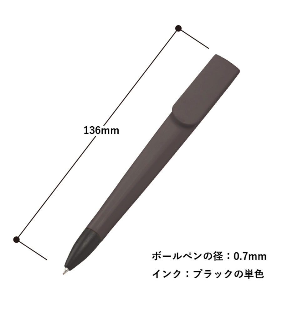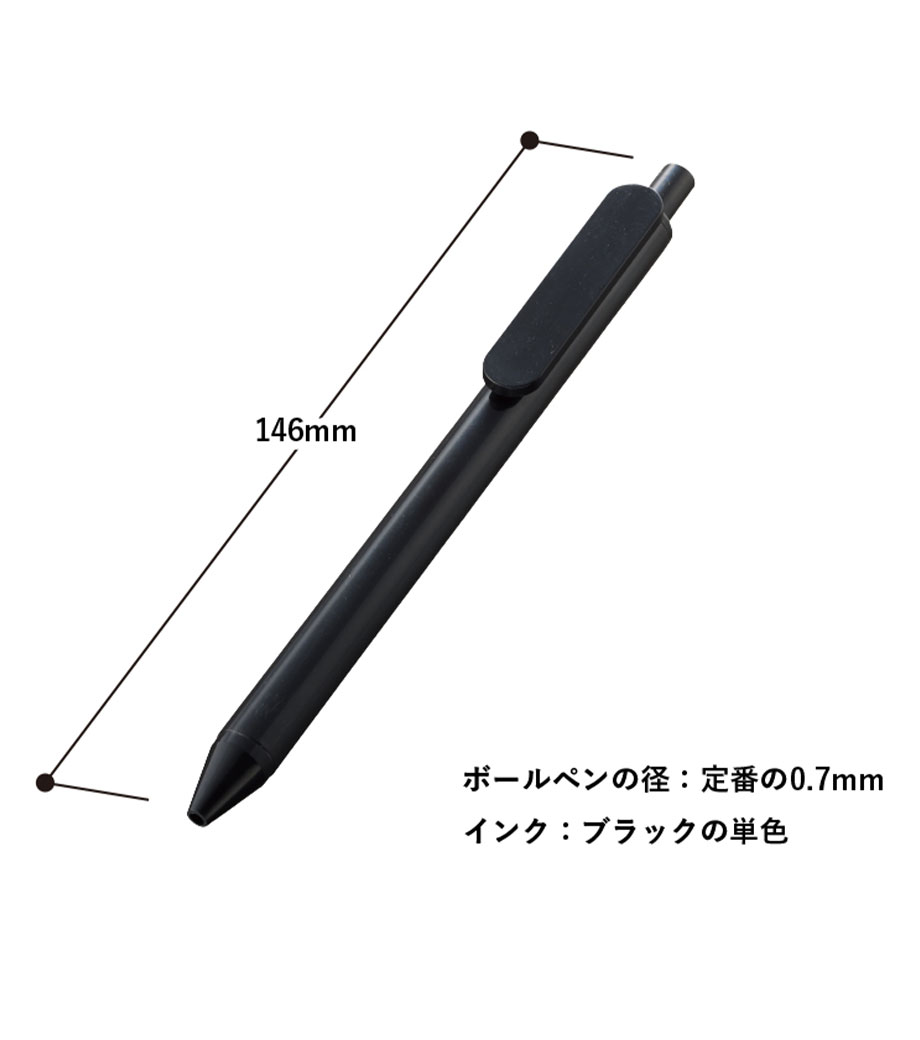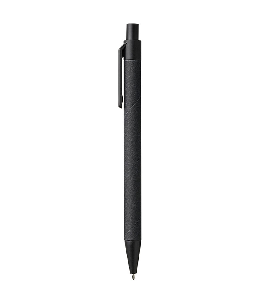 シャープな印象のメタリックボディのボールペン。本体をひねるとペン先が出てくるスタイリッシュな仕様で、側面のクリップはノートやメモ帳にしっかりと挟めます。不要になった廃プラスチックを再利用することで二酸化炭素を削減できます。環境に配慮したサスティナブルな商品です。