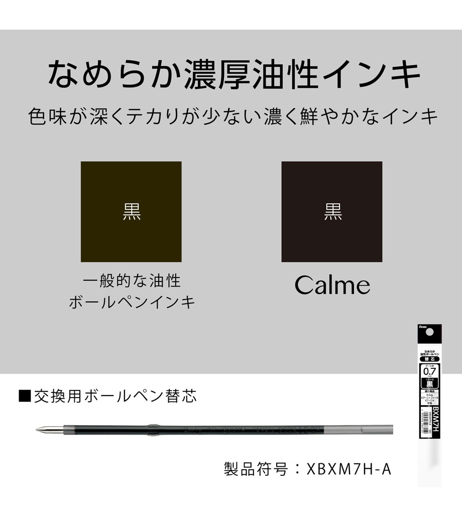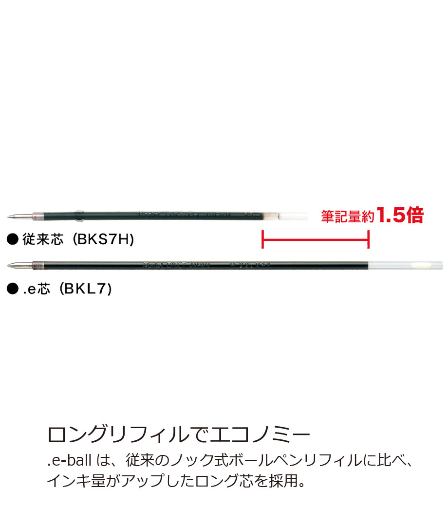 ぺんてる ドット・イー ボールペンは、しっかりホールドできるロングラバーグリップを採用。すべりにくく、指にしっくりフィットします。黒インクのペン先はオフィスで使いやすい0.7mm。従来のノック式ボールペンリフィルに比べ、インク量がアップしたロング芯を採用しているので、インクが長持ちします。バツグンの書きやすさで一度使うと手放せなくなる人続出のボールペンです。