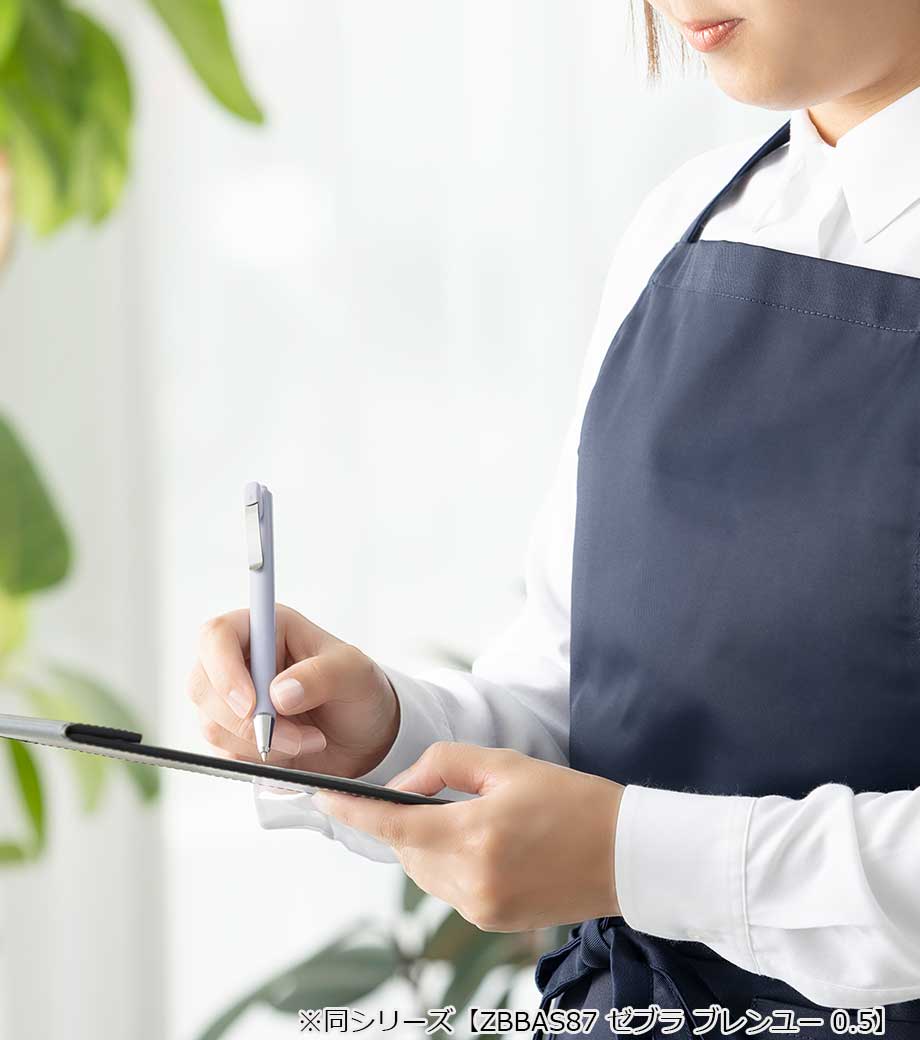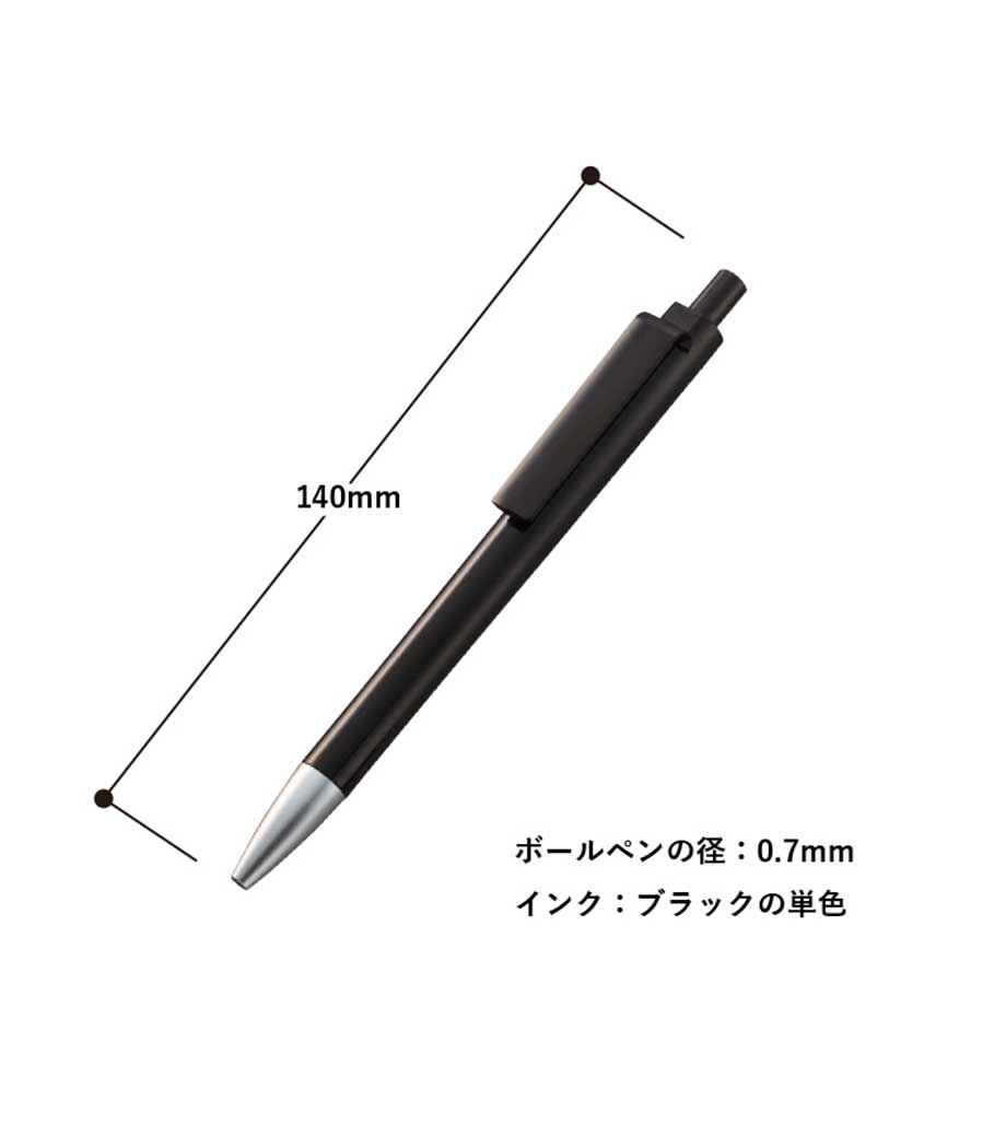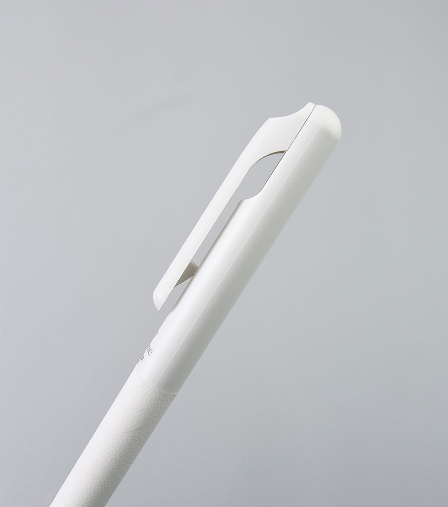 軽い力でもブレずに濃い文字が書ける、ペン先0.7mmの油性ボールペン。接客時など立ったままの筆記に重宝します。丈夫でスタイリッシュな金属クリップ。可動部にスプリング搭載してあるので軽い力で挟みやすく、薄いのでノートに挟んでもスッキリ納まります。