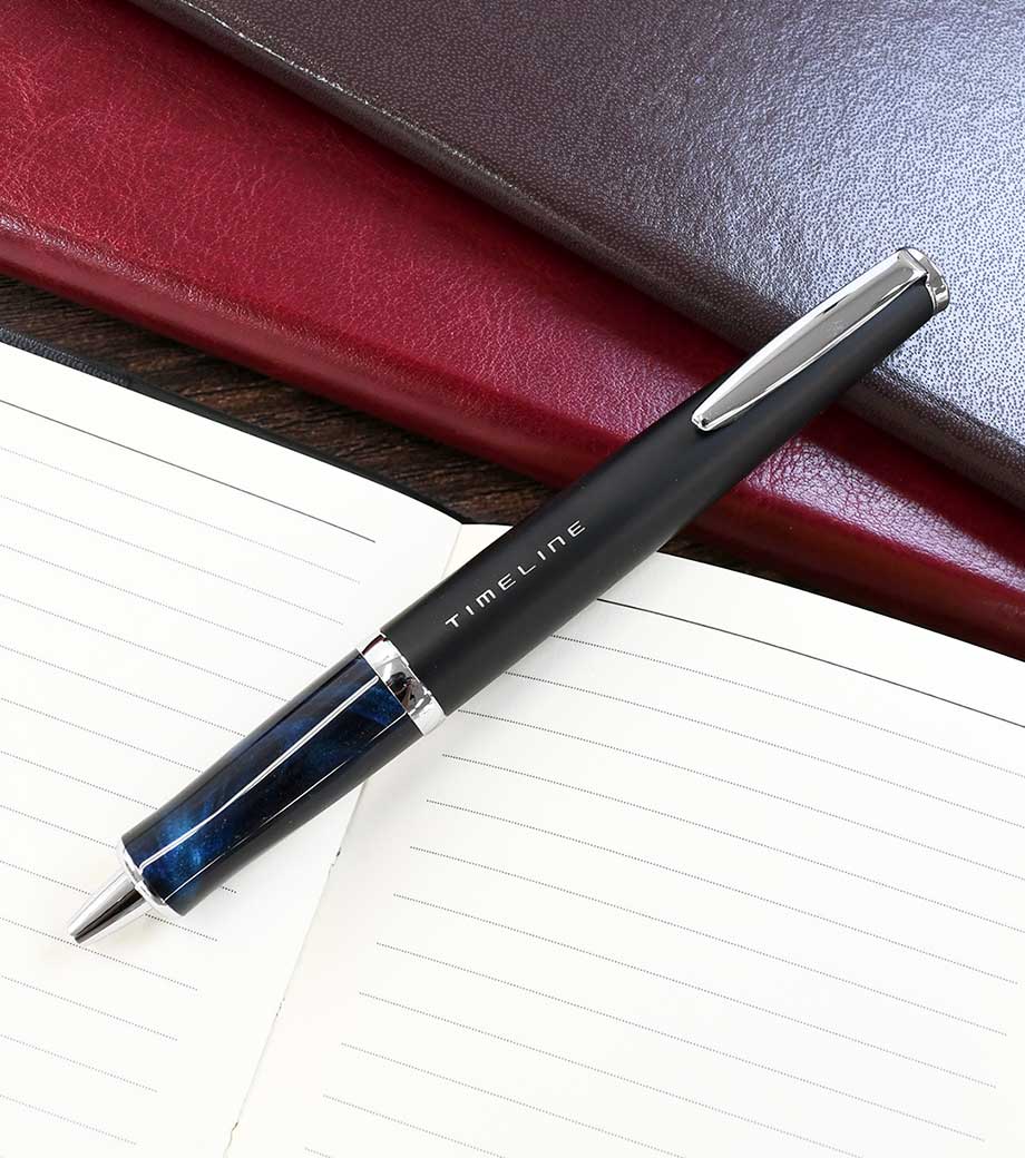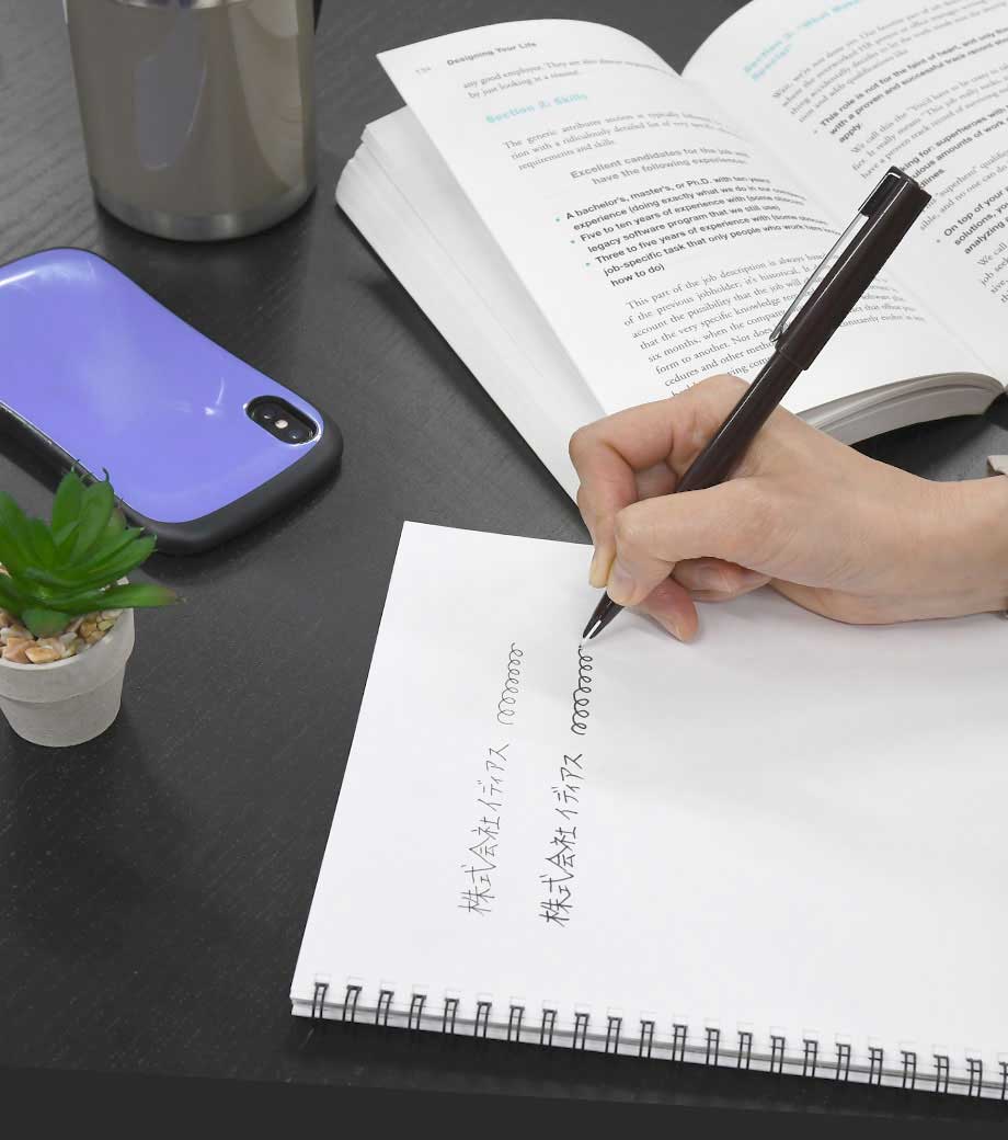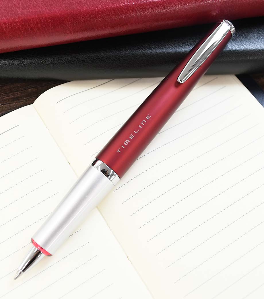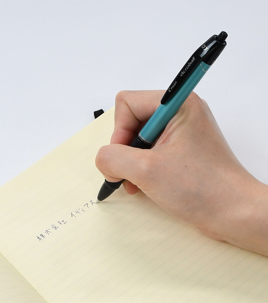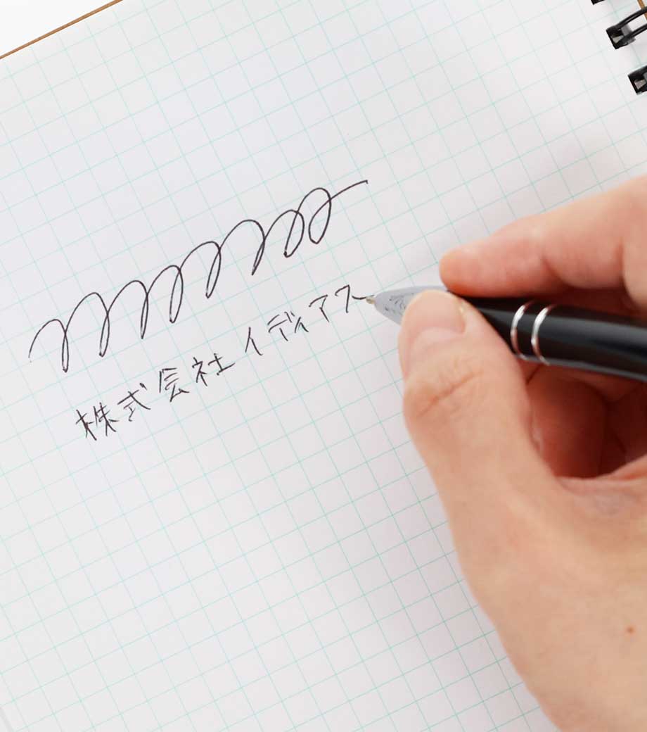 キャップスライド式で、キャップ部分を押すと芯が出ます。片手でさっと取り出してスマートに書き始められますよ。程よい重さのボディは、長時間の会議や商談にも適しています。低粘度高発色の「アクロインキ」搭載で書き出しからなめらか。長く愛用したくなる1品です。