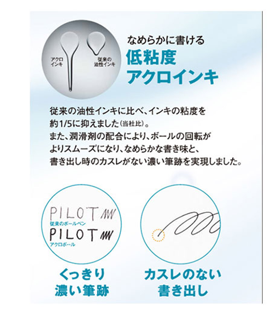 パイロット アクロ1000(0.7細字)は、なめらかな筆記と濃い筆跡のアクロインキ搭載。スムーズな書き心地で書類などにくっきり書けるペン先0.7mmです。スリムボディながら先端を太くし、握りやすい形状。アクセントの中央パーツからペン先までの切り替えがなく、スッと伸びたボディがかっこいい。ビジネスマンもスマートに使え、購入しやすい価格で人気です。