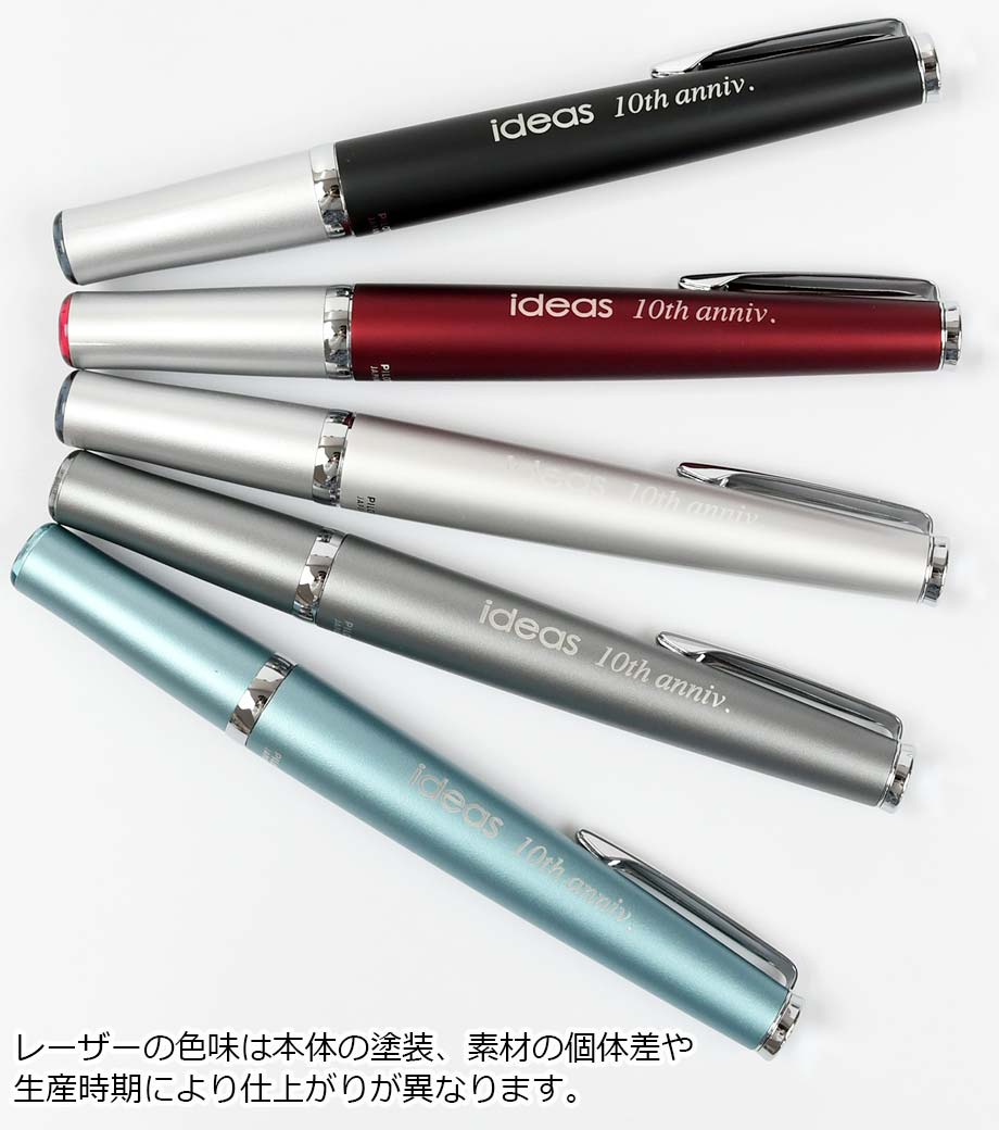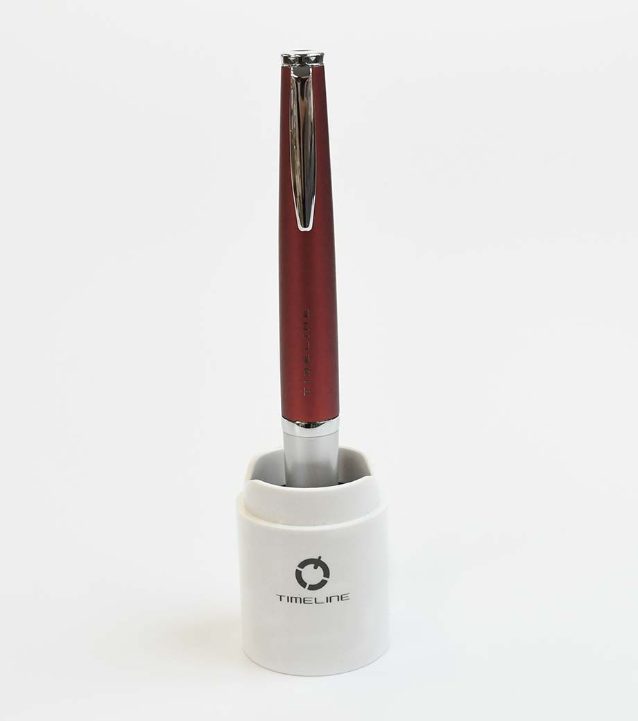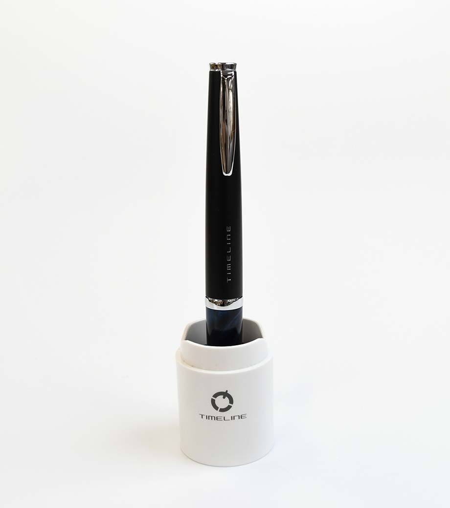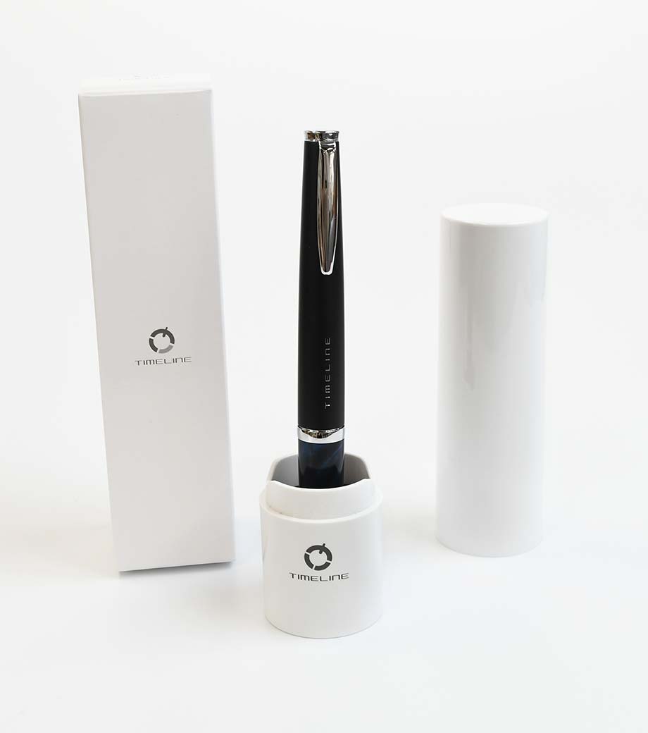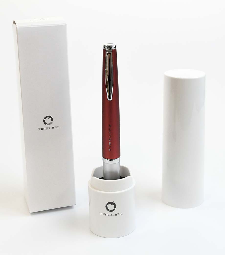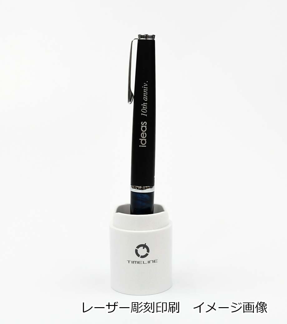 軸にレーザー彫刻でロゴや社名を名入れすれば更に高級感あふれる仕上がりになります。専用ケースはペンスタンドにもなり、そのまま飾れます。周年記念品やハイクラスなギフトにおすすめです。