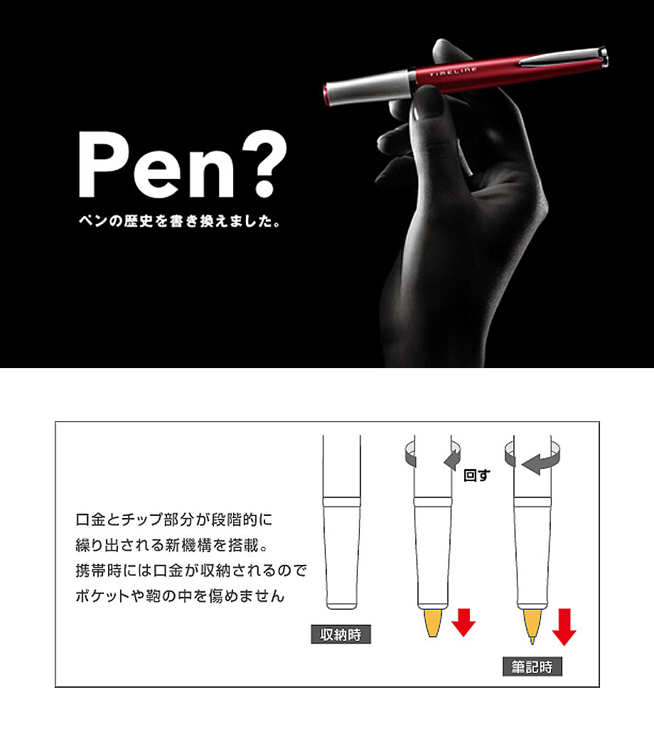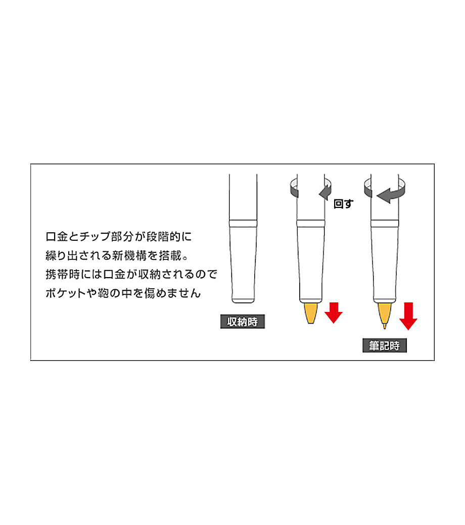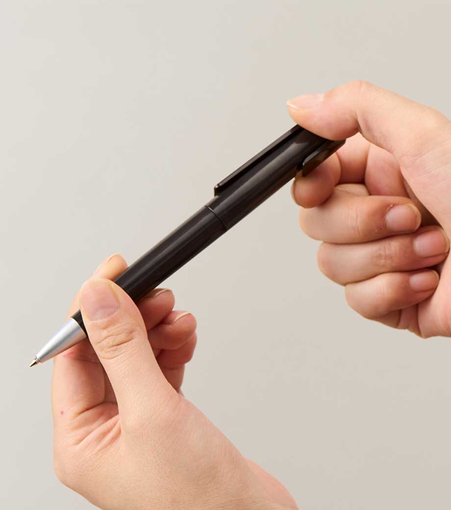 パイロット TIMELINE〈ETERNAL〉はペン先が段階的に現れるダブルアクション繰り出し式。ボディを一度回すと口金、更に回すとペン先が現れます。口金まで収納すると一見ペンには見えない独創的な形状に。ペン先が隠れるので鞄や持ち物に触れて汚してしまうことがありません。