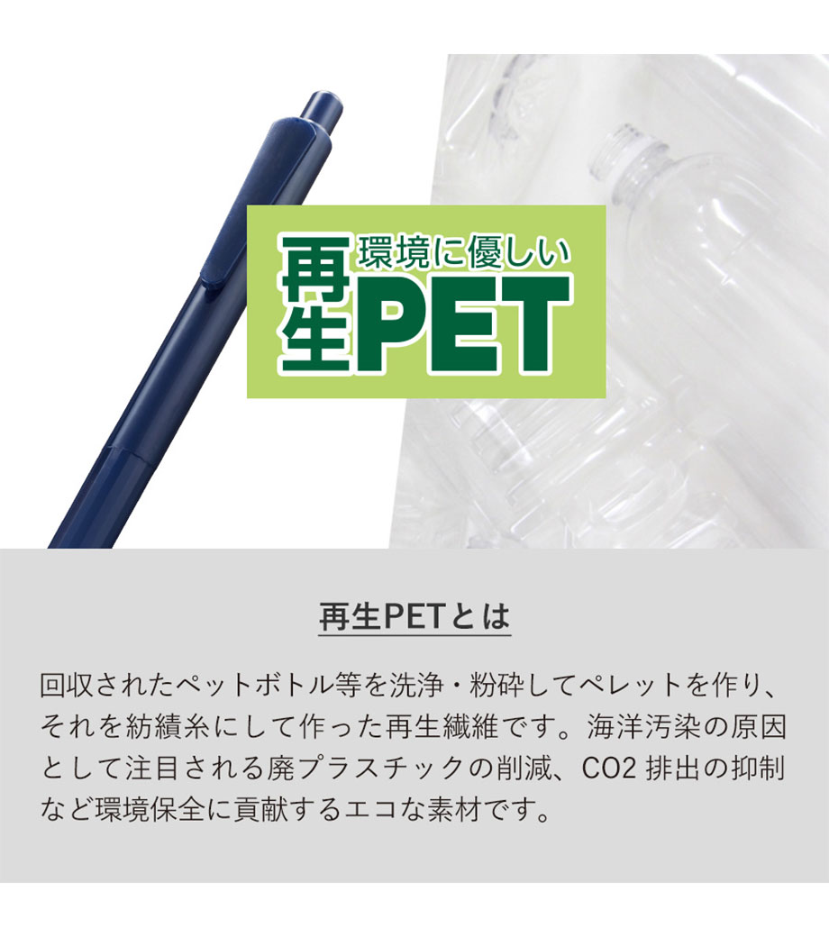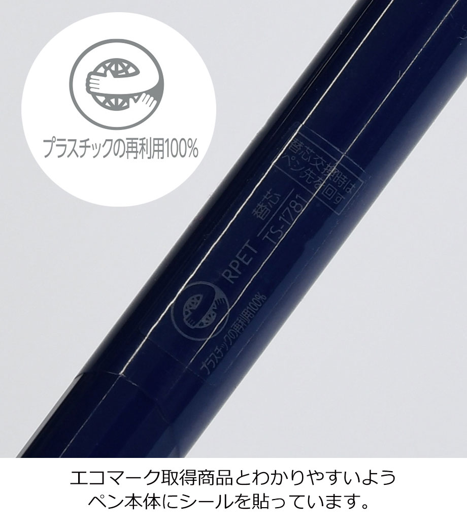 エコボールペン(再生PET)/名入れ専用は再生PET素材のエコマーク付きボールペン。回収されたペットボトル等を洗浄・粉砕してペレットを作り成型しました。SDGsの取組を実現できる環境に配慮したリサイクル商品は、企業セミナーでの配布など様々なシーンでご利用いただけます。ペン先は使いやすい0.7mmです。