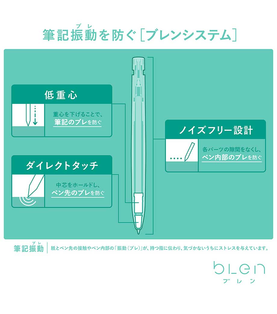 ゼブラ ブレン 0.7mmは振動(ブレ)がないボールペン。ゼブラ独自の筆記振動(ブレ)を制御した「ブレンシステム」を搭載。ペン先まで覆ったラバーが更に指先に馴染み、長時間の筆記も楽々ストレスフリーな書き心地です。太めのリフィルでたっぷりインク。コスパも良くしっかり濃く書けるブレンは、きっとお気に入りの1本になります。ペン先0.7mmは書類や郵便物のあて名書きなどに適しており、オフィスで使いやすい太さです。
